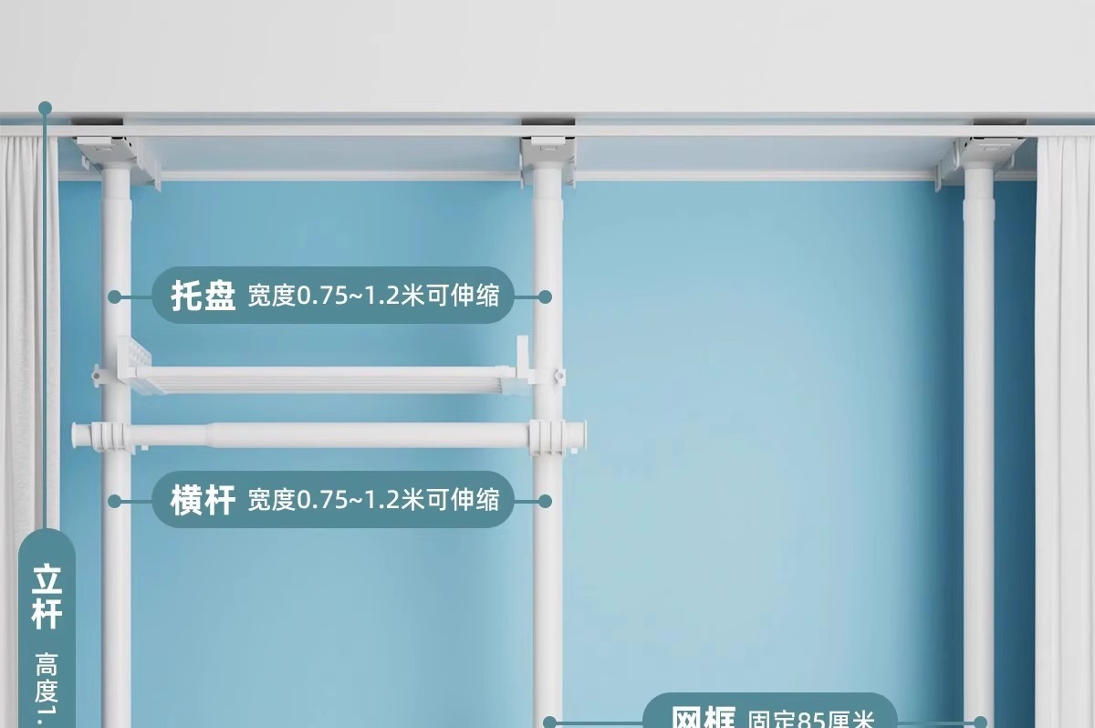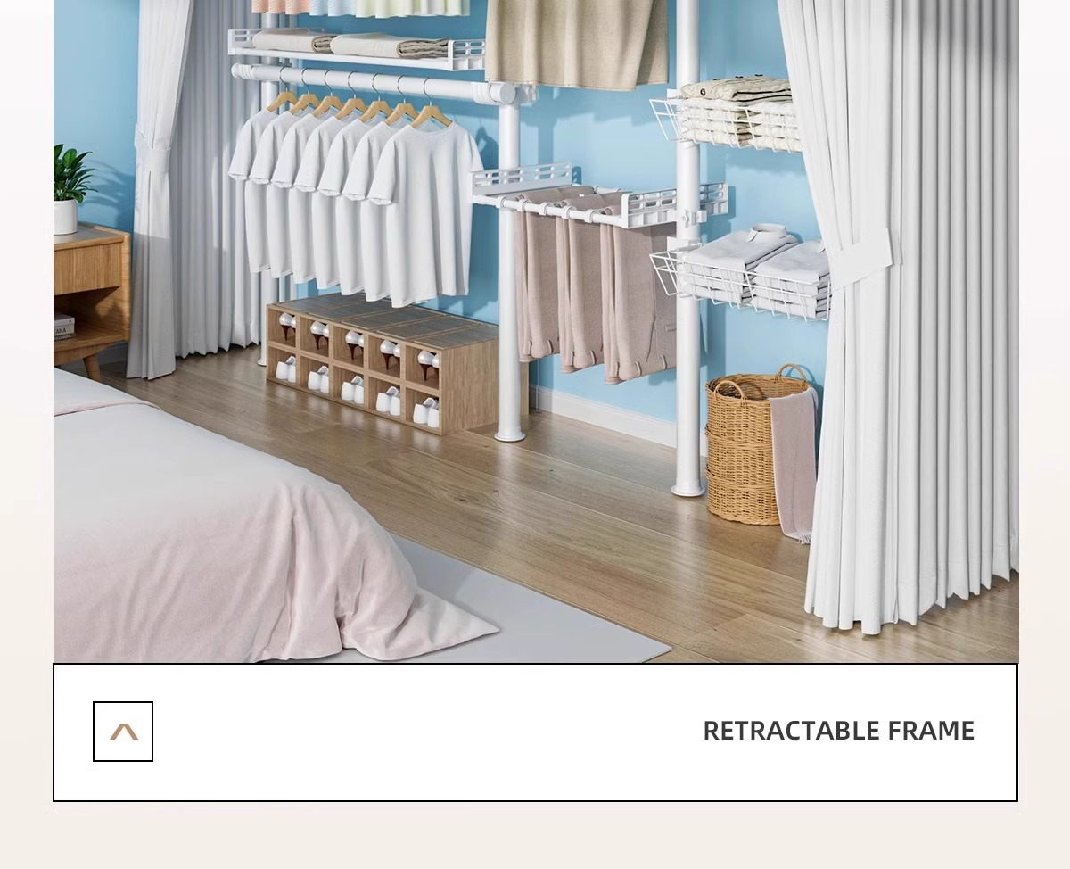• 세로 4개, 가로 2개, 트레이 4개, 바지걸이 1개, 흰색 커튼이 있는 메쉬 프레임 3개
