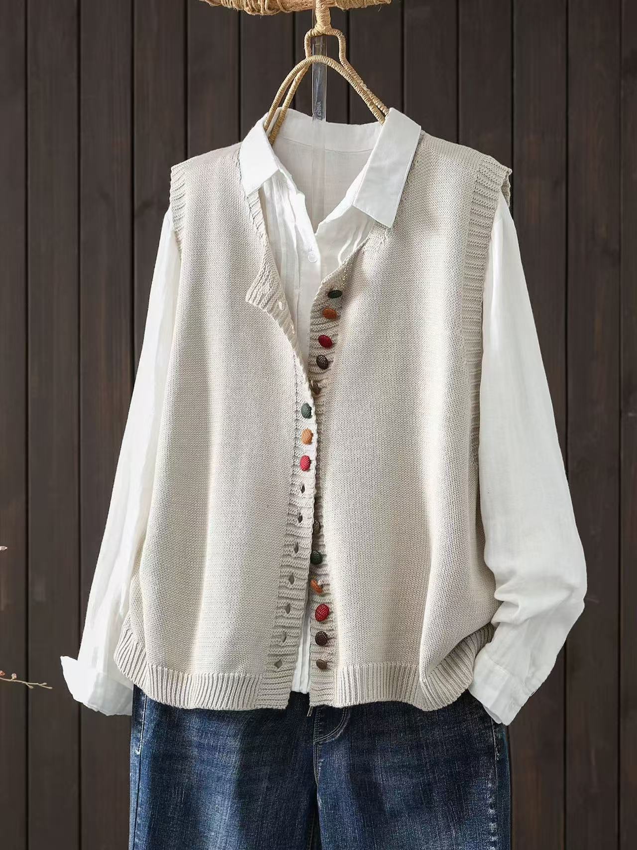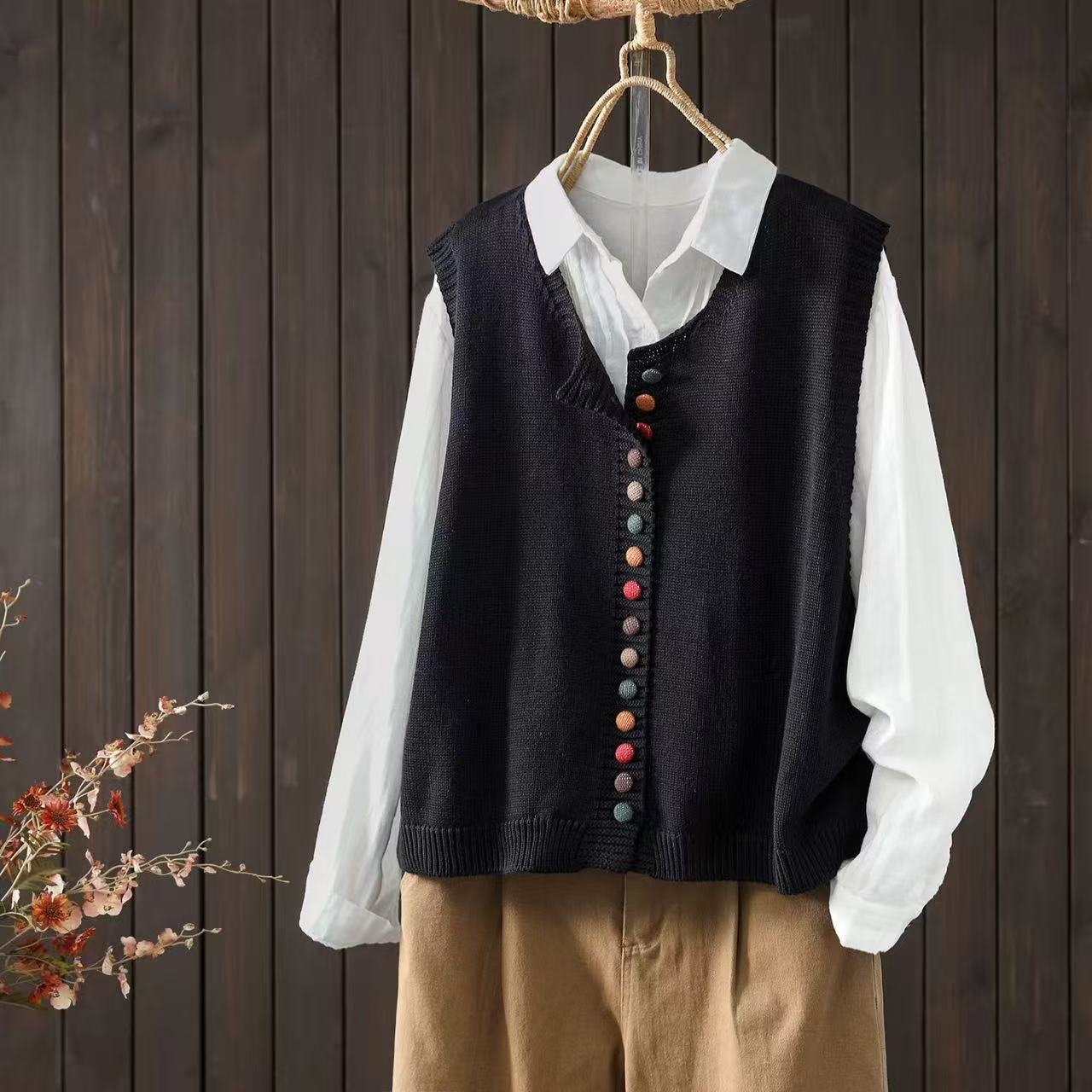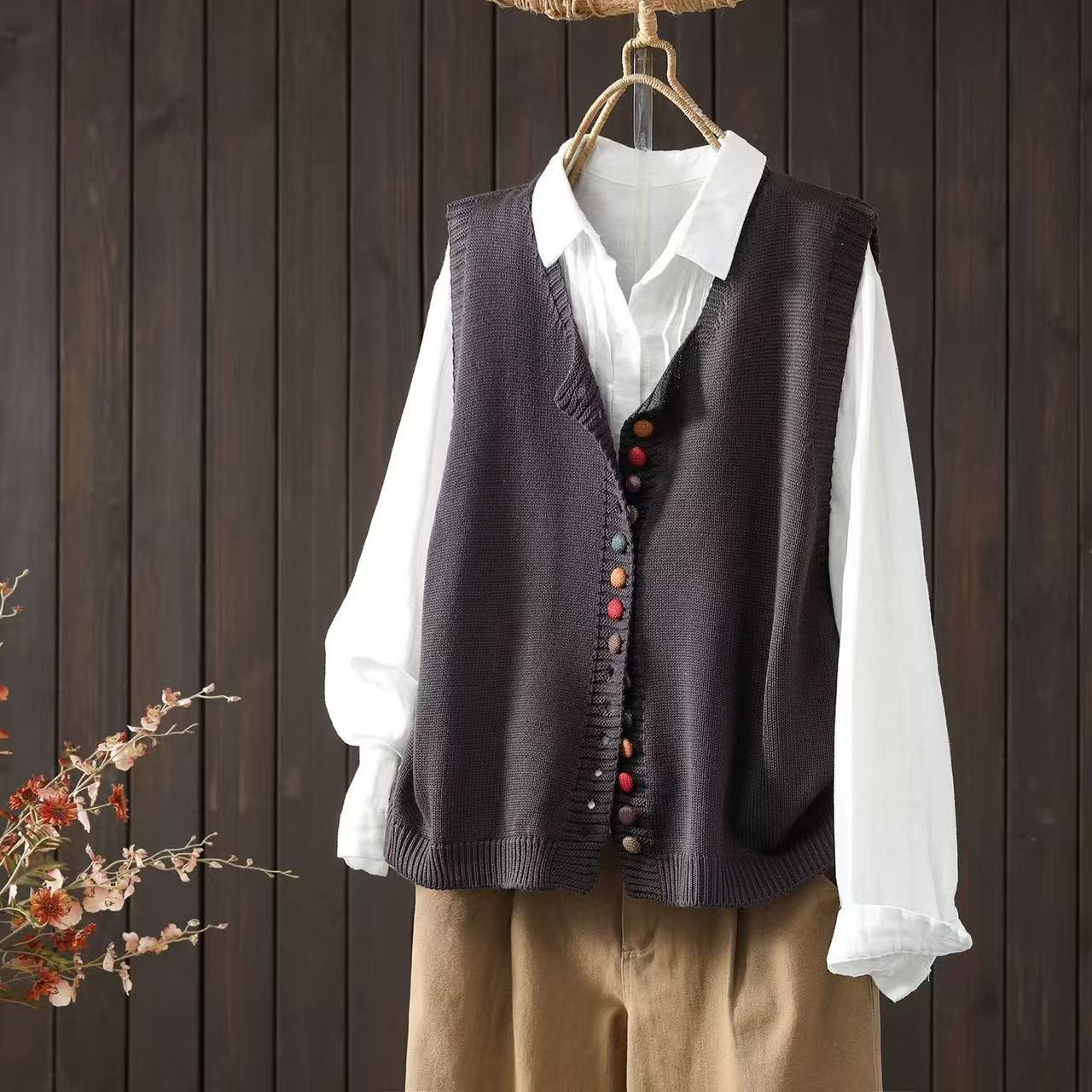 화려한 버튼 코튼 니트 조끼 여성의 느슨한 슬리밍 가을 예술적 캐주얼 스택 민소매 조끼