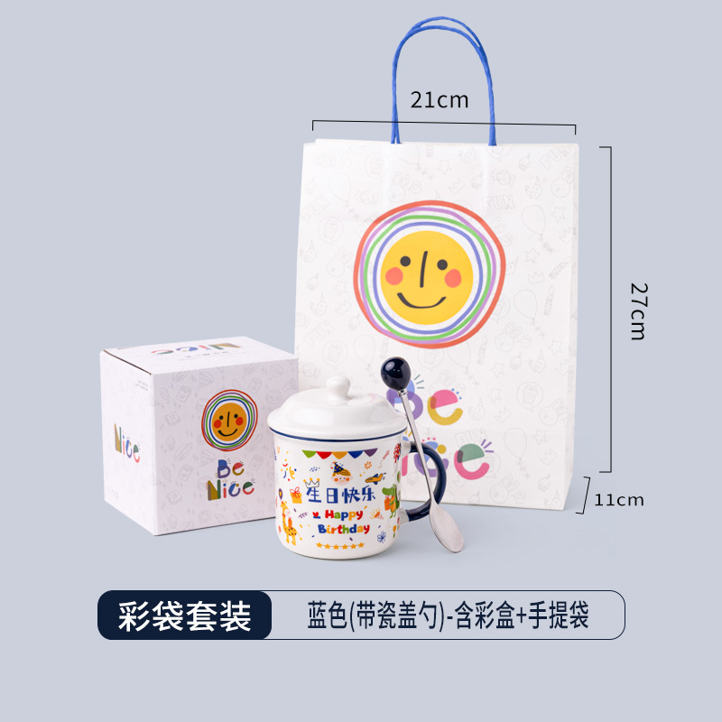 • 생일 축하합니다(실리콘 뚜껑과 스푼이 있는 모조 에나멜 컵 블루) + 컬러 박스 + 투명 핸드백