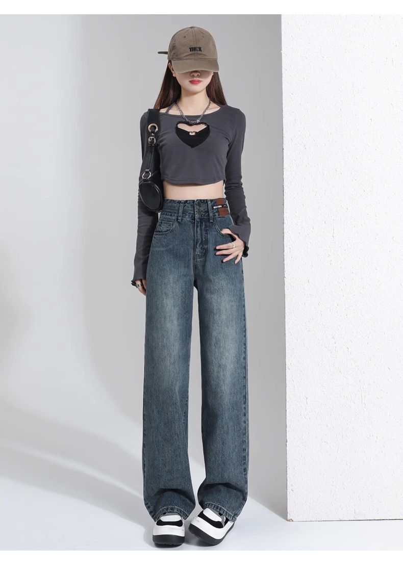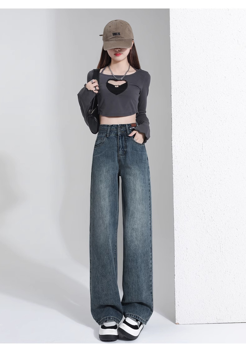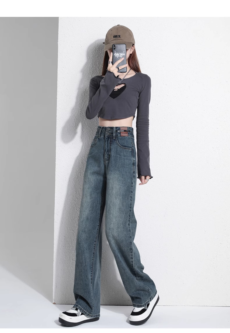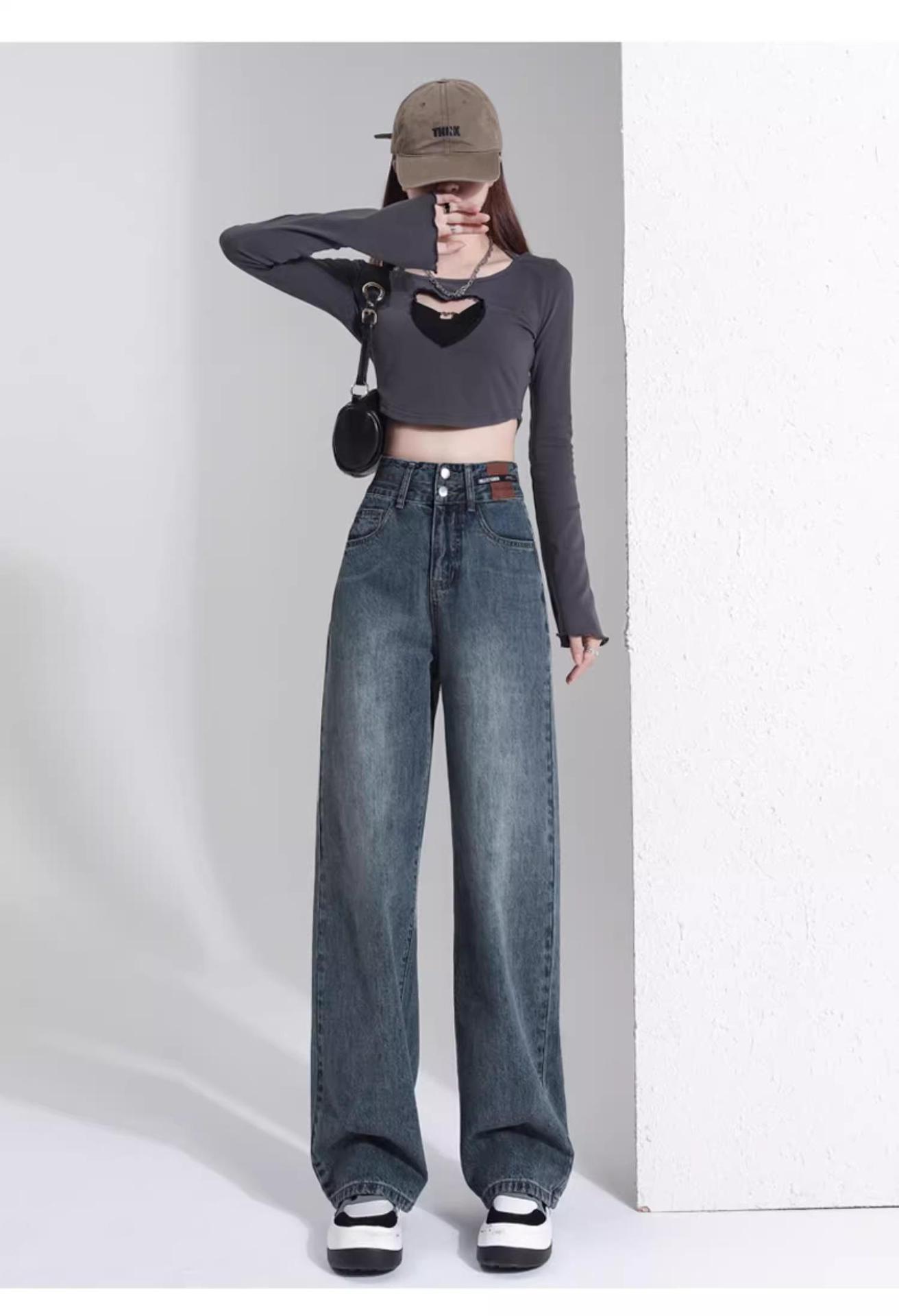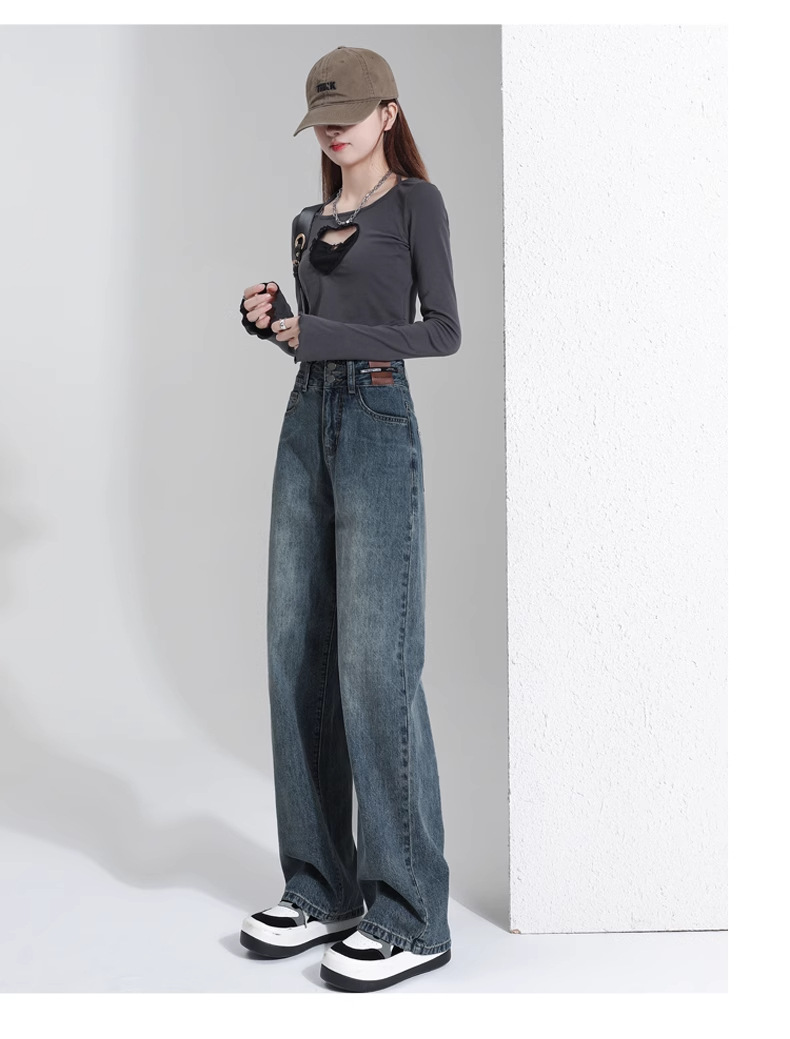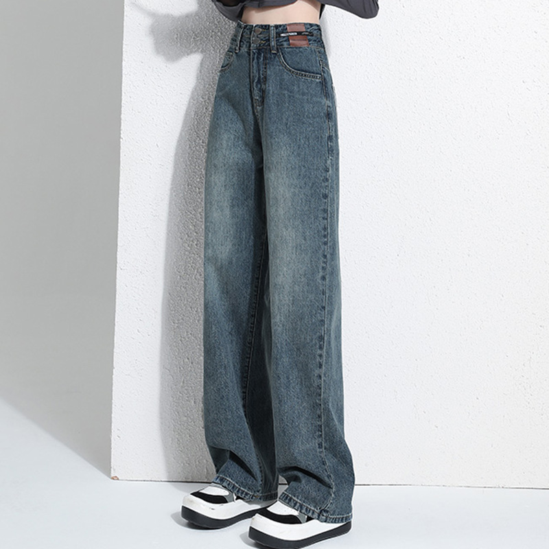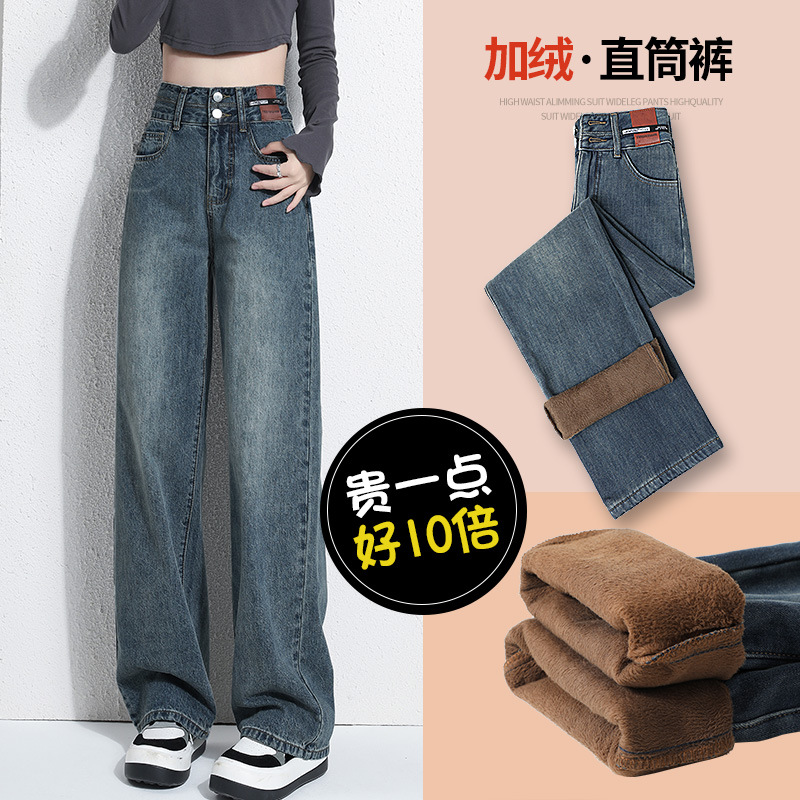빈티지 더블 브레스트 기모 하이 웨이스트 와이드 레그 청바지 여성의 가을과 겨울 2024 유행 새로운 올 매치 스트레이트 바지스토어 가기