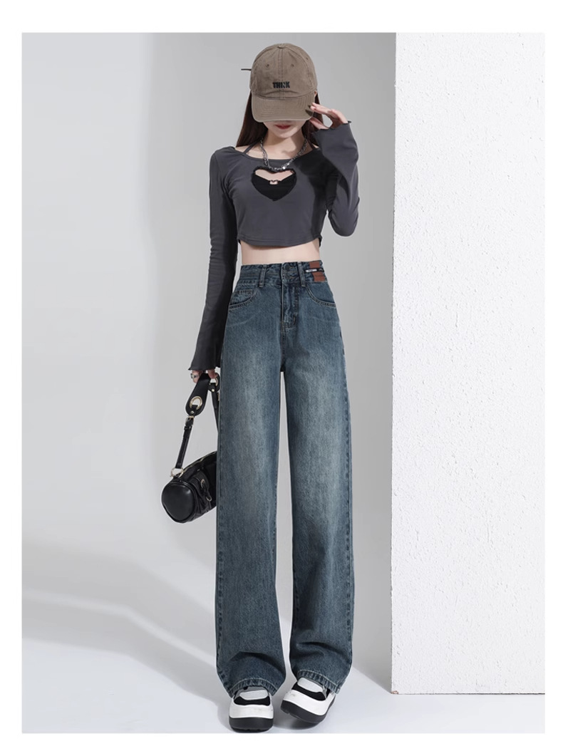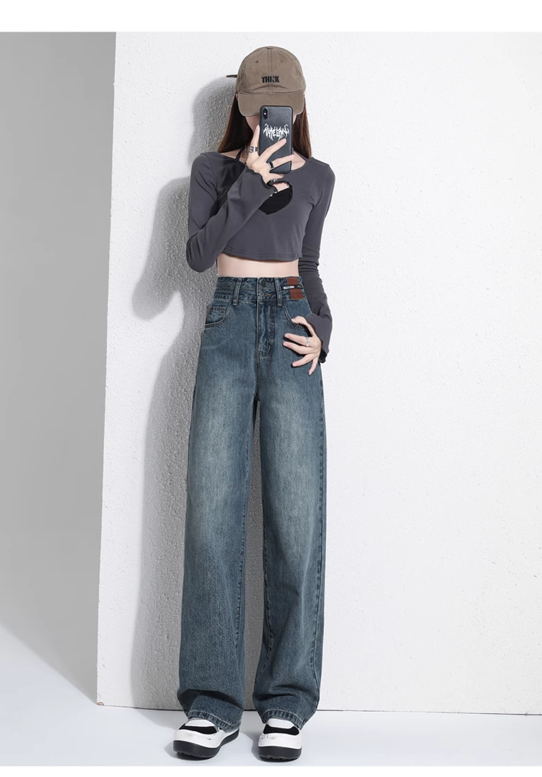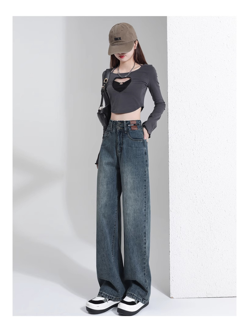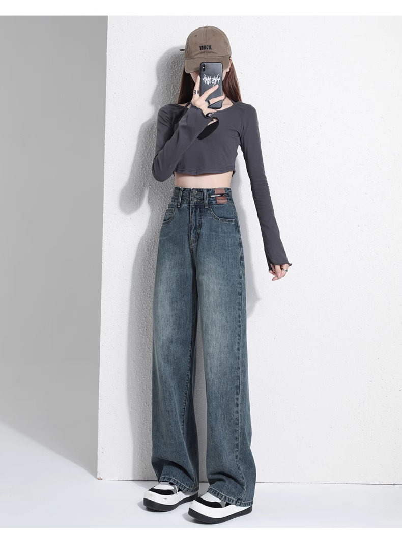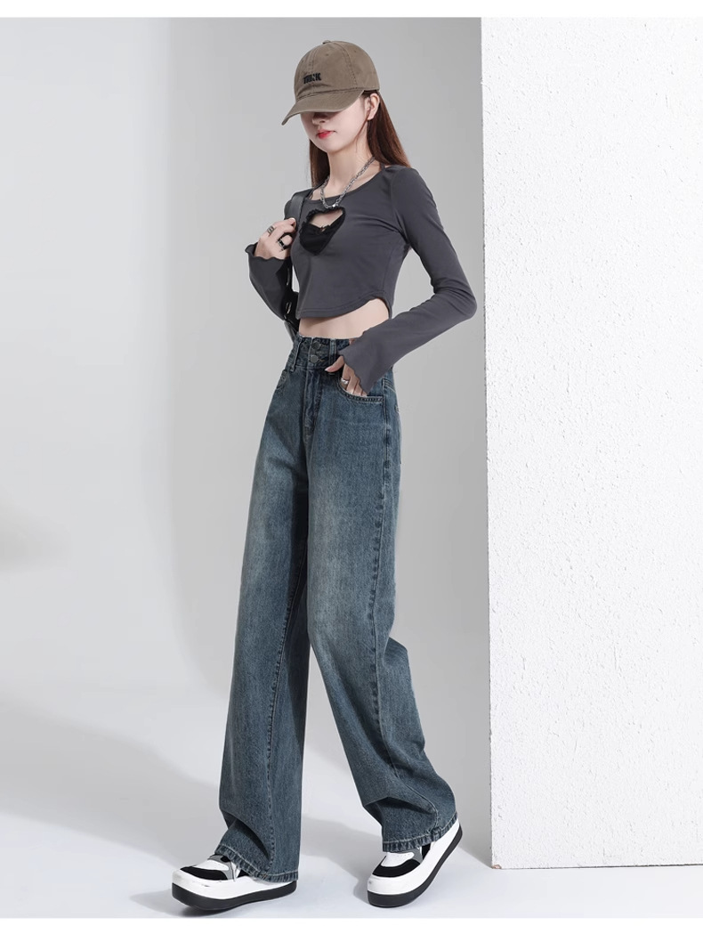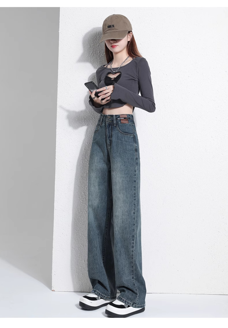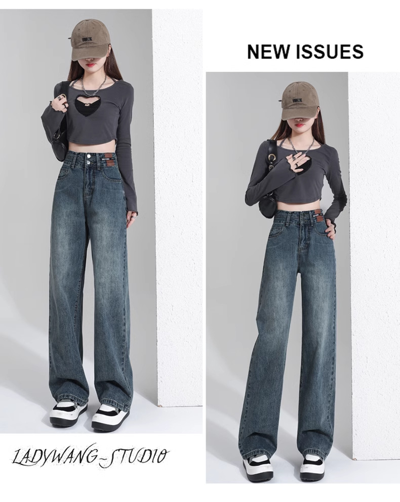 빈티지 더블 브레스트 기모 하이 웨이스트 와이드 레그 청바지 여성의 가을과 겨울 2024 유행 새로운 올 매치 스트레이트 바지스토어 가기