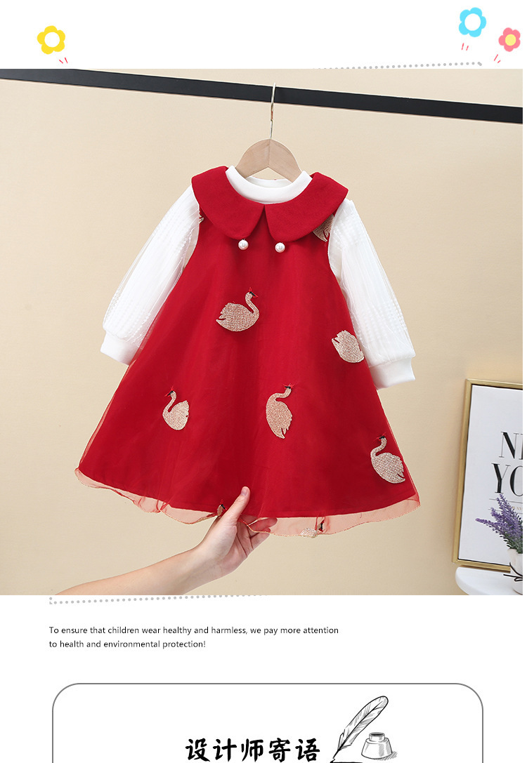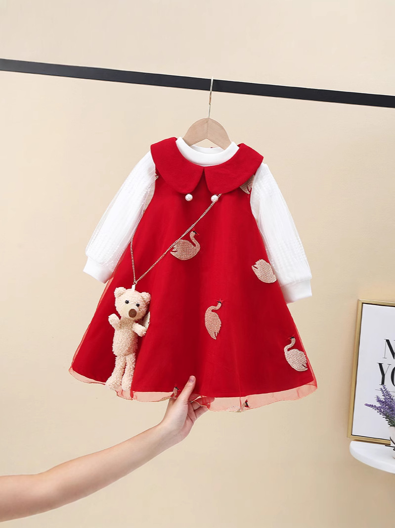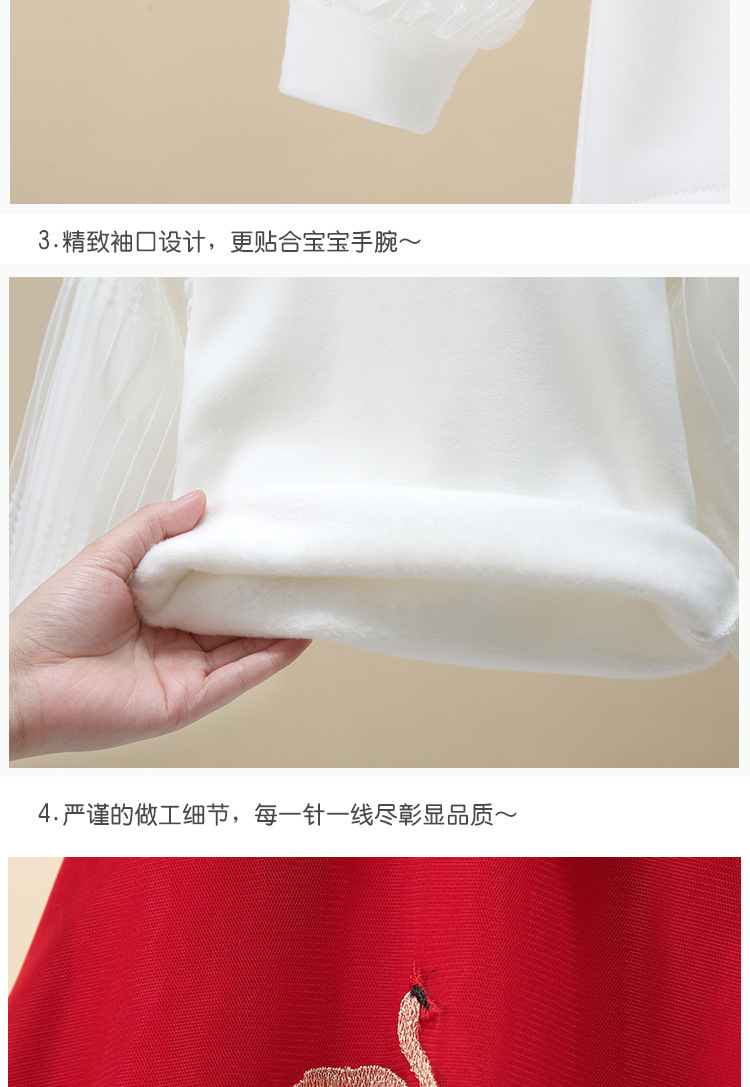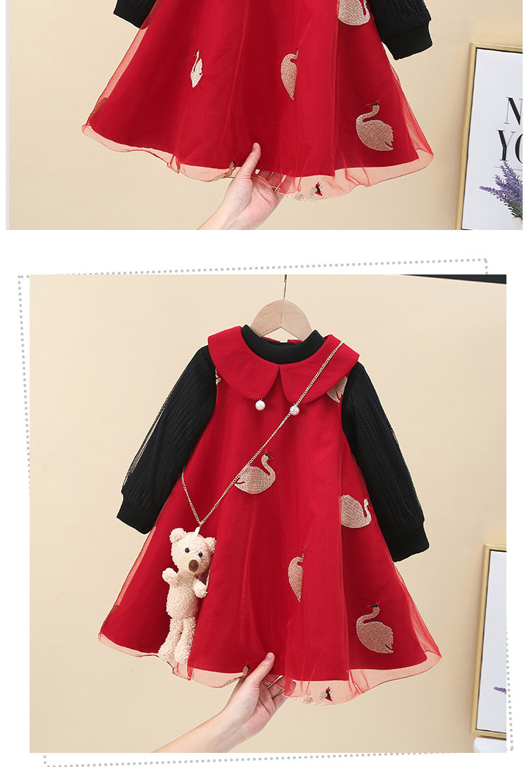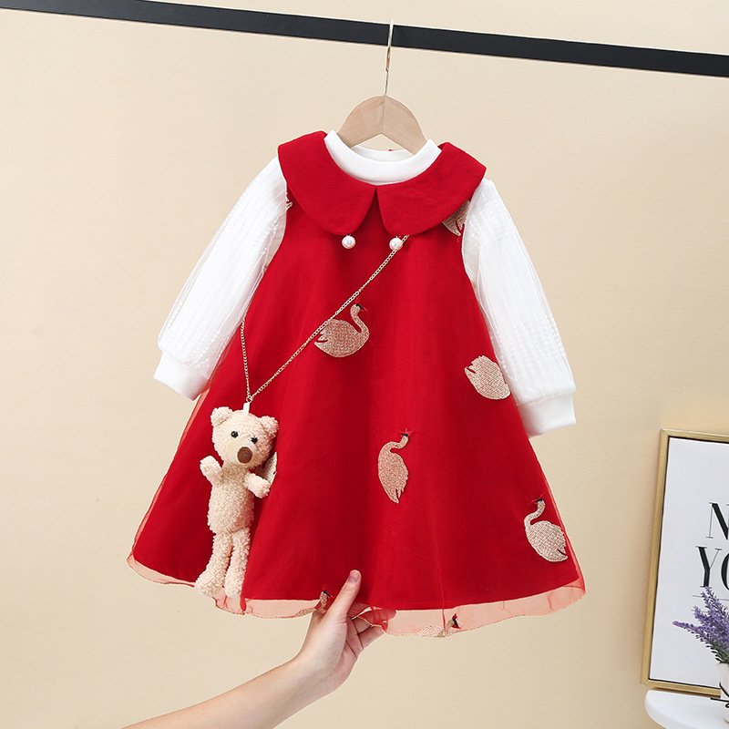소녀 원피스 2024 새로운 작은 곰 인형 작은 중년 어린이 빨간 기모 양모 조끼 메쉬 원피스 트렌디스토어 가기