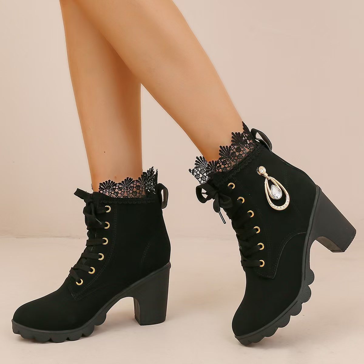 국경 간 가을과 겨울 새로운 라운드 헤드 두꺼운 힐 레이스 패션 부츠 라인스톤 펜던트 하이힐 플러스 사이즈 스웨이드 여성용 부츠스토어 가기