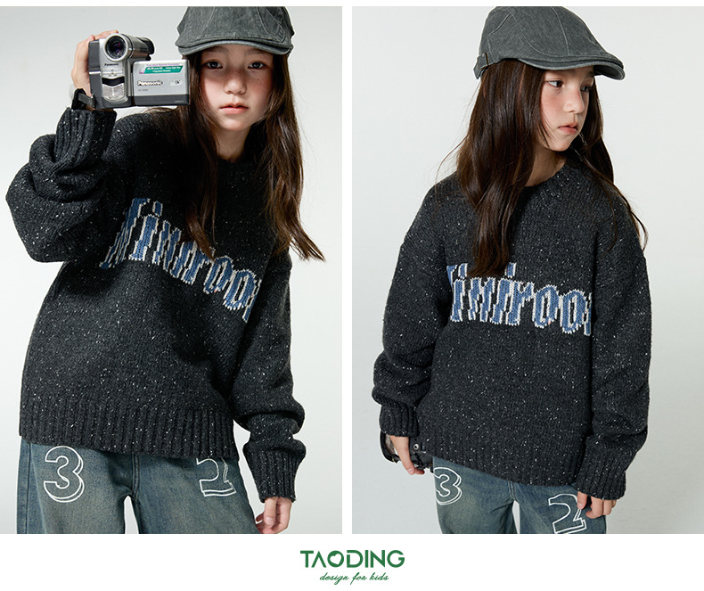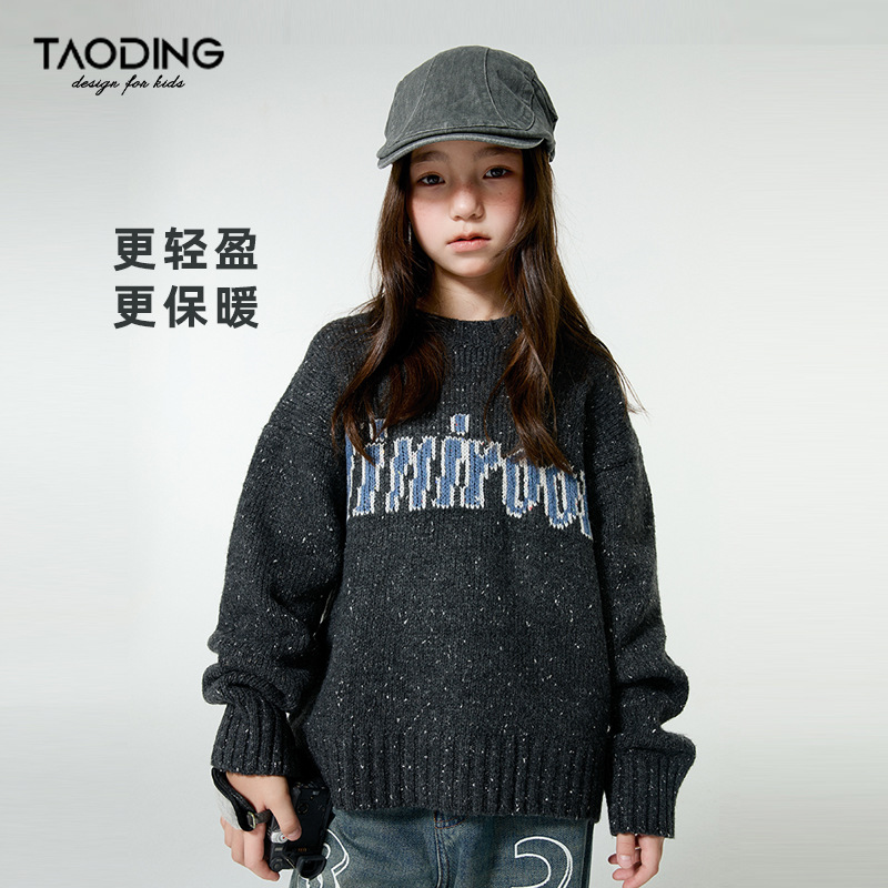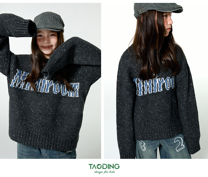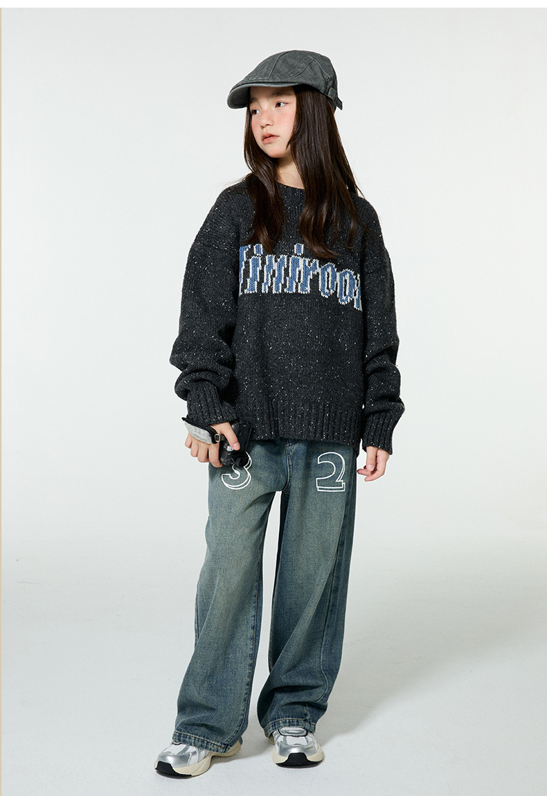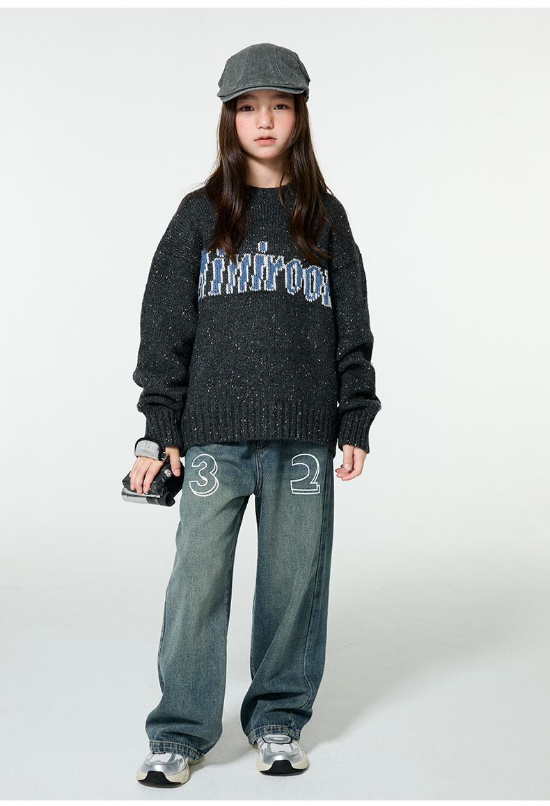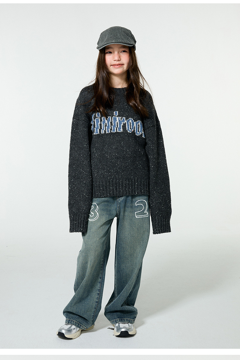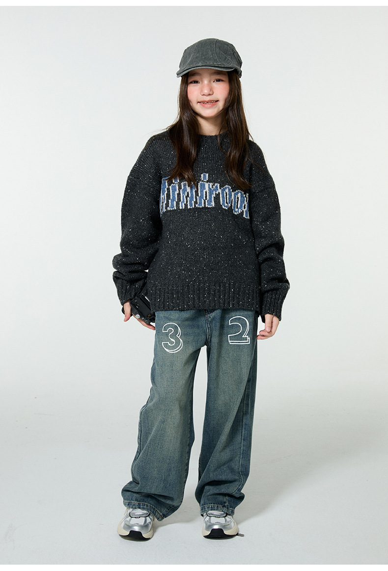 Amoy 소녀 가을과 겨울 새로운 미국 복고풍 자카드 편지 스웨터 큰 아이들을위한 따뜻한 울 스웨터