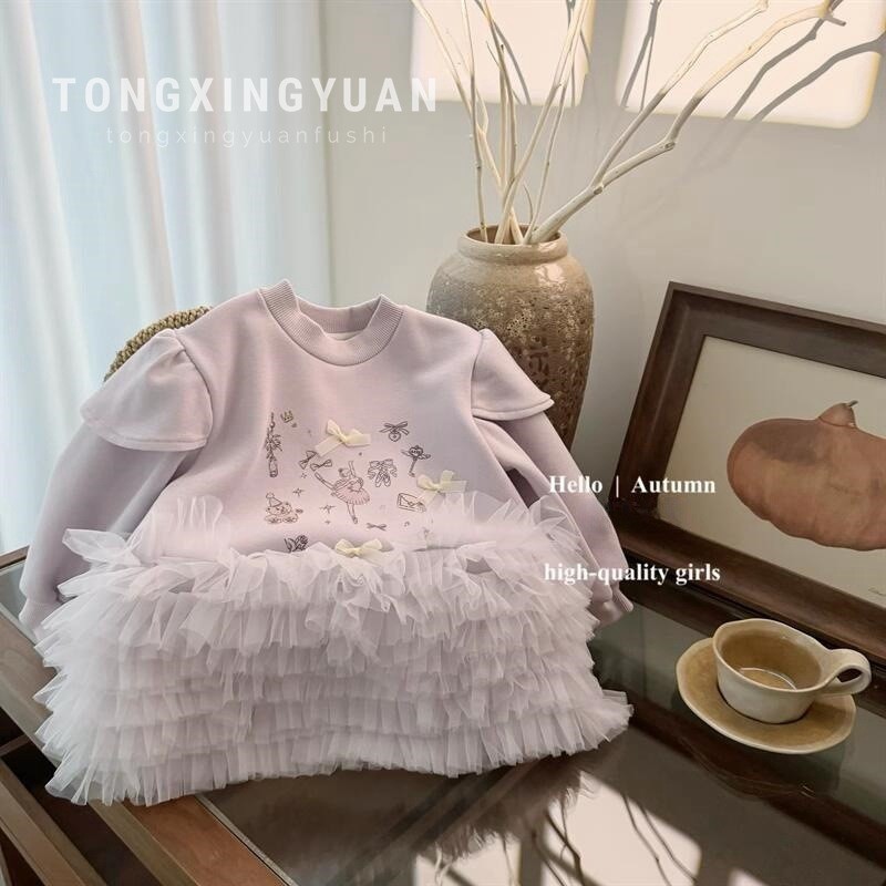 Tongxingyuan 한국 소녀 기모 가을과 겨울 아기 소녀 달콤한 편지 인쇄 긴 소매 스티칭 메쉬 땀 스커트스토어 가기