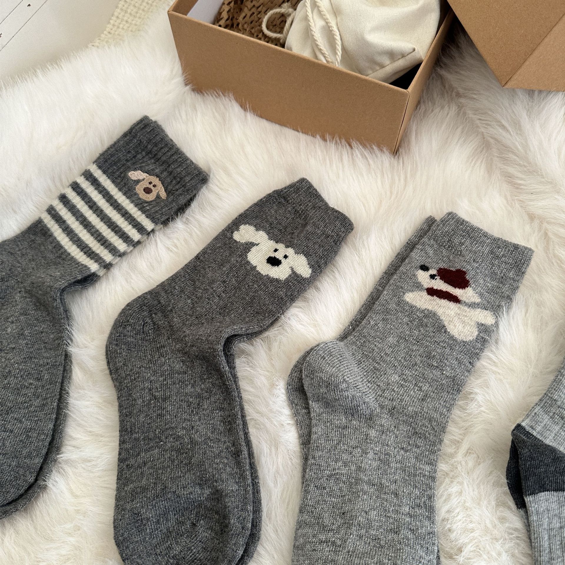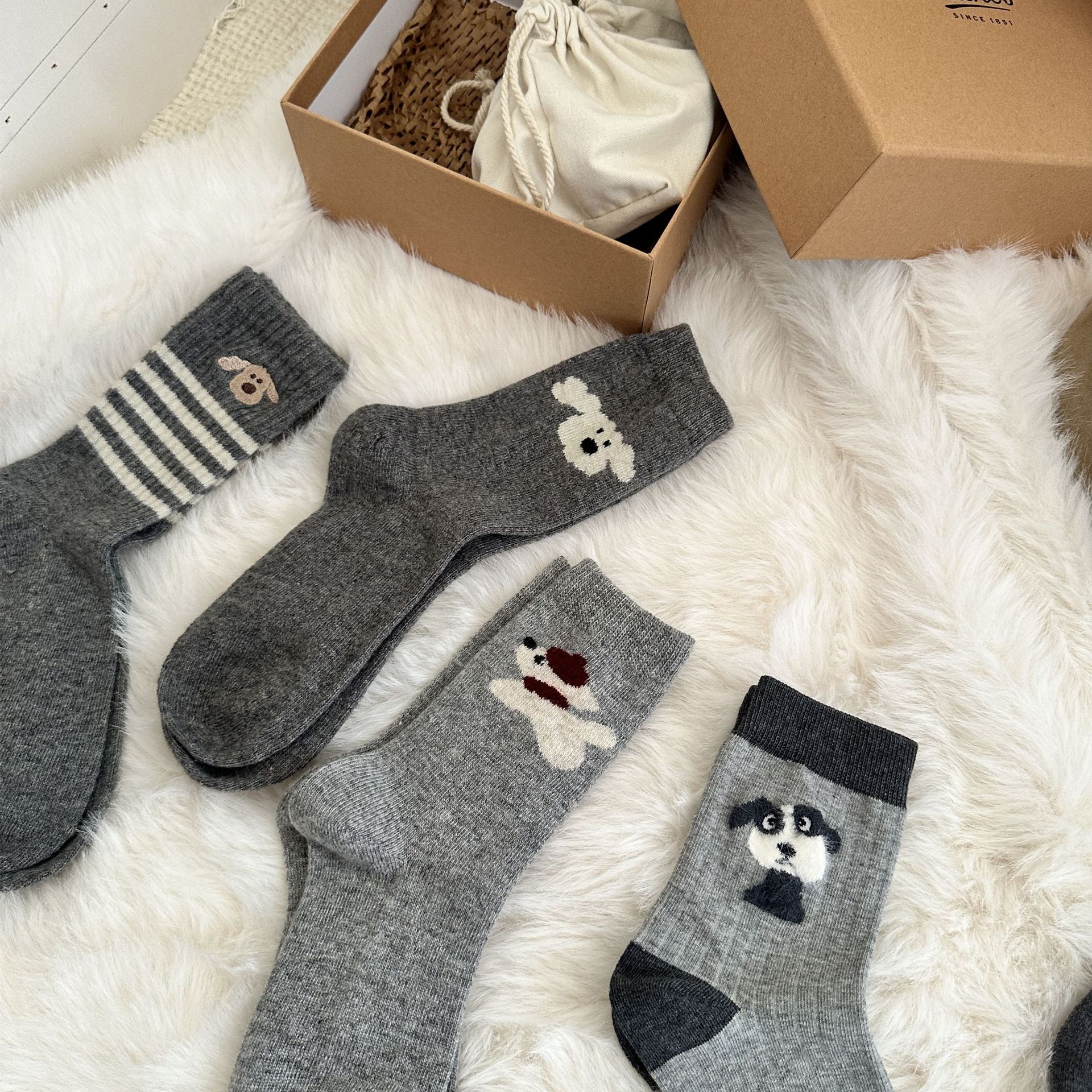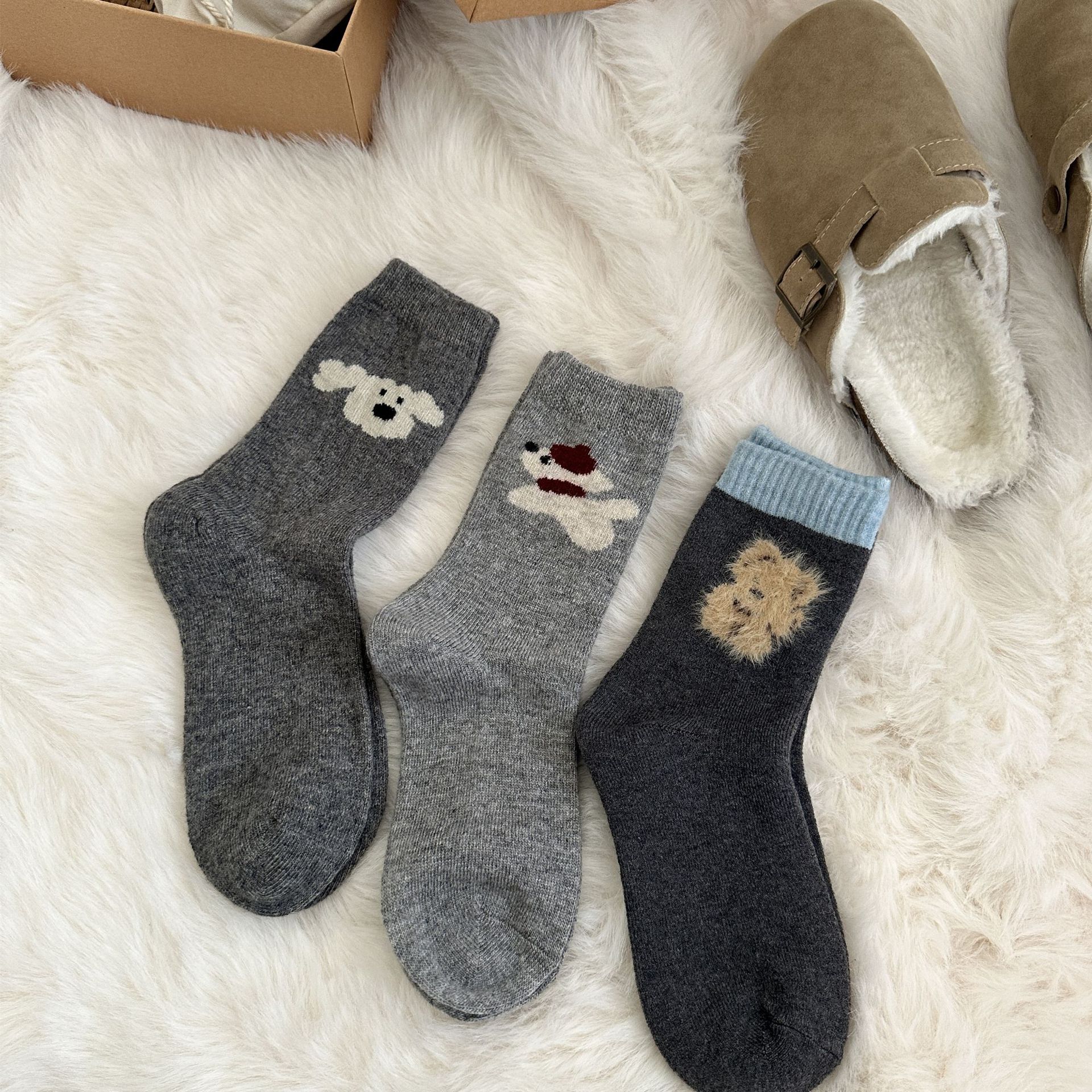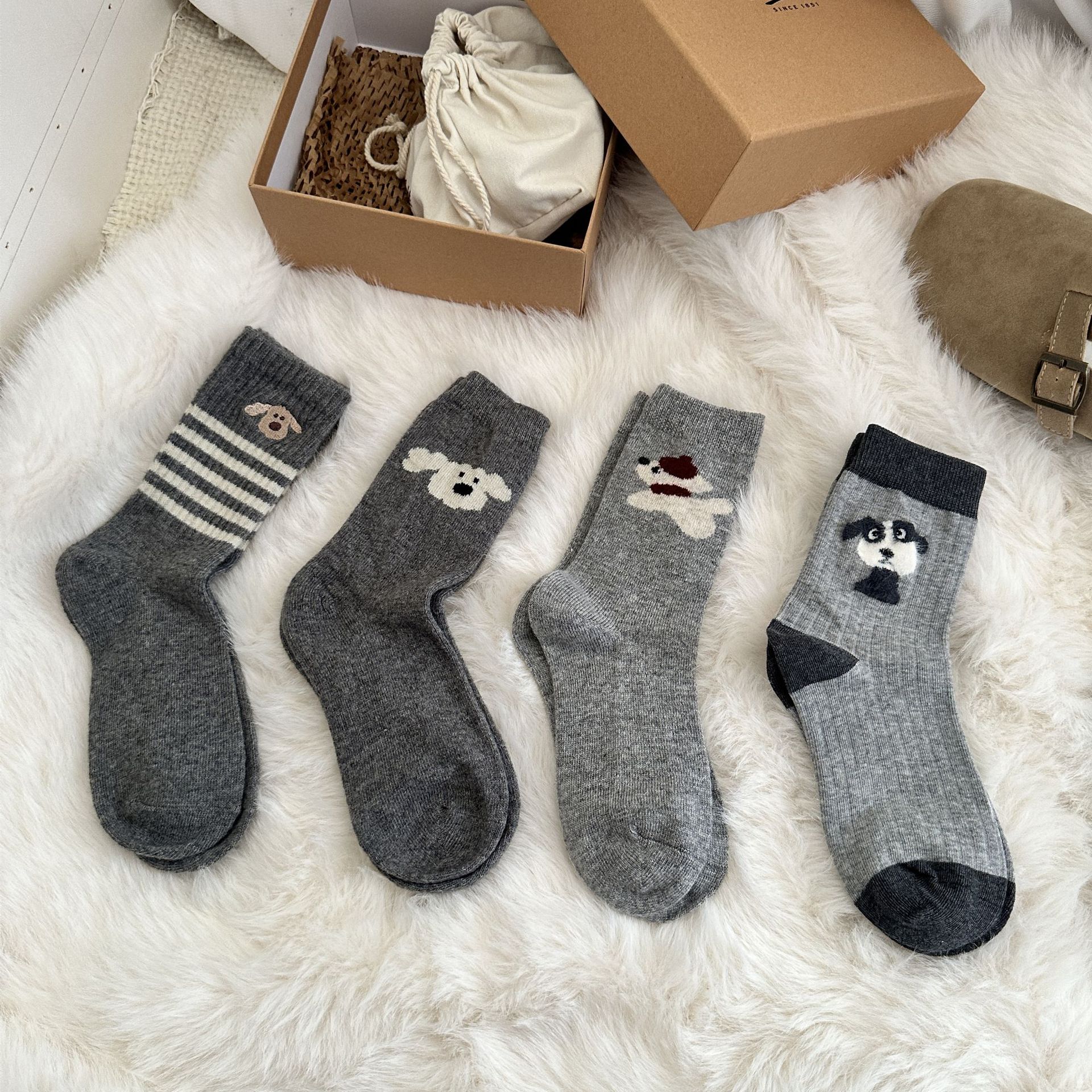 어린이를위한 만화 강아지 울 양말 한국 스타일 Instagram 스타일 유행 귀여운 중간 길이 양말 두꺼운 따뜻한 캐시미어 스택 양말스토어 가기