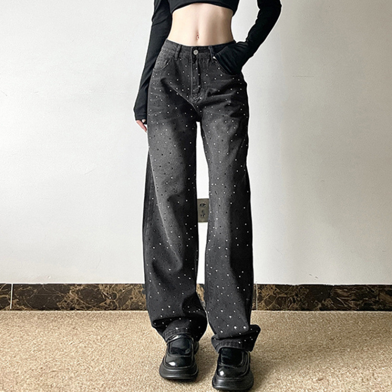 유럽과 미국의 디자인 센스 핫 드릴링 워시 청바지 낮은 허리 느슨한 슬리밍 기본 올 매치 스트레이트 다리 바지