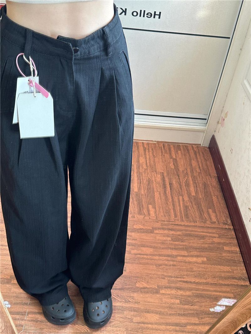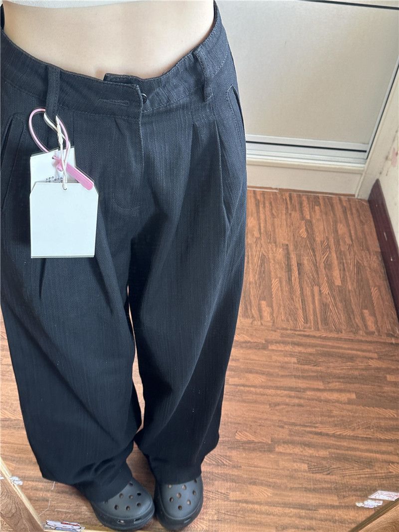 작은 검은 색 높은 허리 주름 넓은 다리 청바지 여성의 가을 새로운 디자인 느슨한 슬리밍 스트레이트 바지스토어 가기