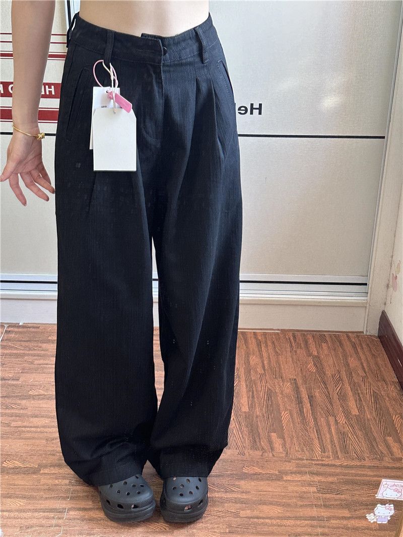 작은 검은 색 높은 허리 주름 넓은 다리 청바지 여성의 가을 새로운 디자인 느슨한 슬리밍 스트레이트 바지