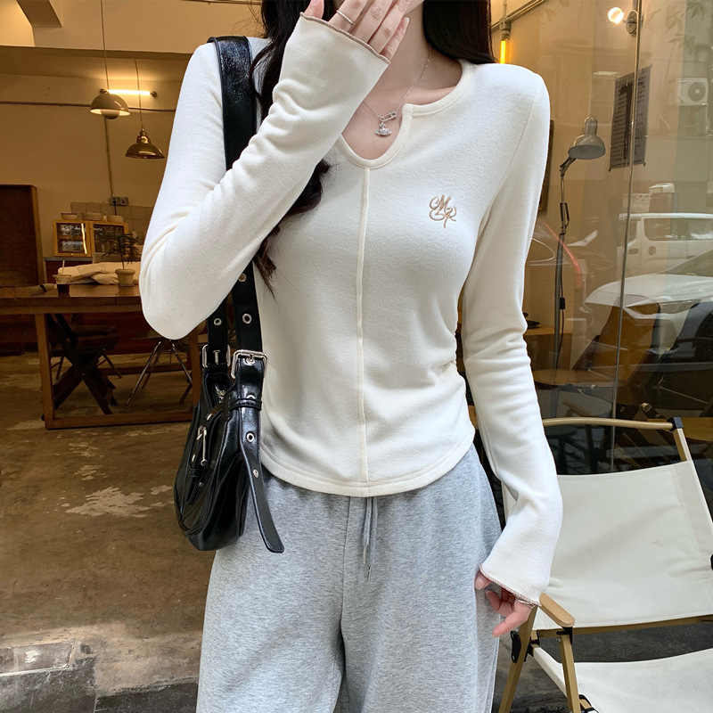 V领刺绣长袖t恤女打底衫2024年秋装新款收腰显瘦辣妹短款内搭上衣