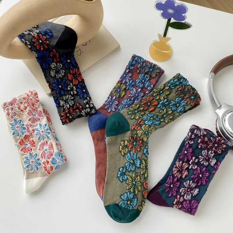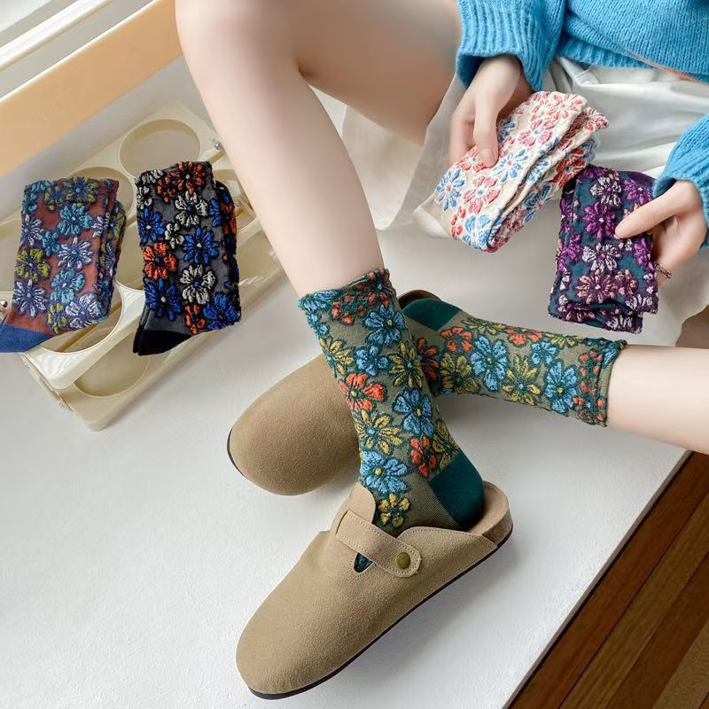 여성용 양말 유럽 궁전 스타일 꽃무늬 여성 양말 개성 있는 레트로 대형 꽃무늬 중간 길이 양말 달콤한 문학적 스타일 면 양말 트렌디스토어 가기
