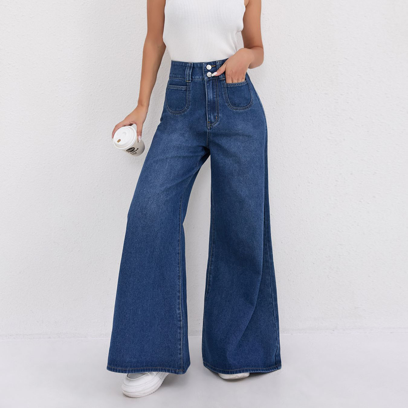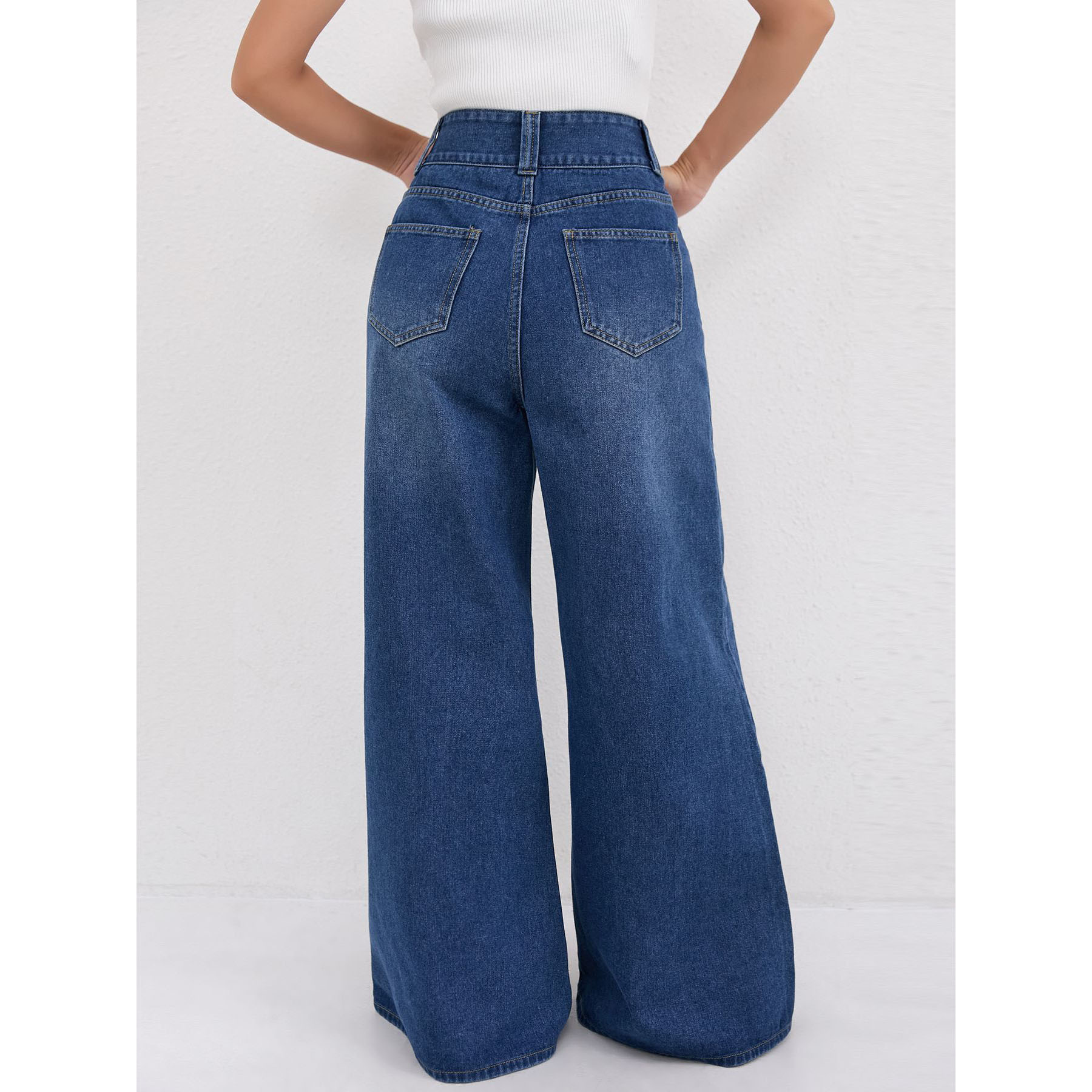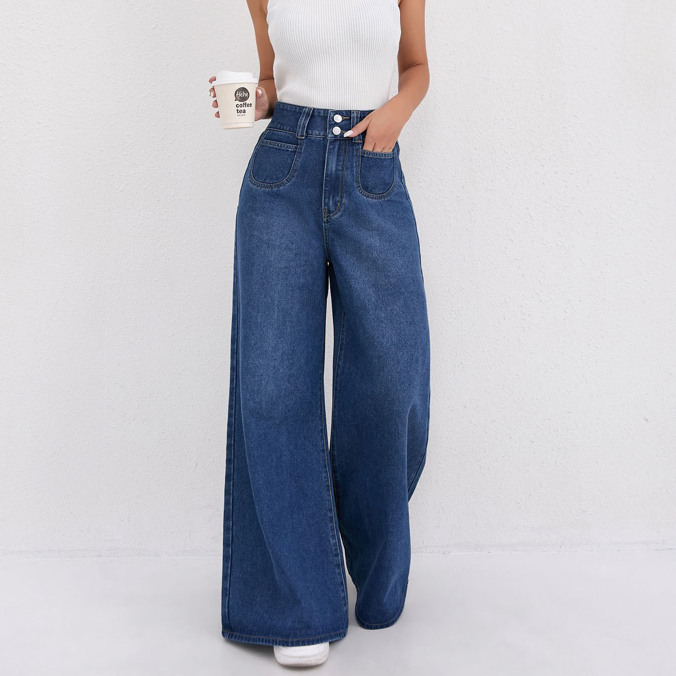 TEMU 국경 간 폭발 높은 허리 다크 블루 넓은 다리 덤핑 청바지 여성의 느슨한 슬리밍 큰 뿔 바지 여성 트렌디스토어 가기