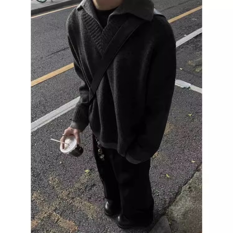 미국식 레트로 페이크 투피스 V 넥 스웨터 남자 겨울 폴로 탑 디자인 느슨한 게으른 스타일 스웨터