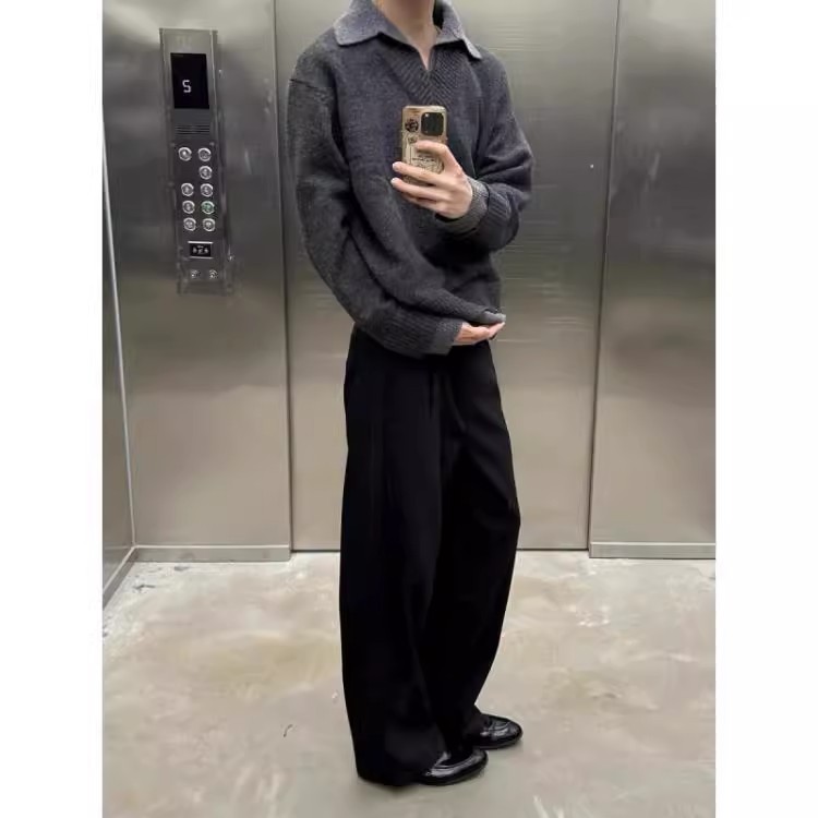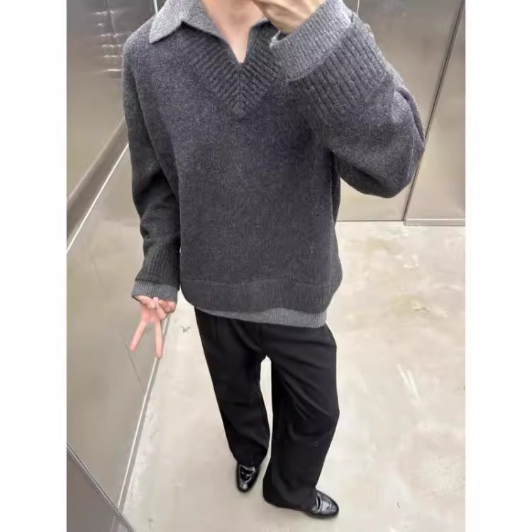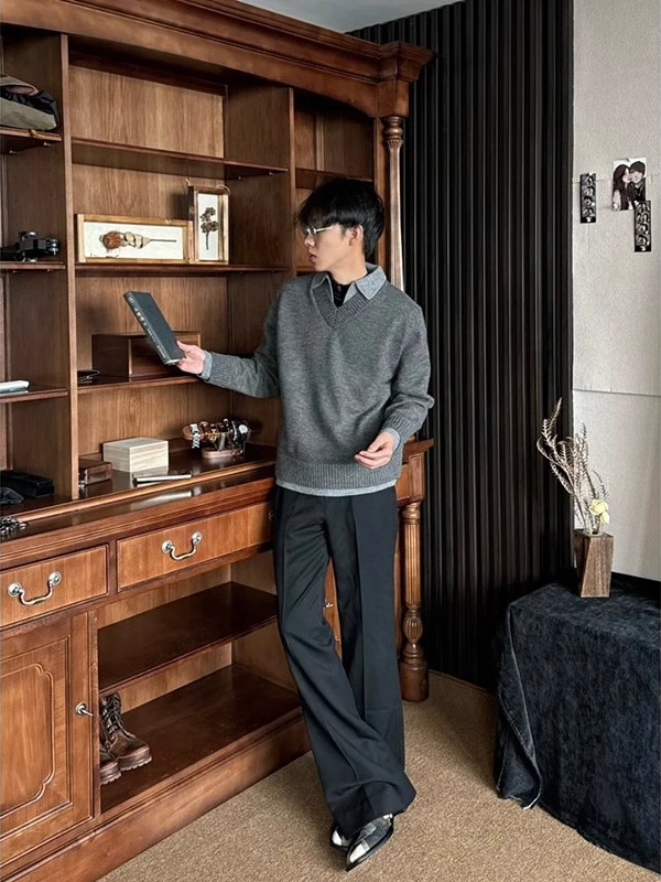 미국식 레트로 페이크 투피스 V 넥 스웨터 남자 겨울 폴로 탑 디자인 느슨한 게으른 스타일 스웨터스토어 가기
