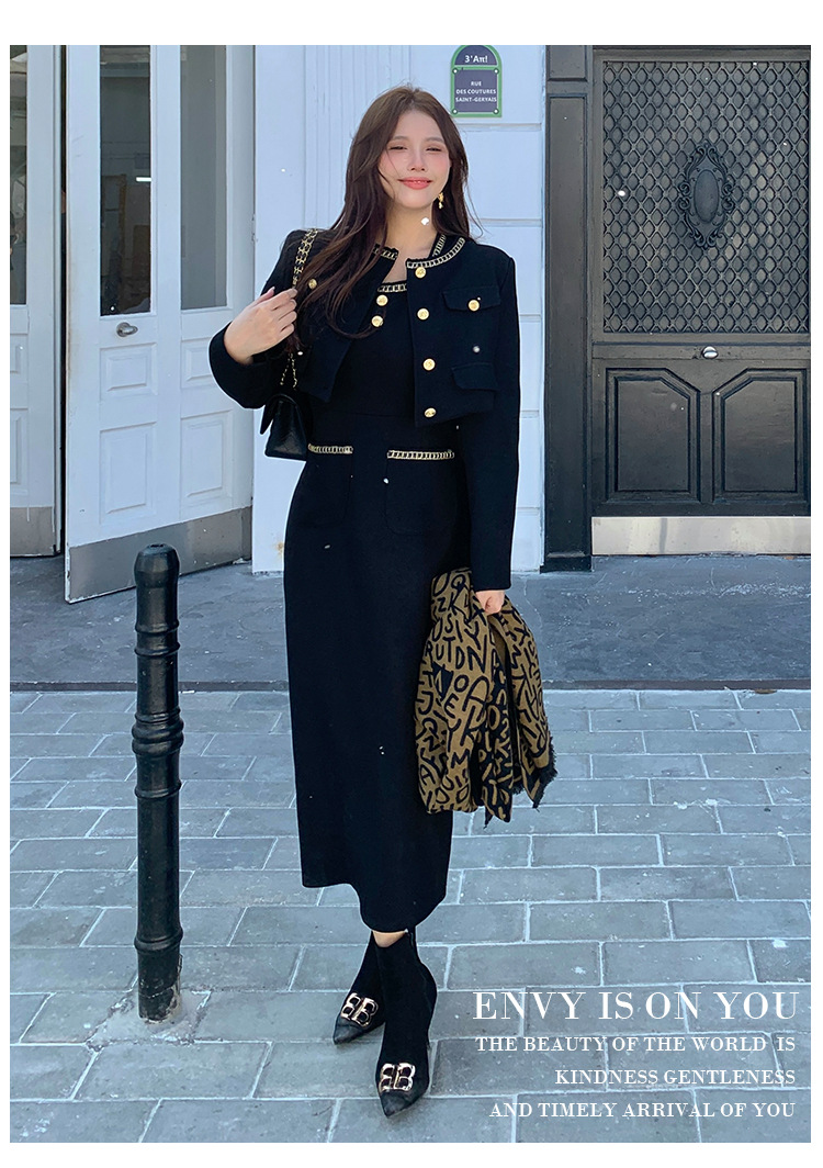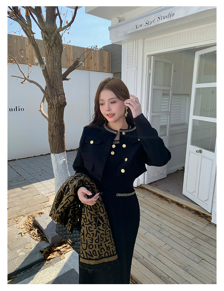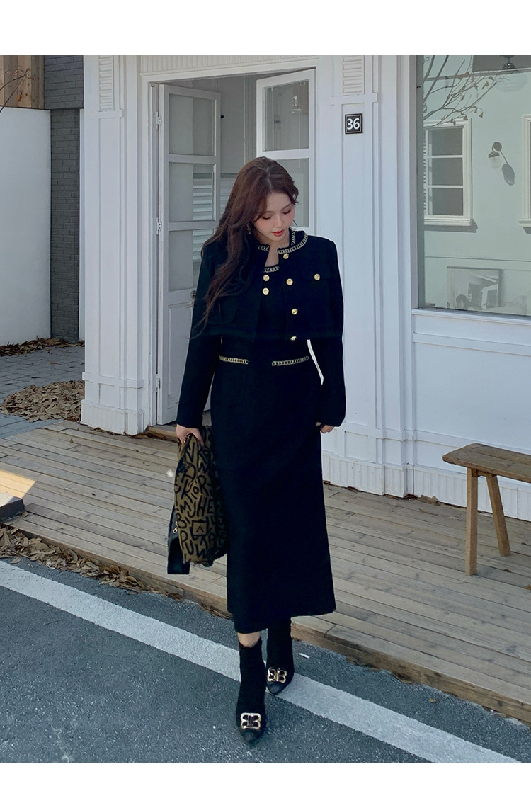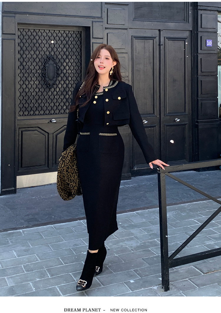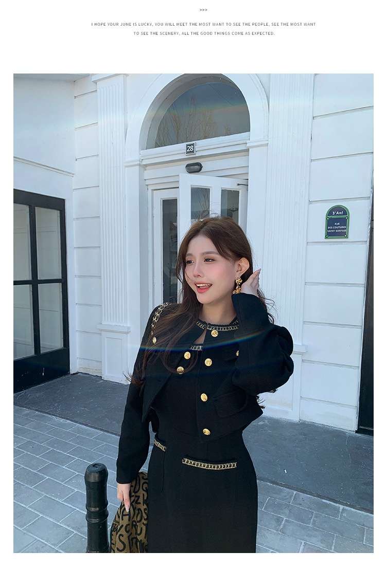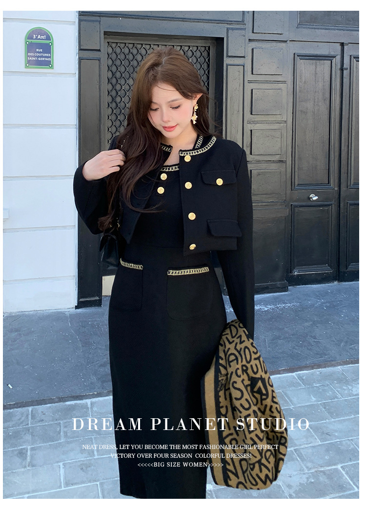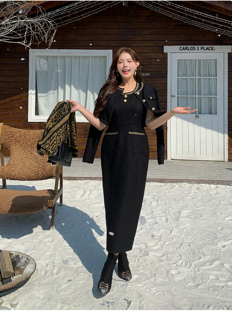 플러스 사이즈 여자 고급 통통녀 프랑스 레트로 블랙 샤넬 세트 뉴 트위드 2 피스 1986