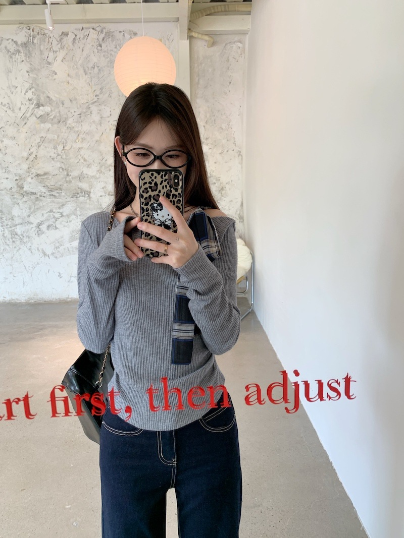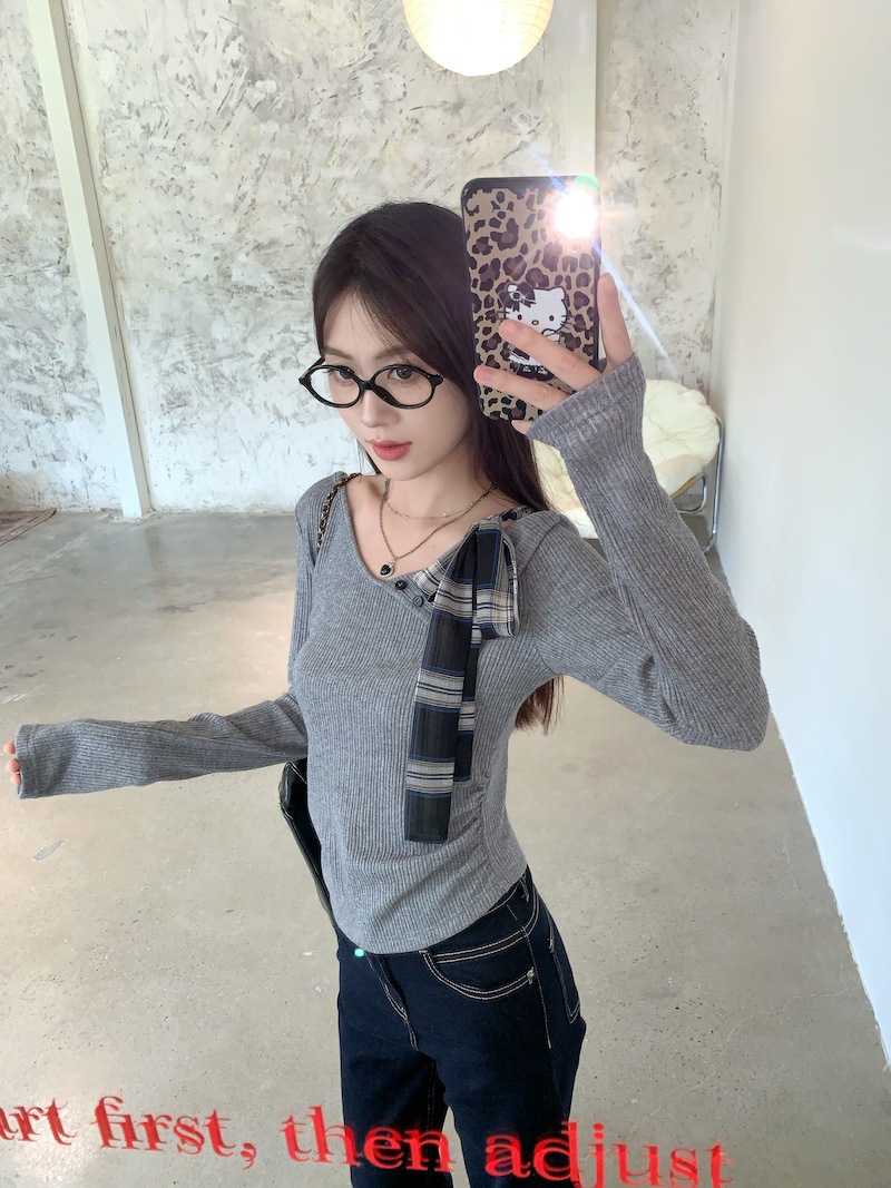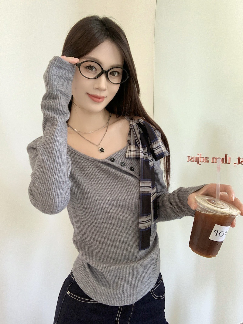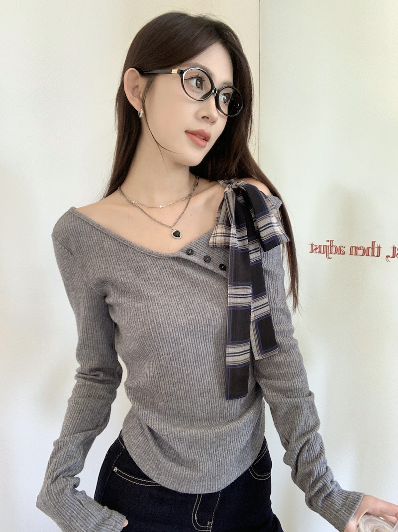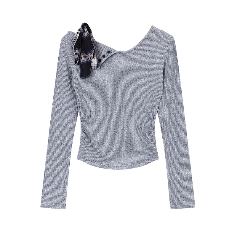 회색 불규칙한 활 어깨 티셔츠 여성용 봄과 가을 틈새 슬림핏 내부 긴팔베이스 셔츠 탑
