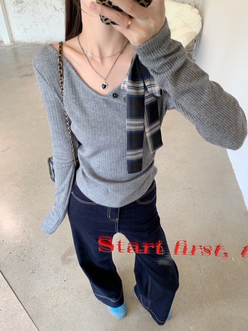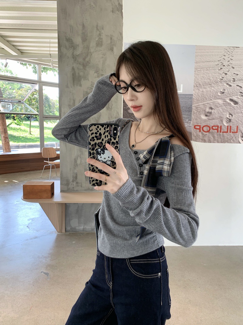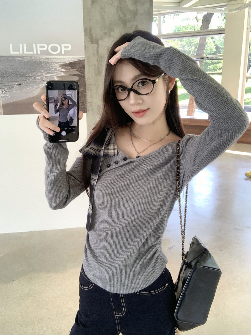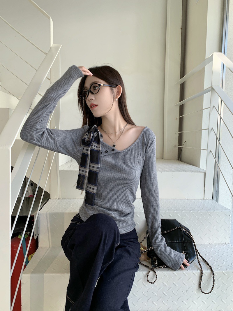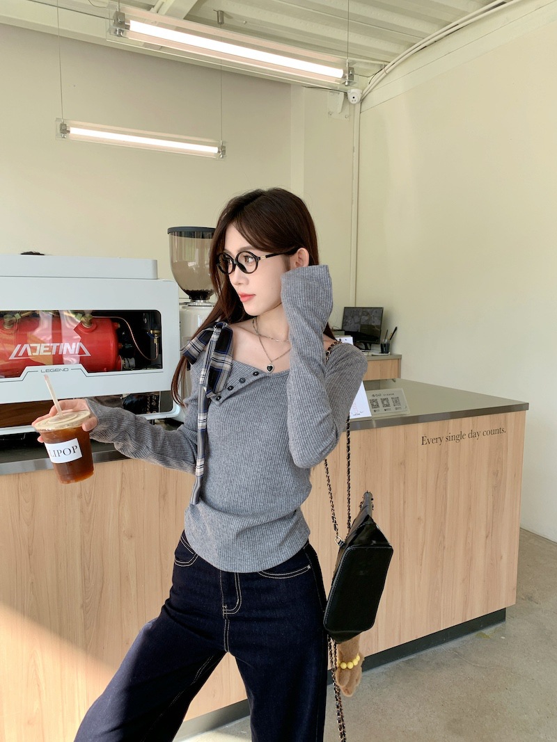 회색 불규칙한 활 어깨 티셔츠 여성용 봄과 가을 틈새 슬림핏 내부 긴팔베이스 셔츠 탑