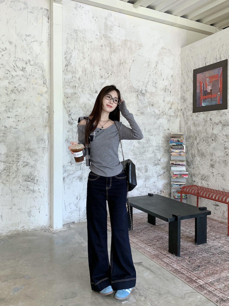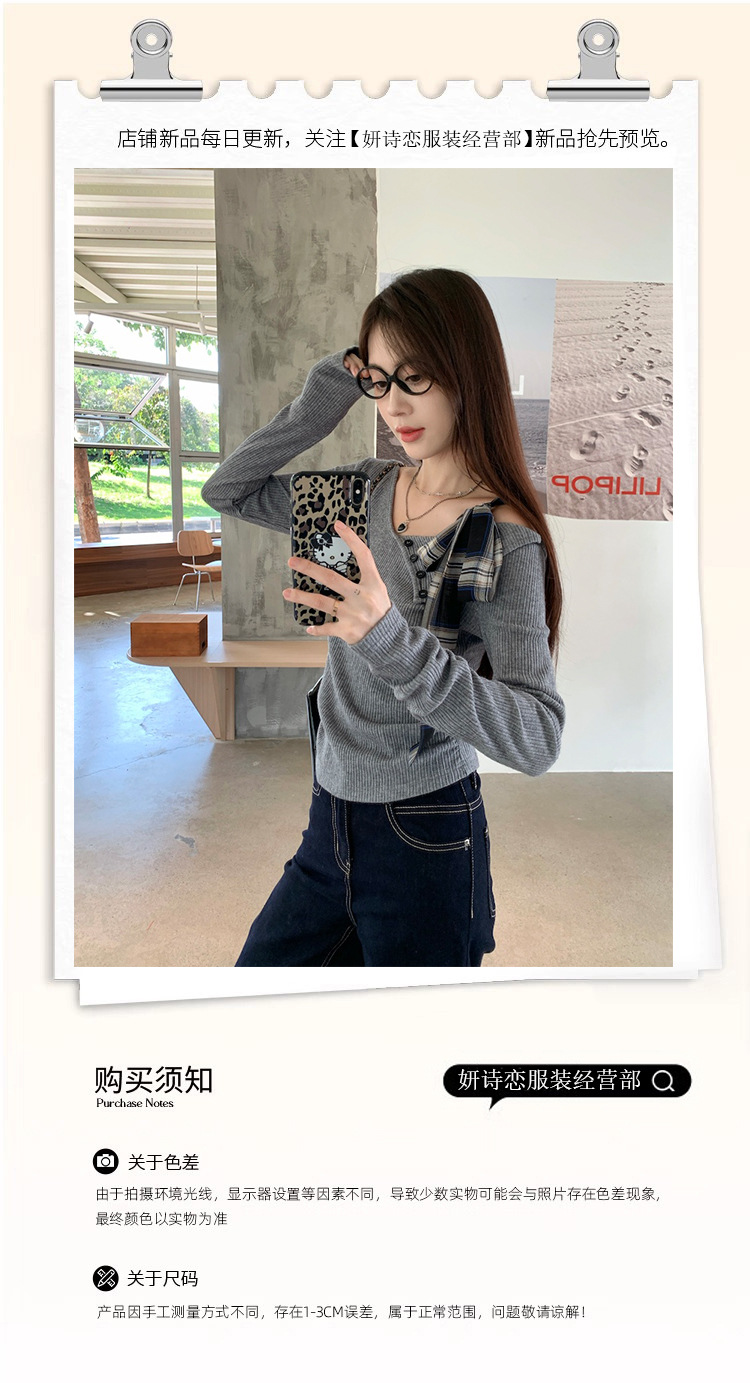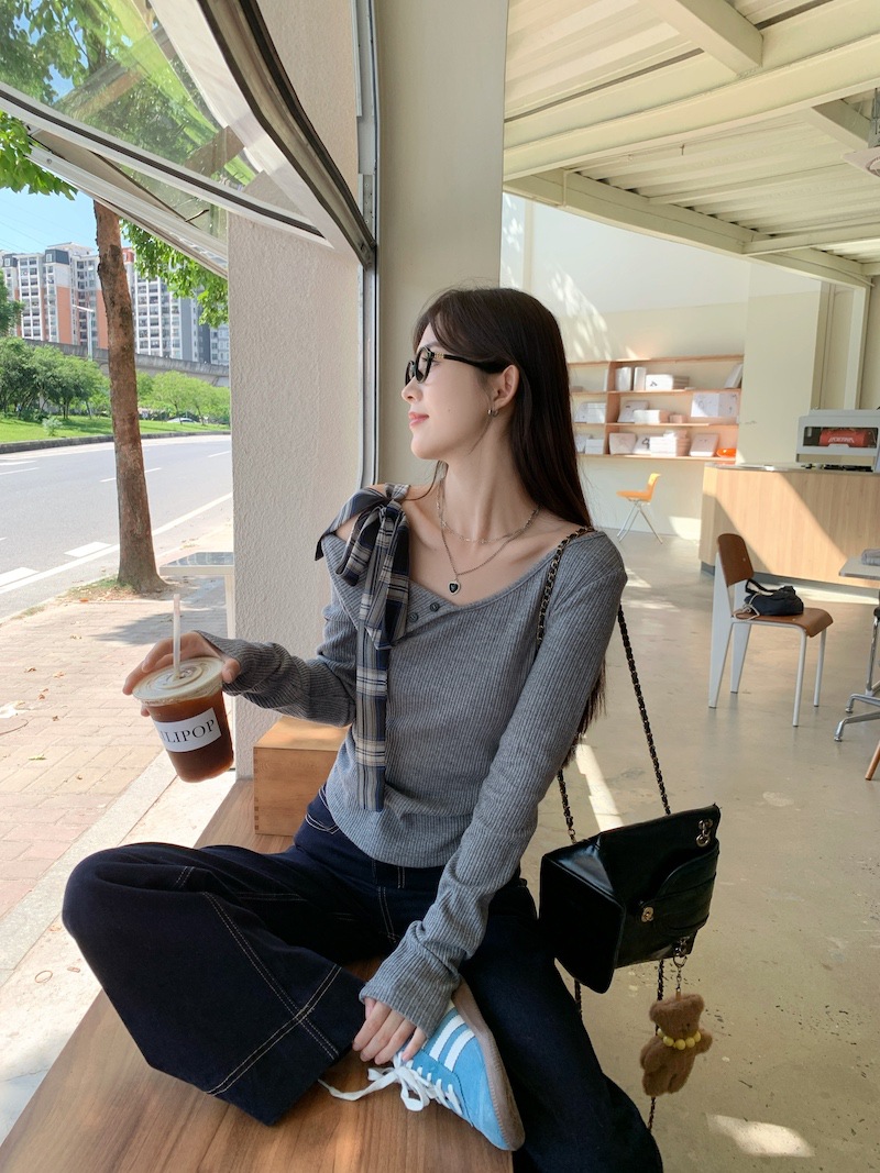 회색 불규칙한 활 어깨 티셔츠 여성용 봄과 가을 틈새 슬림핏 내부 긴팔베이스 셔츠 탑스토어 가기