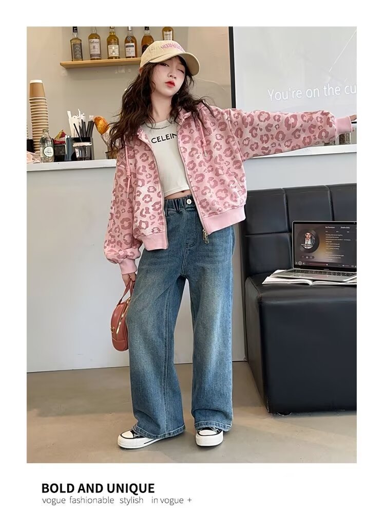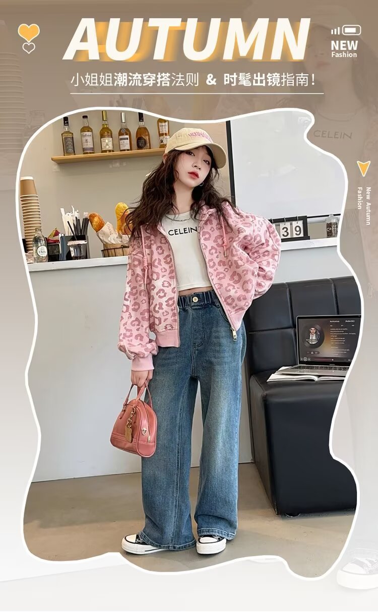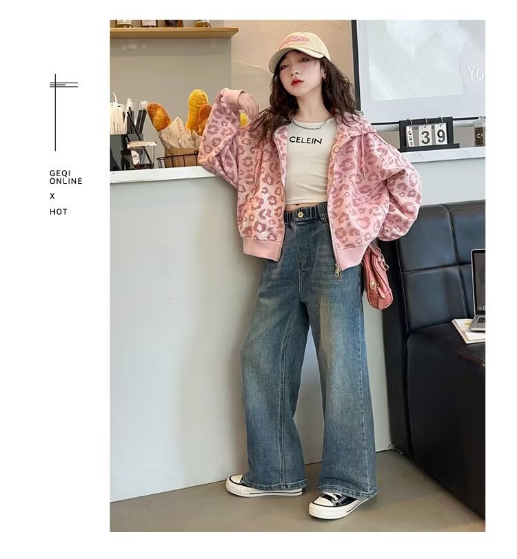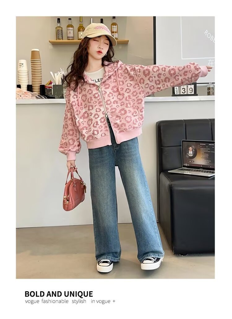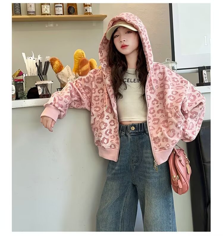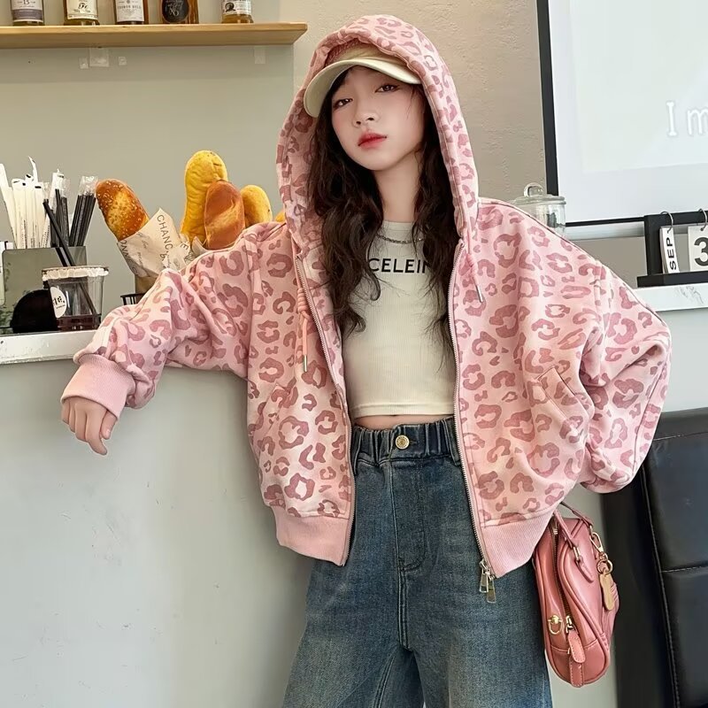 소녀의 가을 카디건 재킷 2024 새로운 소녀의 서양식 핑크 레오파드 무늬 최고의 어린이 봄과 가을 후드 세트스토어 가기