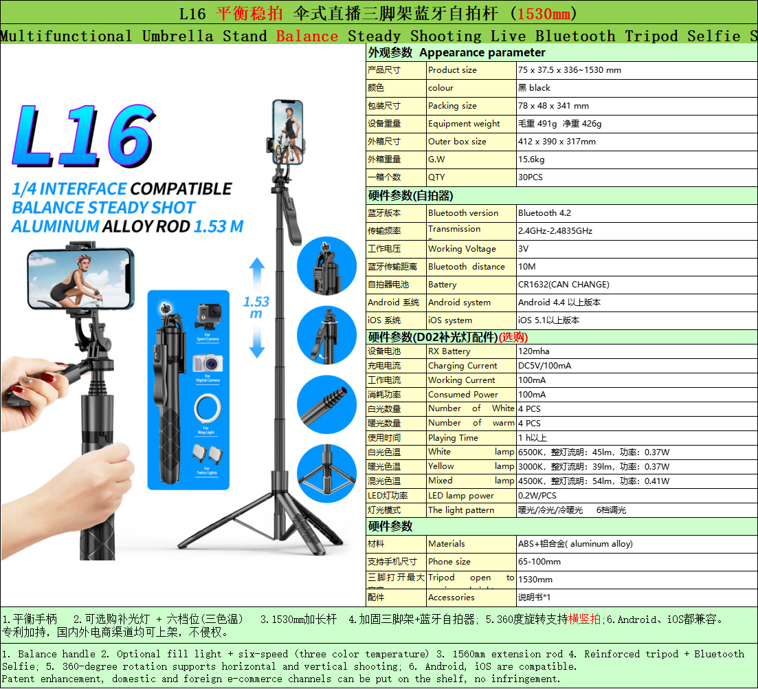 휴대 전화 블루투스 셀카 스틱 L16 층 라이브 방송 개폐식 삼각대 휴대 전화 브래킷 라이트 채우기 조명 카메라 유물