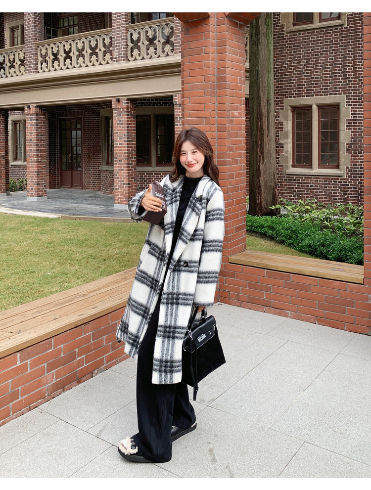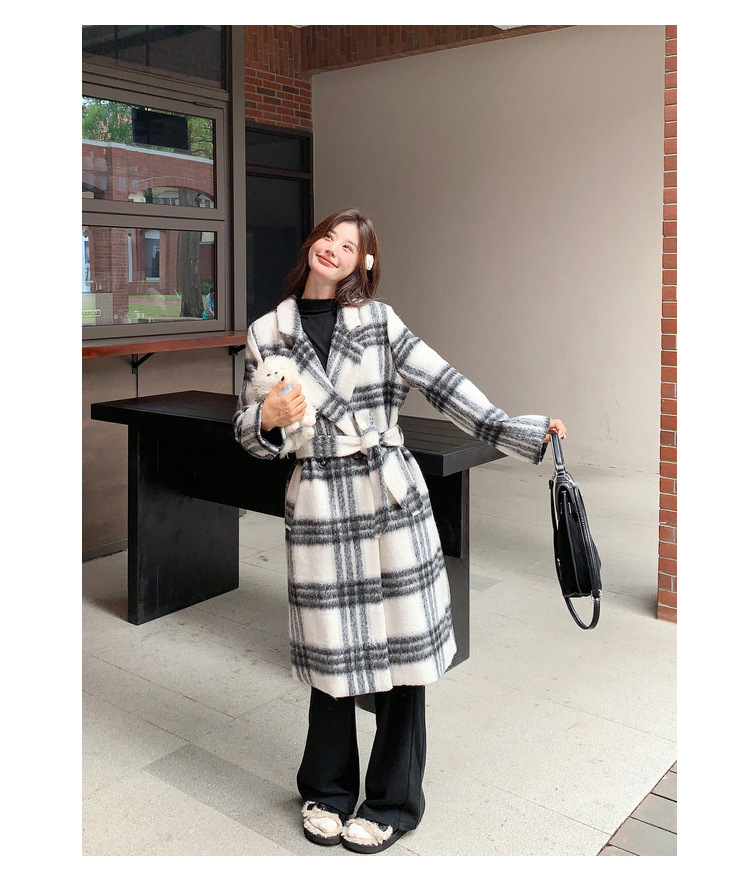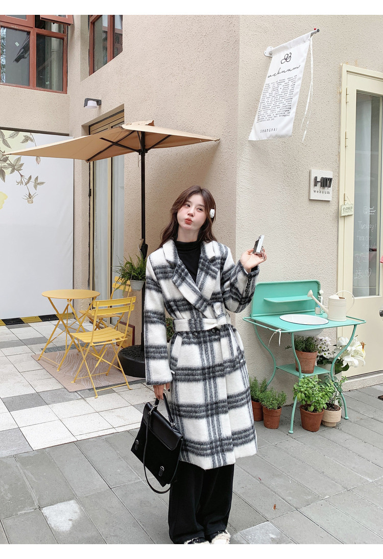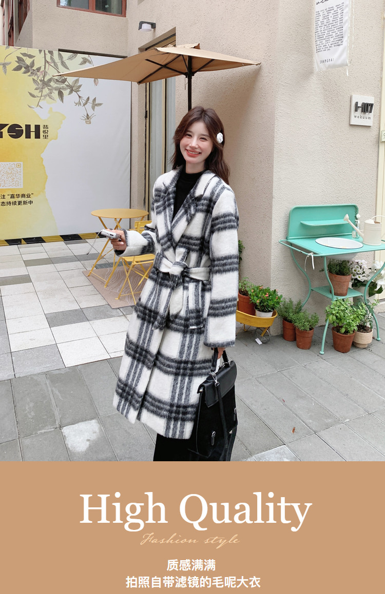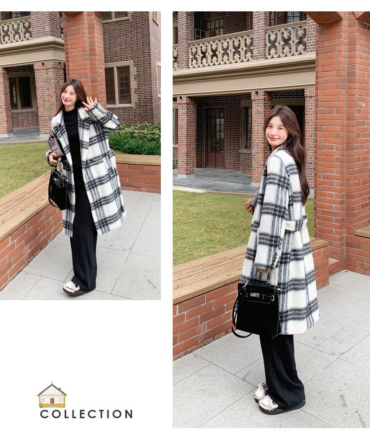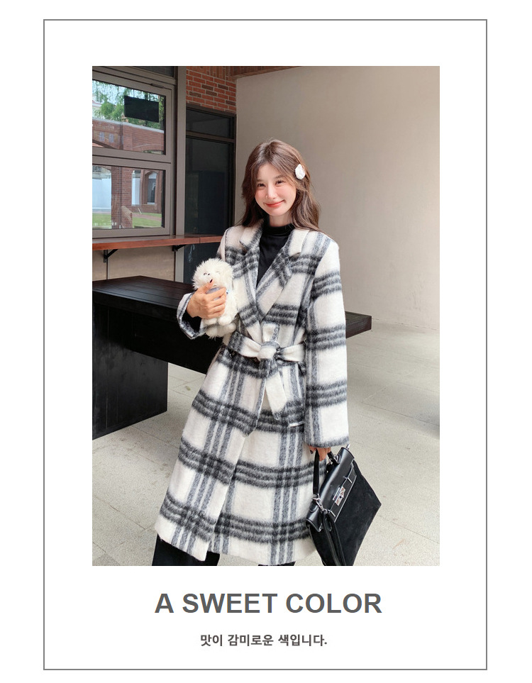 [이탈리아] Mengmei 2024 겨울 한국 스타일 캐주얼 스타일 흑백 격자 무늬 고급 긴장된 허리 슬리밍 모직 코트스토어 가기