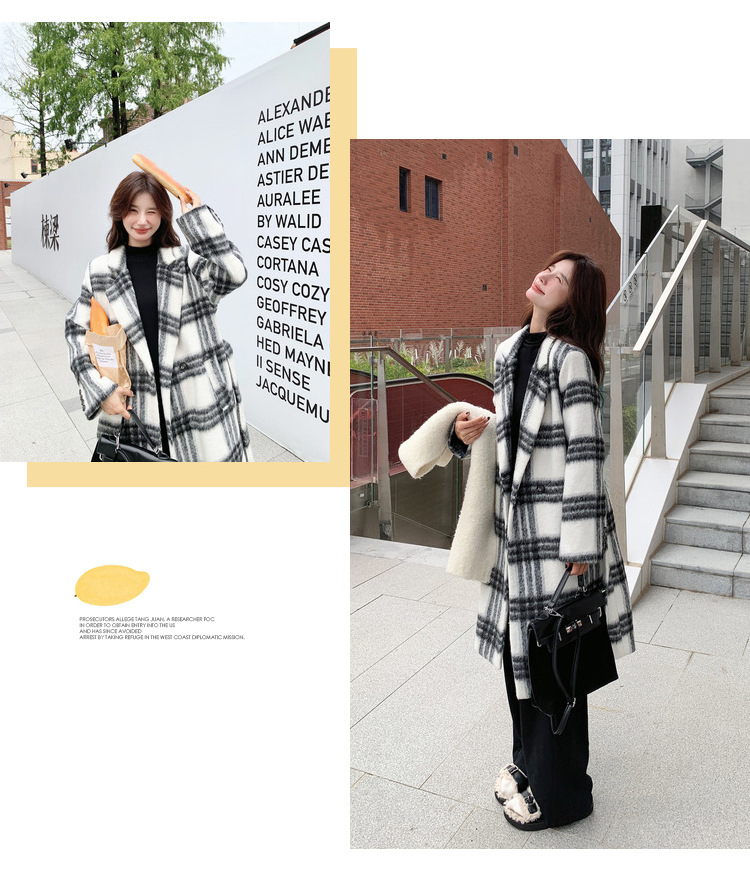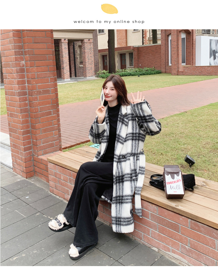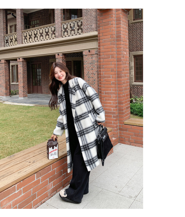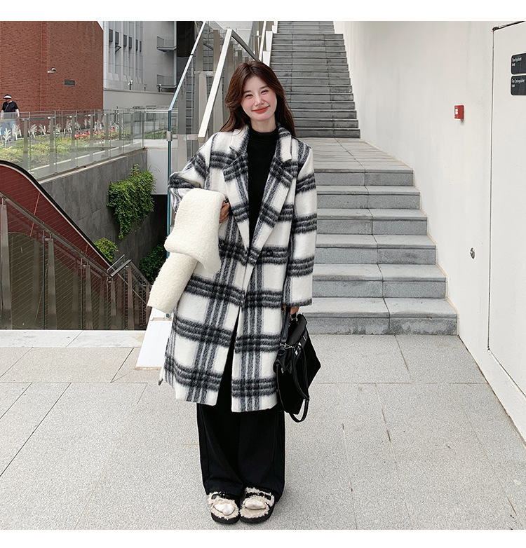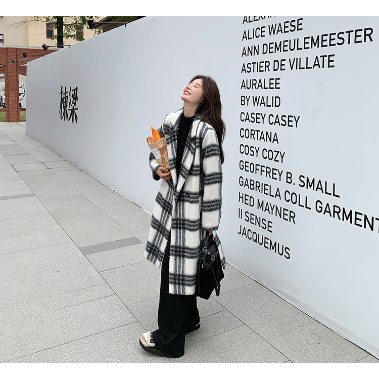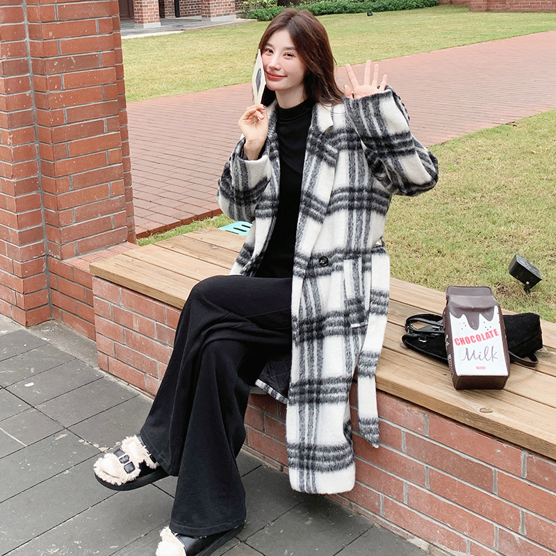 [이탈리아] Mengmei 2024 겨울 한국 스타일 캐주얼 스타일 흑백 격자 무늬 고급 긴장된 허리 슬리밍 모직 코트스토어 가기