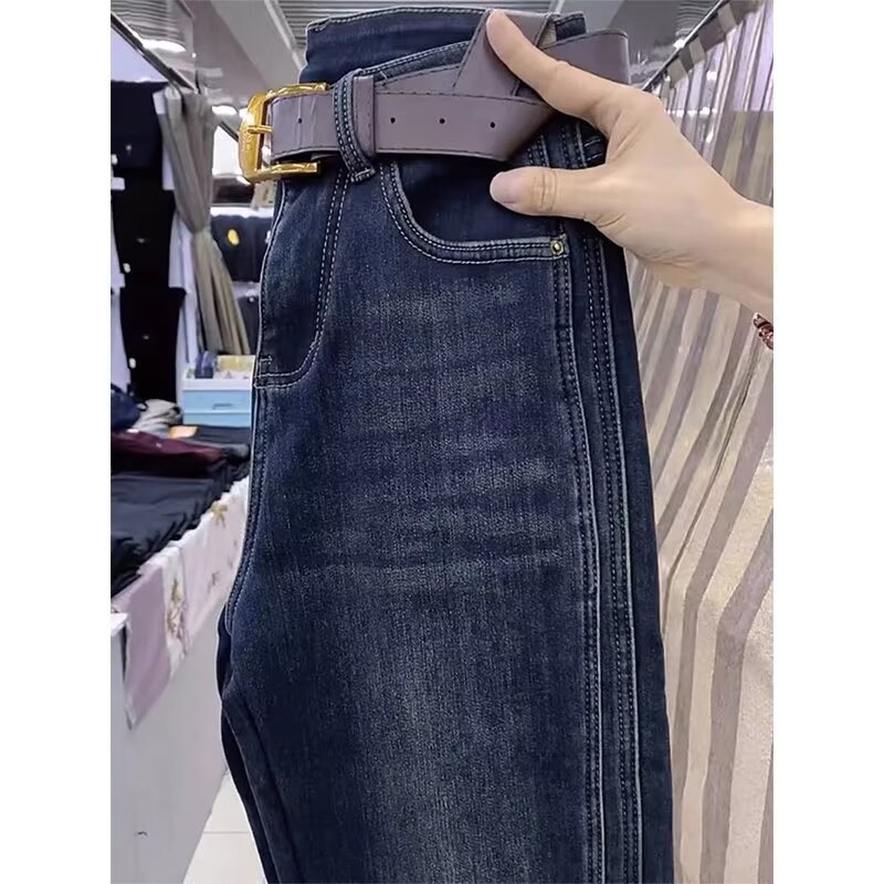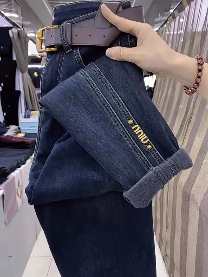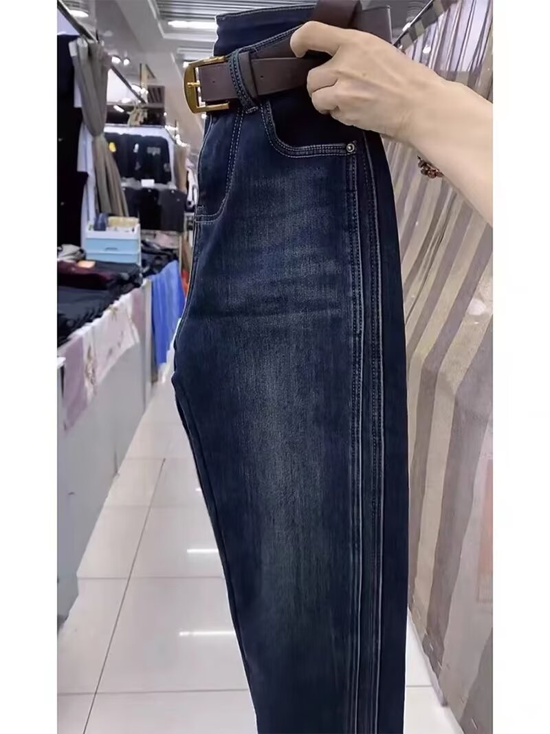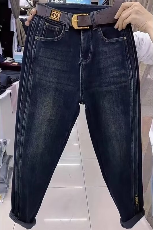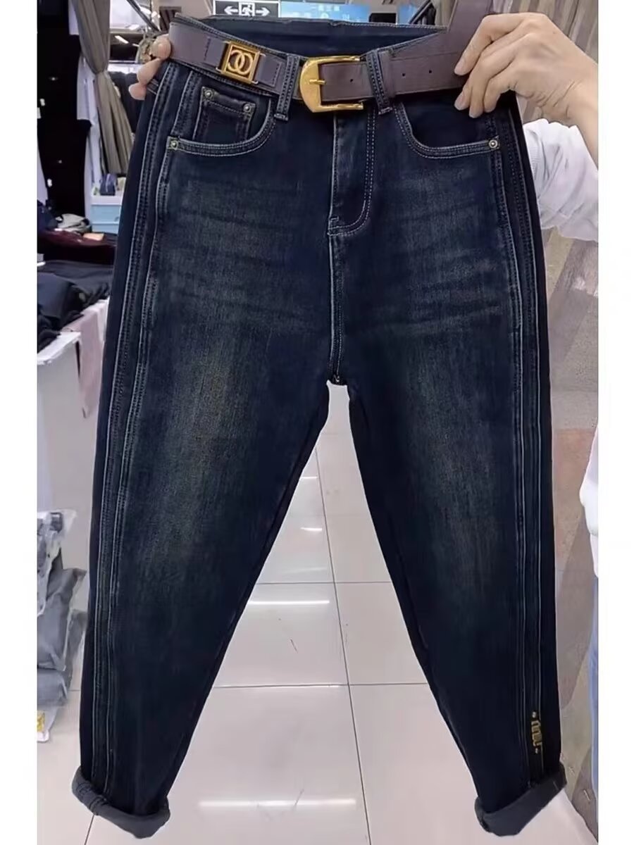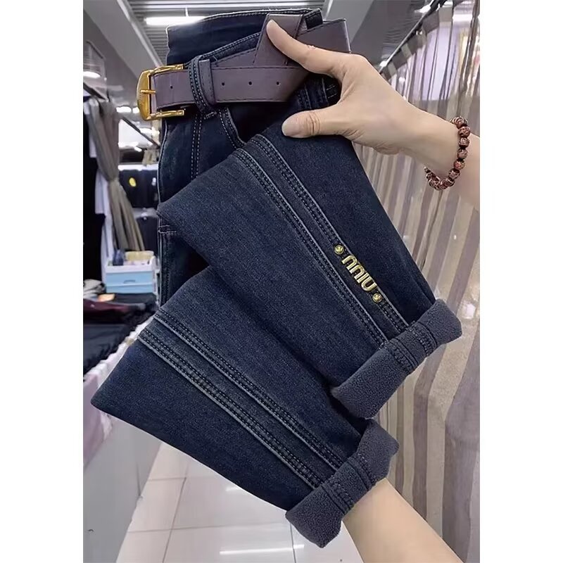 2024 년 가을과 겨울을위한 배 모양의 뚱뚱한 플러스 사이즈 여성복 Harlan Torre 데님 바지 새로운 벨벳 바지스토어 가기