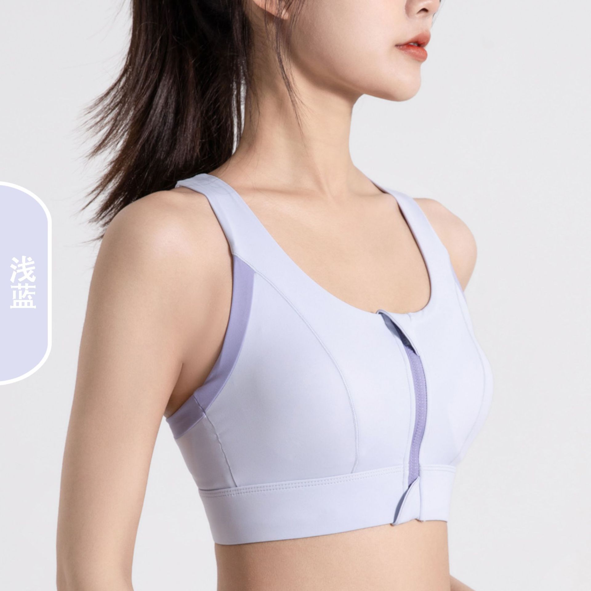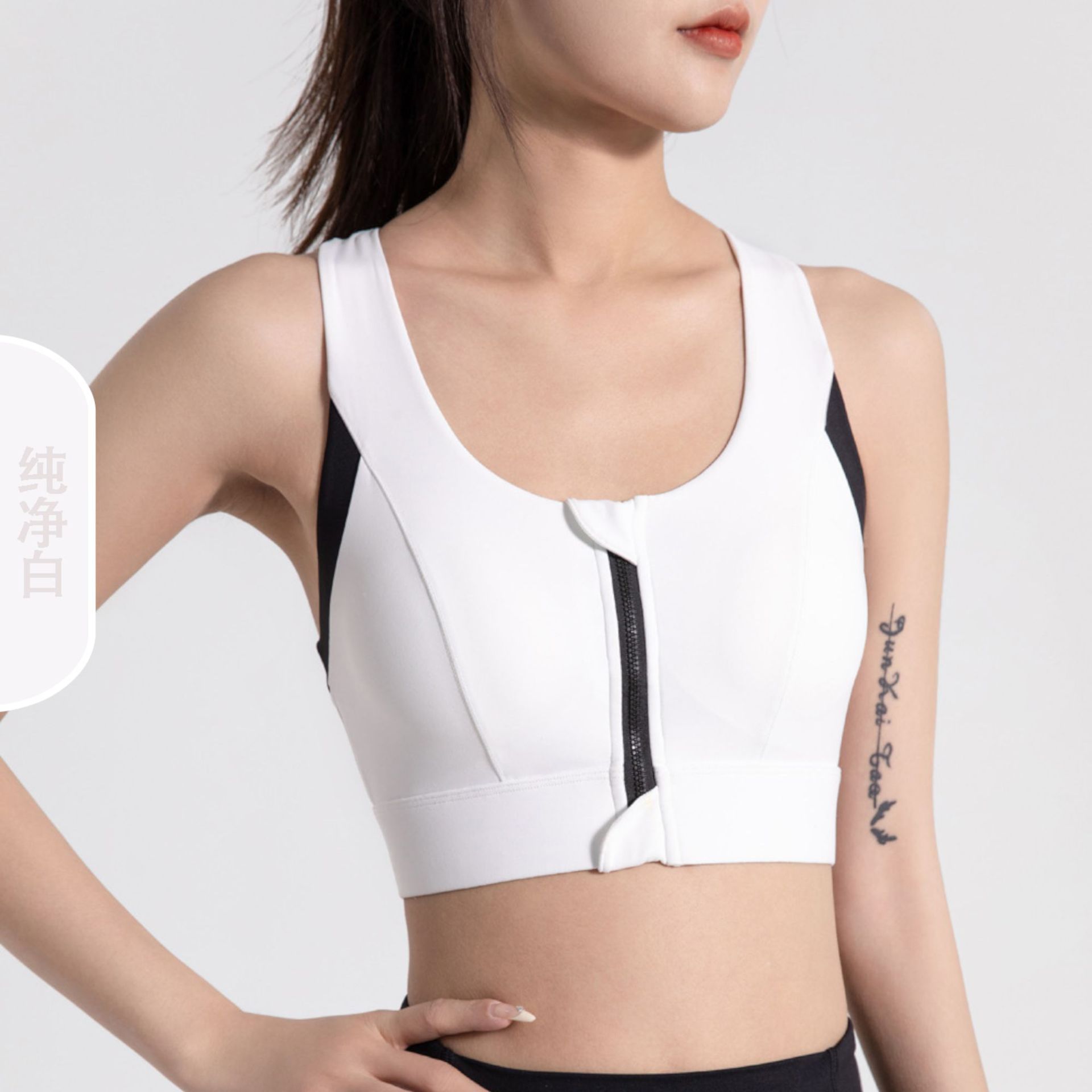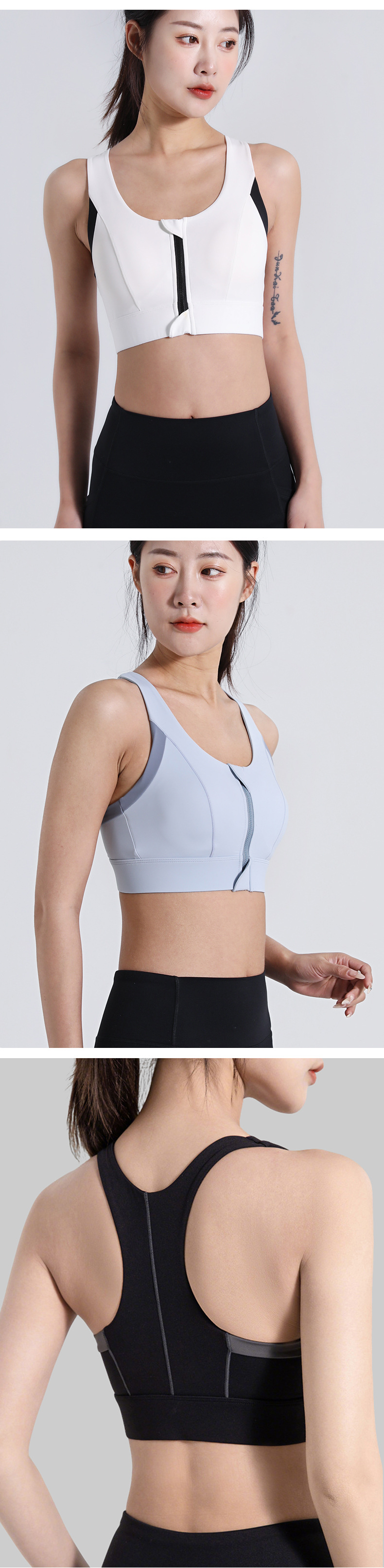 여름 대비 색상 접합 앞 지퍼 충격 방지 아름다운 등받이 피트니스 브라 착용하기 쉬운 여성용 고강도 누드 스포츠 브라