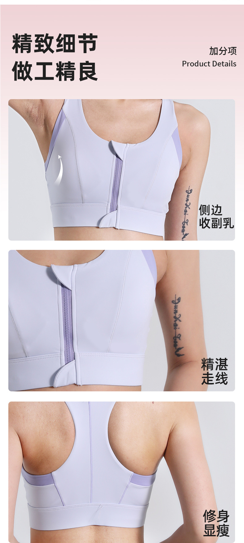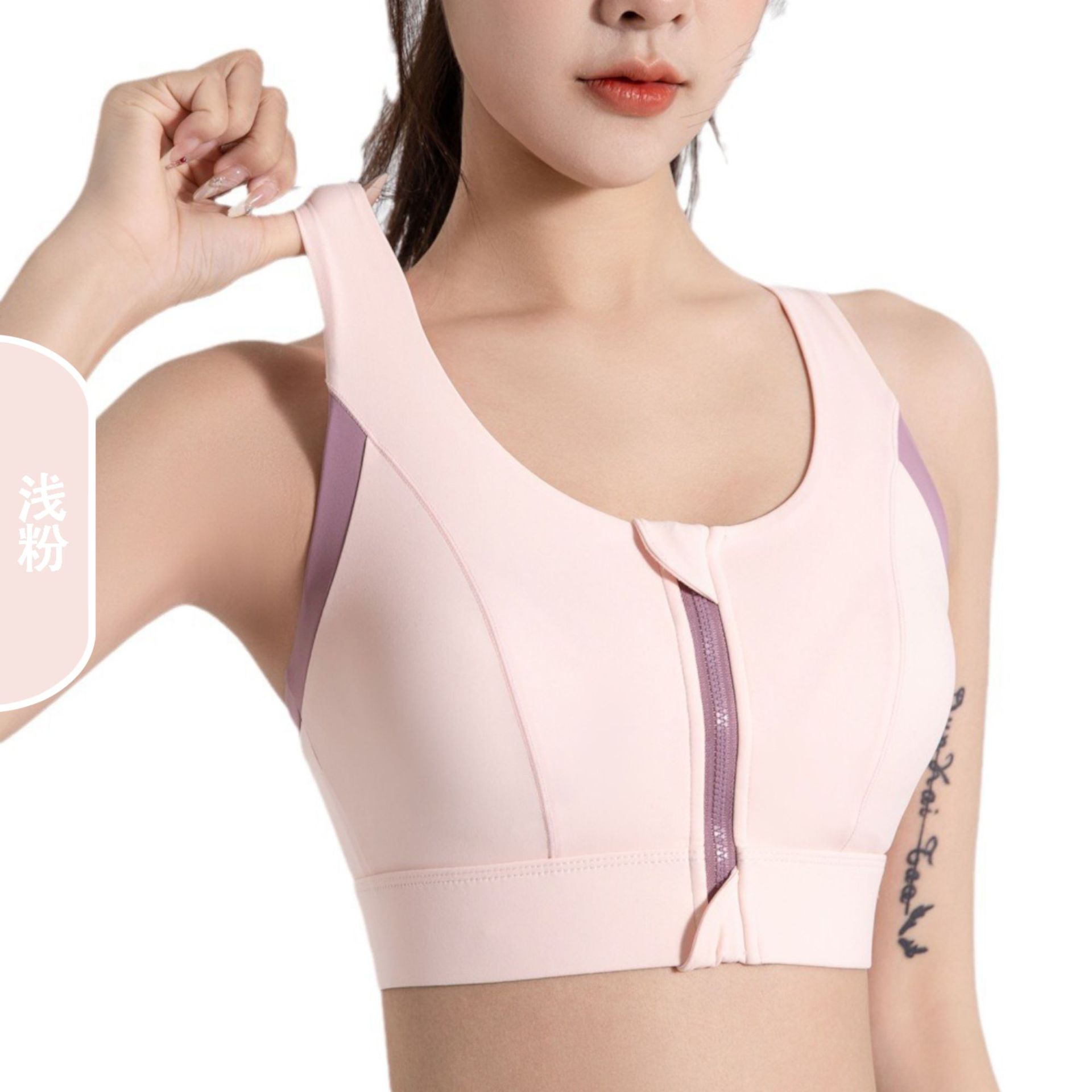 여름 대비 색상 접합 앞 지퍼 충격 방지 아름다운 등받이 피트니스 브라 착용하기 쉬운 여성용 고강도 누드 스포츠 브라스토어 가기