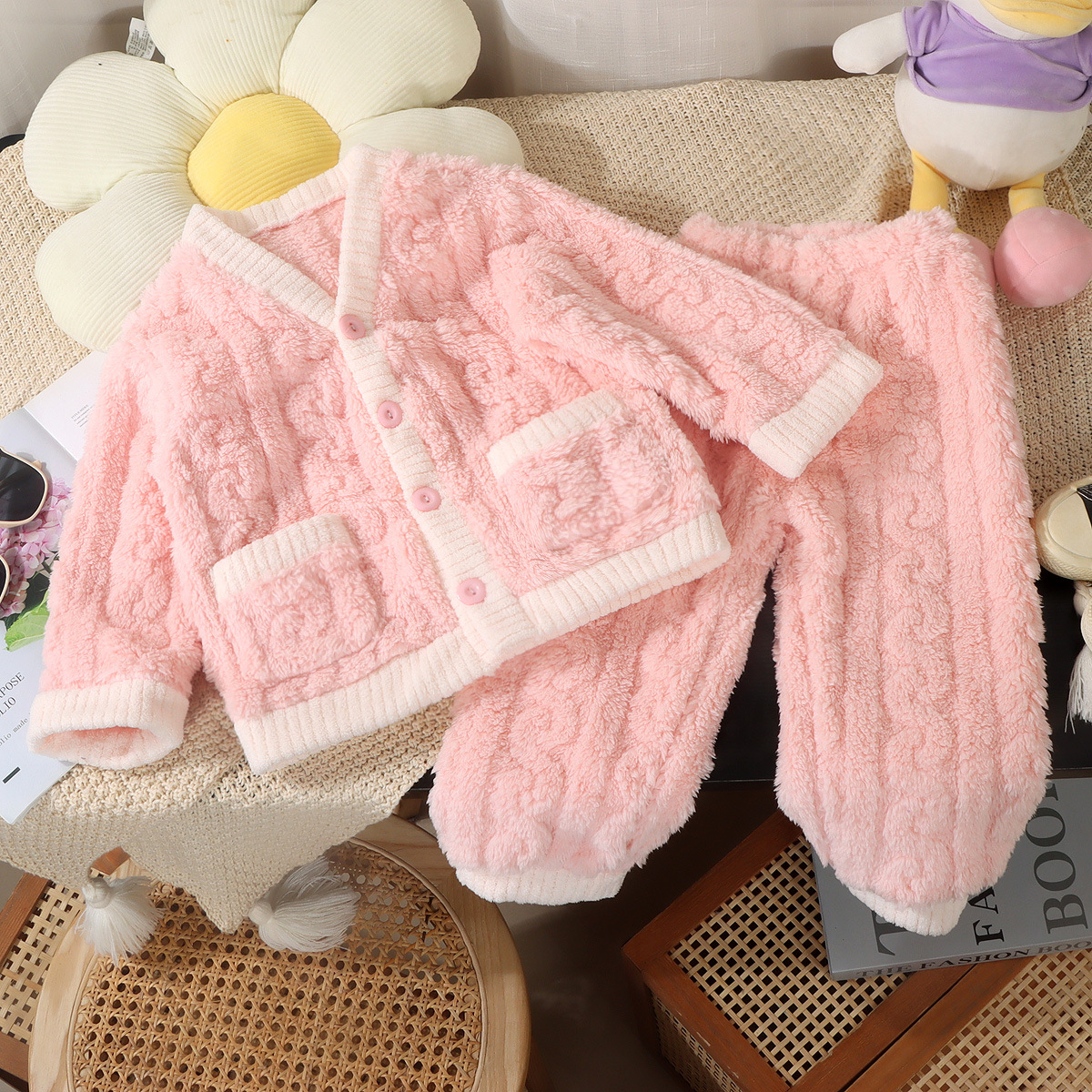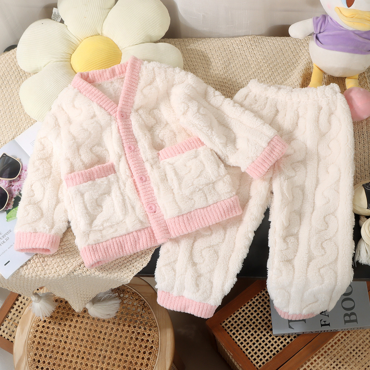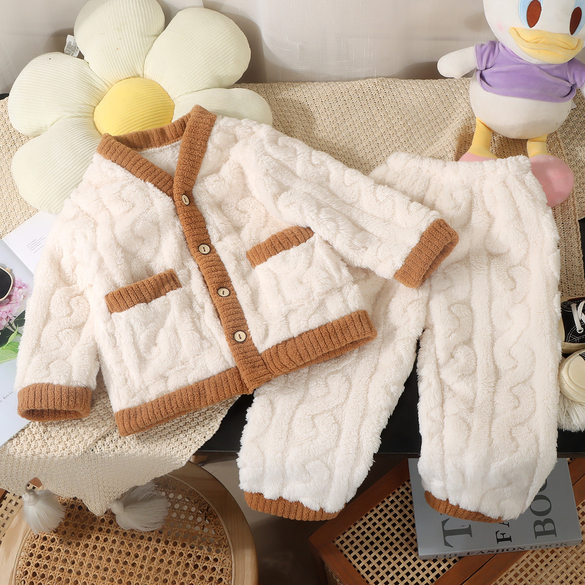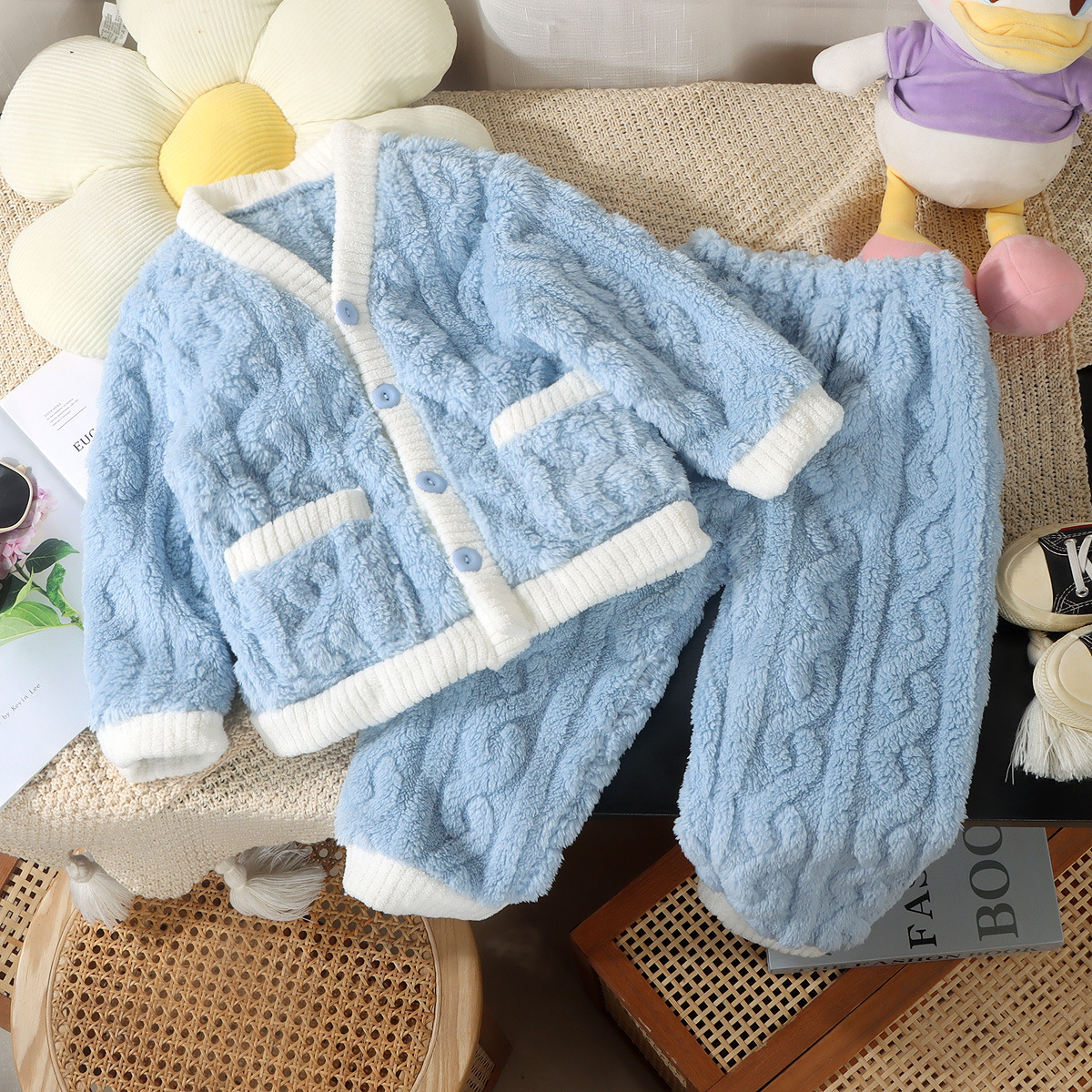 어린이 잠옷 가을과 겨울 플란넬 산호 양털 어린이 카디건 세트 소년 기모 두꺼운 한국식 홈 옷