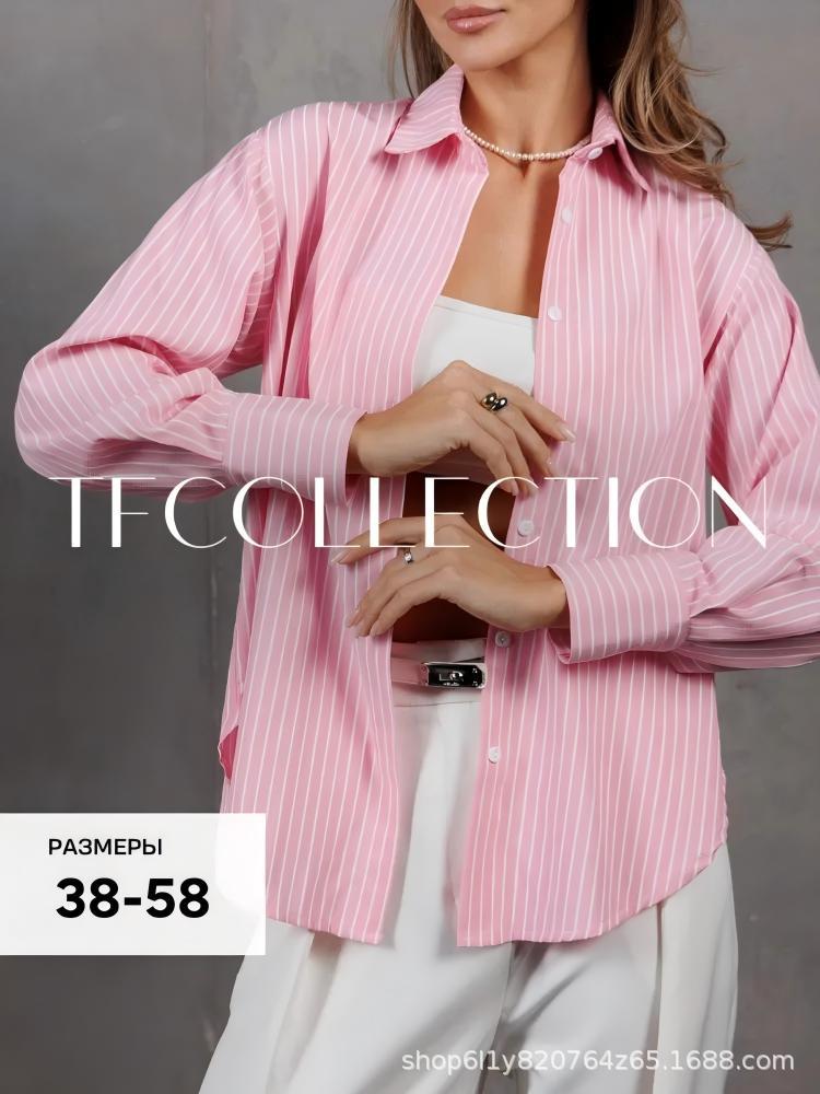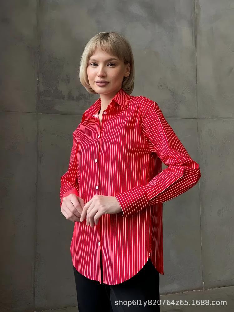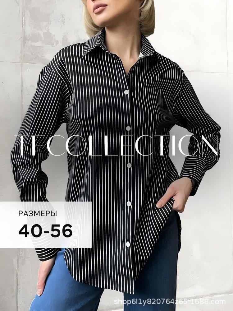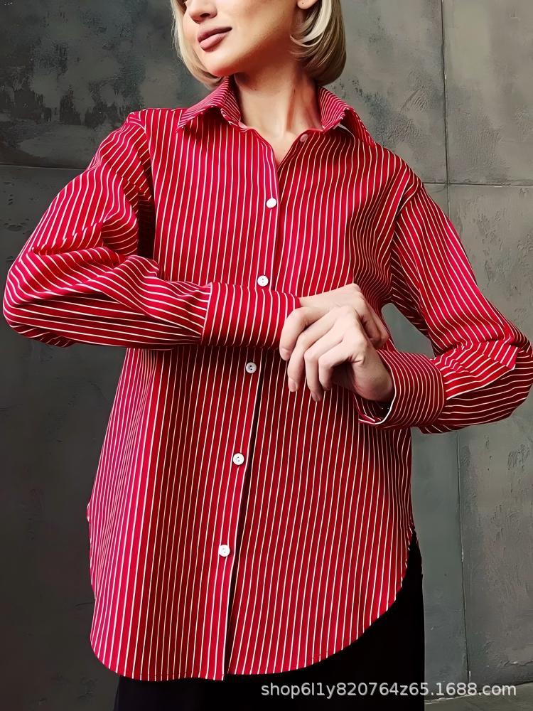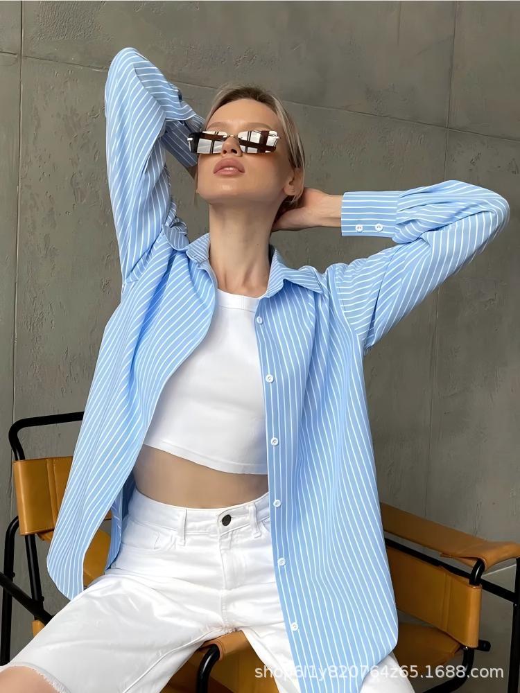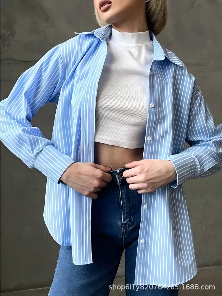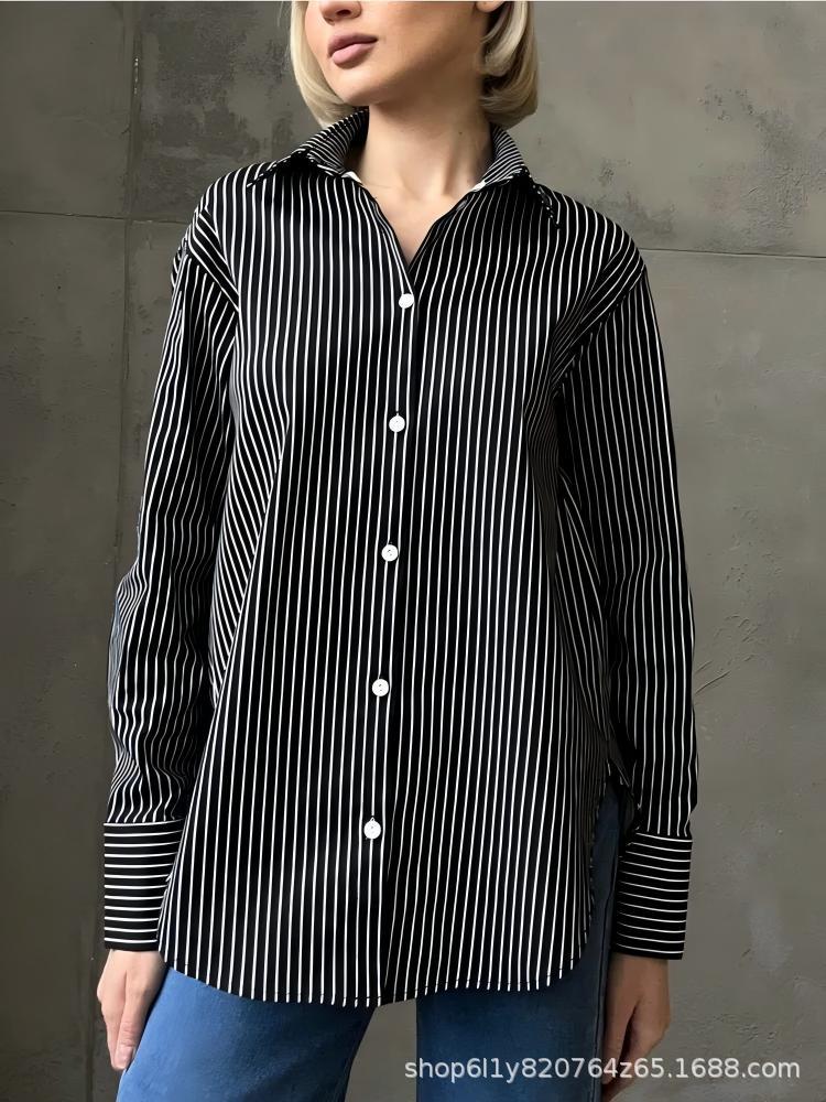 유럽과 미국의 대외 무역 여성의 2024 새로운 느슨한 플러스 사이즈 줄무늬 여성 셔츠 셔츠 캐주얼 긴 소매 셔츠