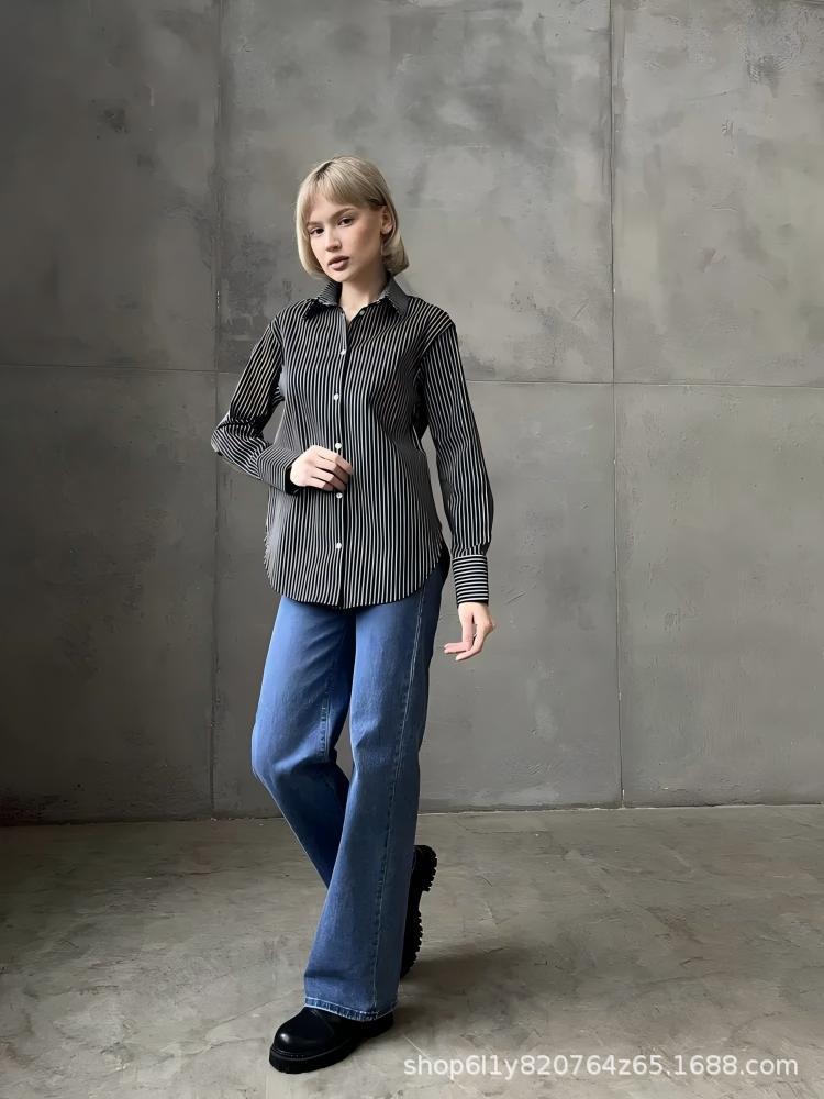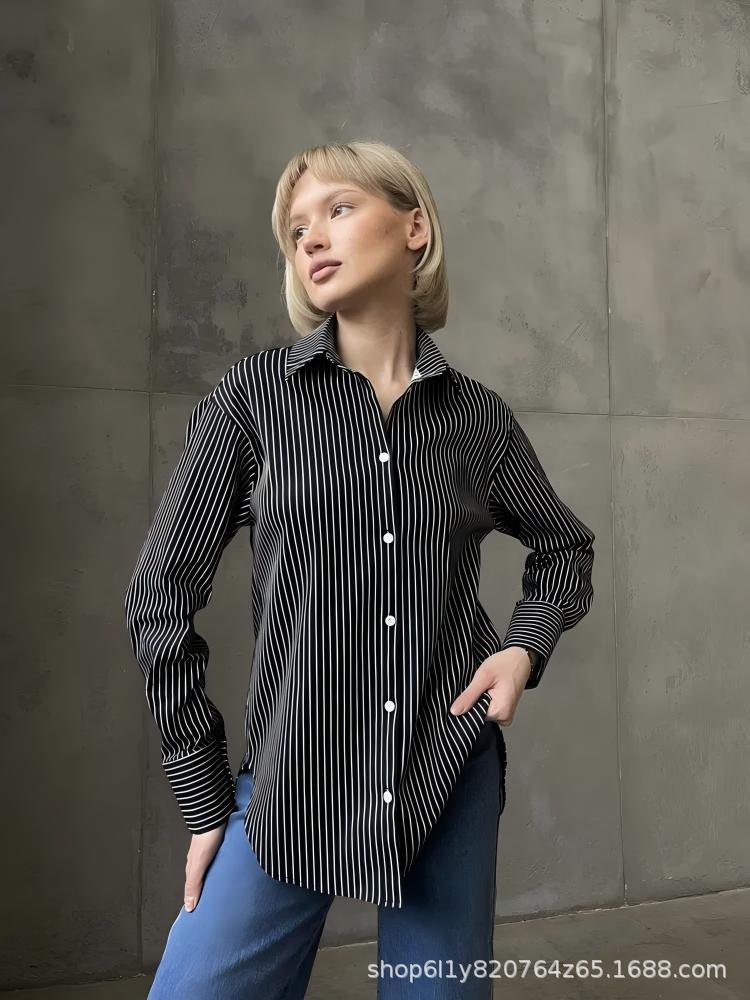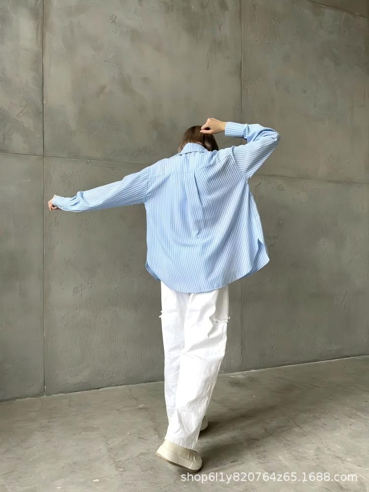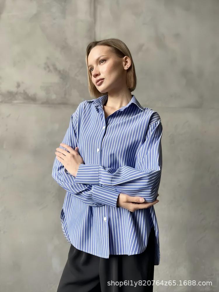유럽과 미국의 대외 무역 여성의 2024 새로운 느슨한 플러스 사이즈 줄무늬 여성 셔츠 셔츠 캐주얼 긴 소매 셔츠스토어 가기