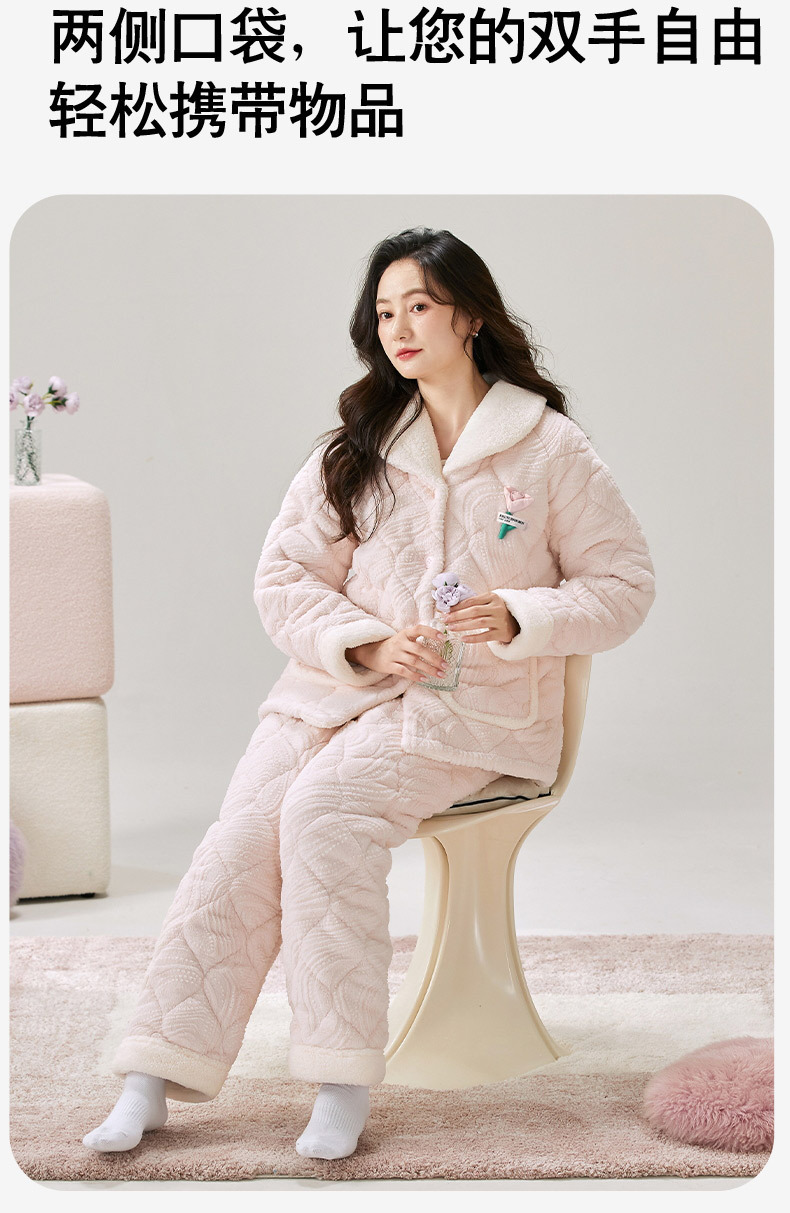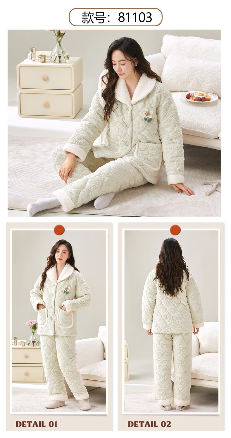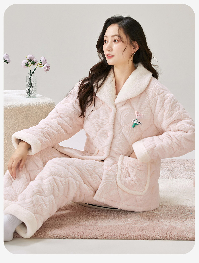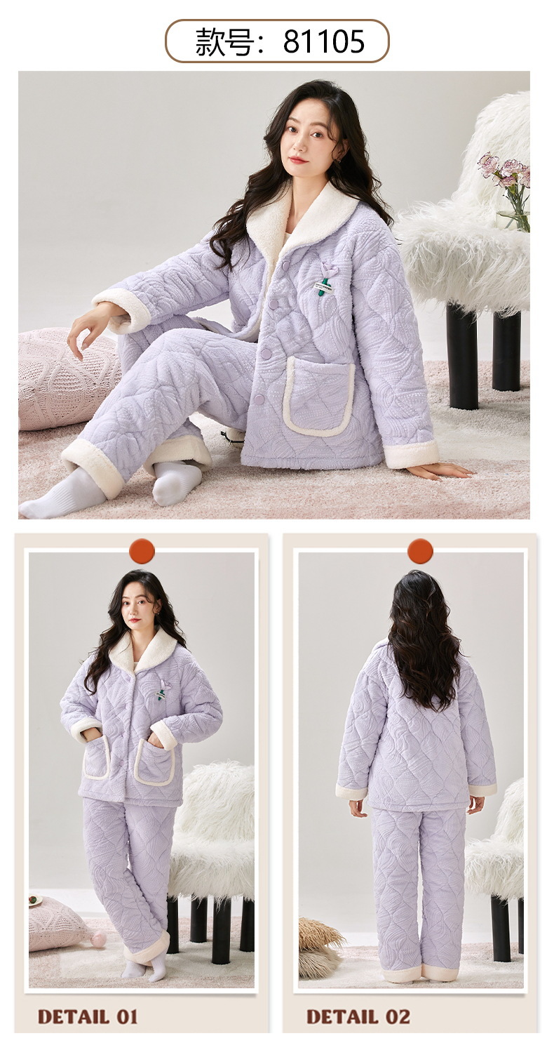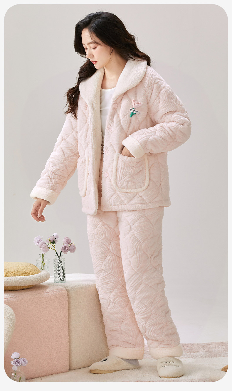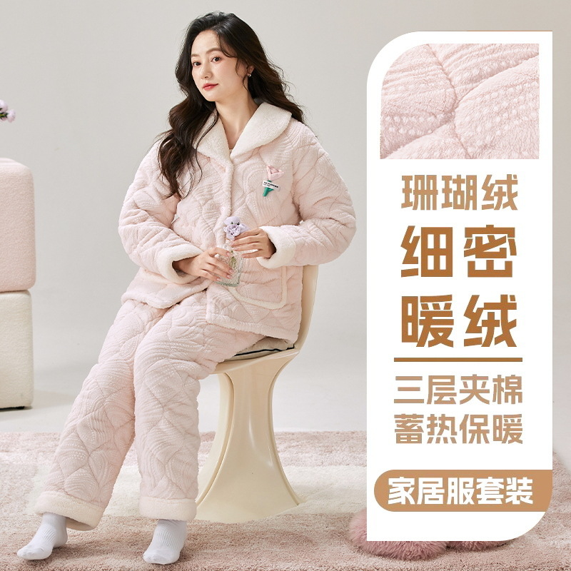 3 층 퀼트 여성용 파자마 겨울 산호 양털 기모 두꺼운 코튼 패딩 재킷 긴팔 홈 의류 물리적 매장 세트