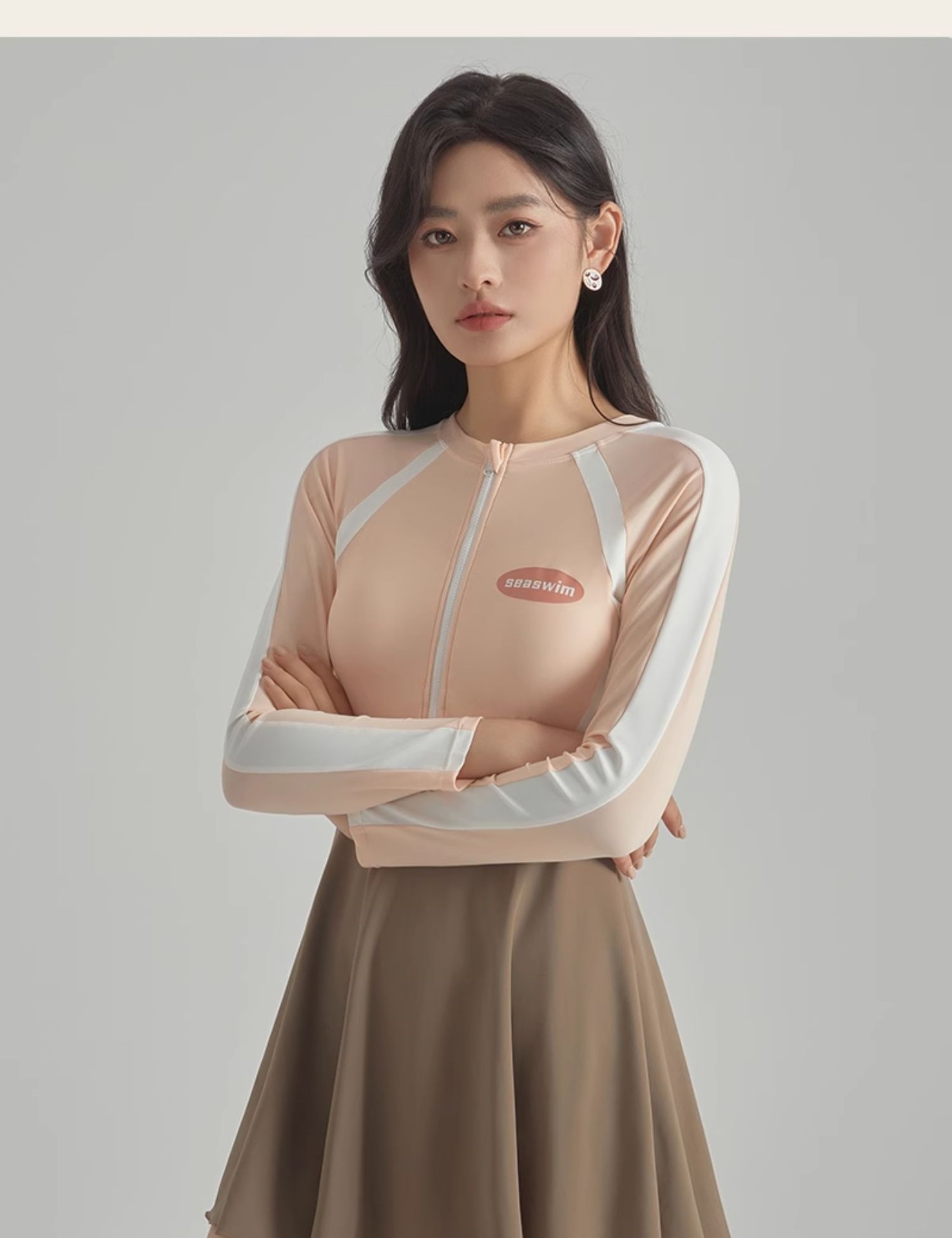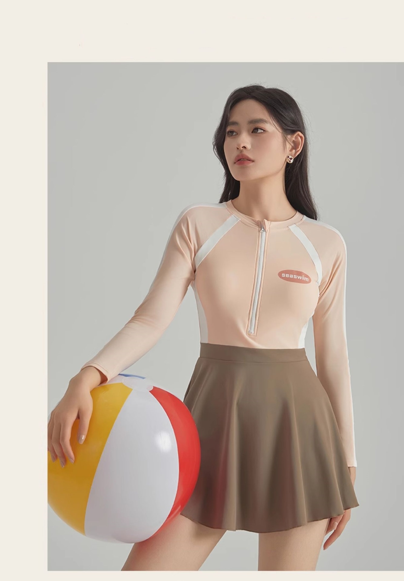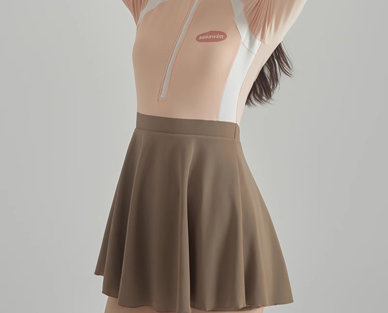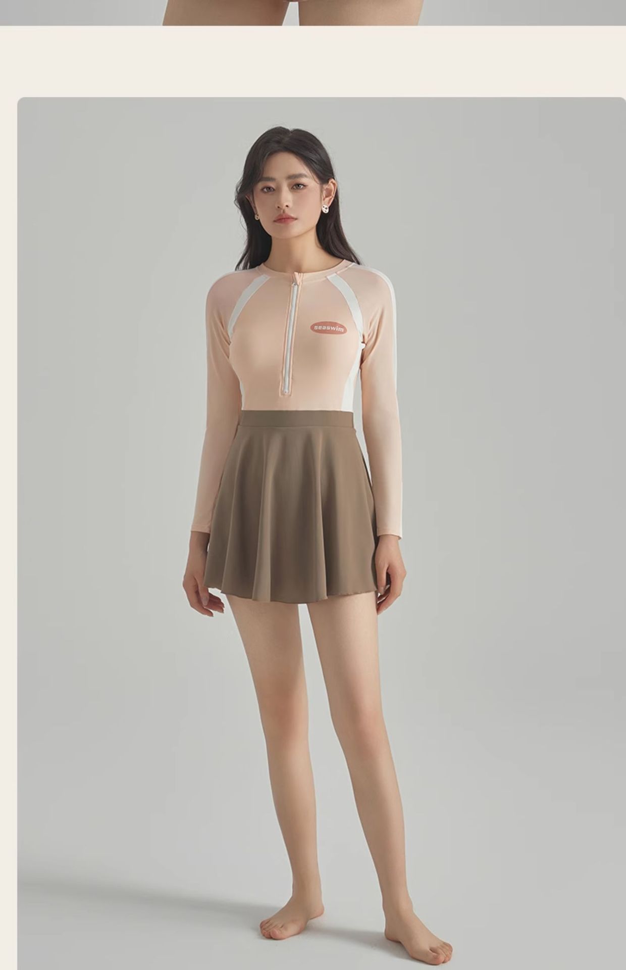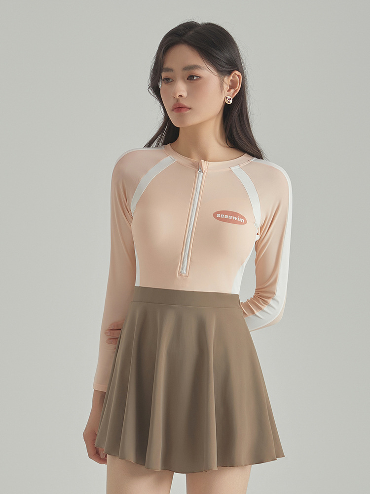 2025 새로운 가벼운 핑크 긴팔 원피스 스타일 캐주얼 보수적 인 소녀의 고기로 덮인 슬리밍 온천 휴일 수영복 여성스토어 가기