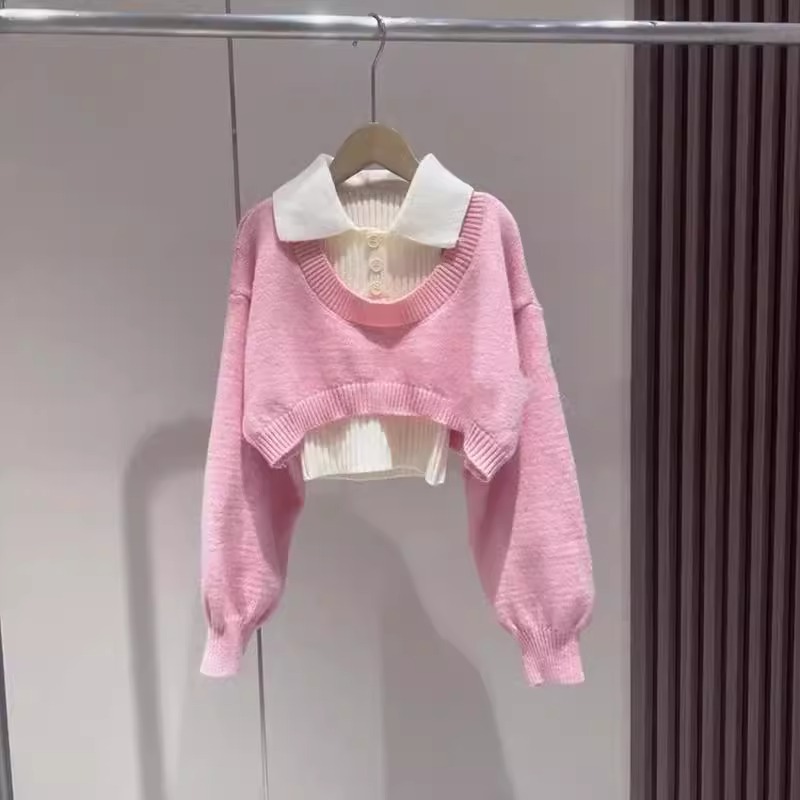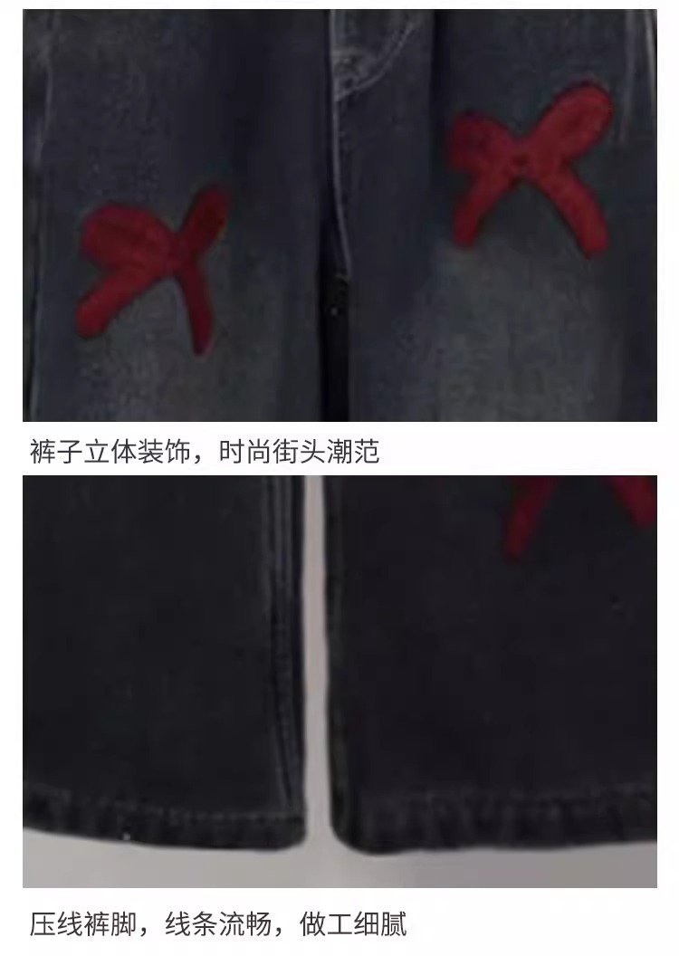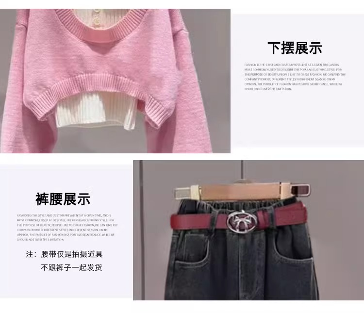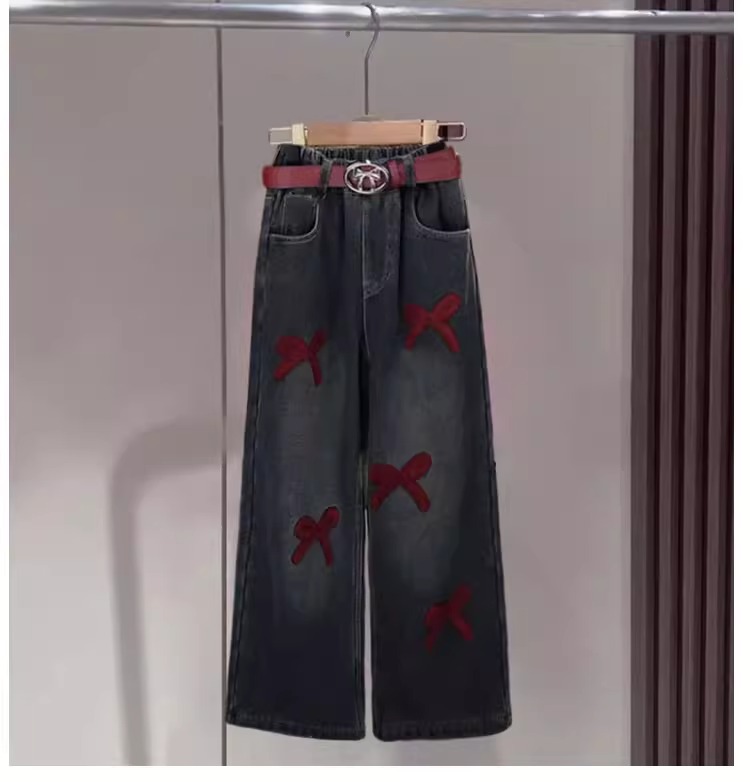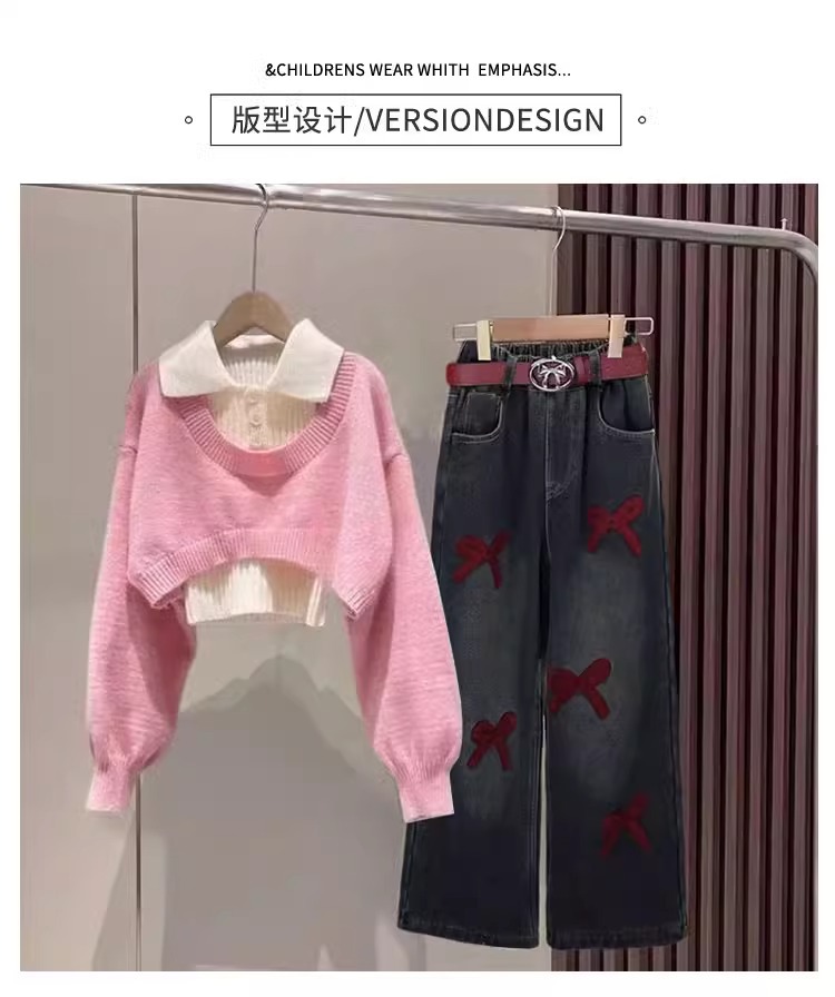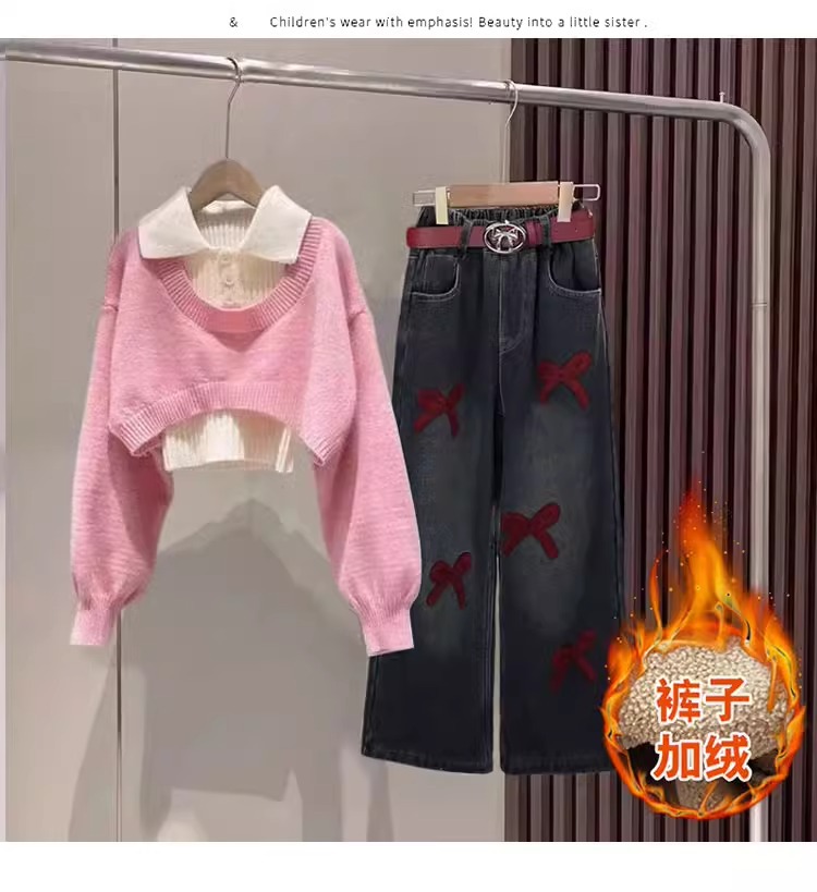 여자 바지 세트 가을과 겨울 착용 한국 스타일 어린이 기모 느슨한 니트 스웨터 넓은 다리 청바지 중학생스토어 가기