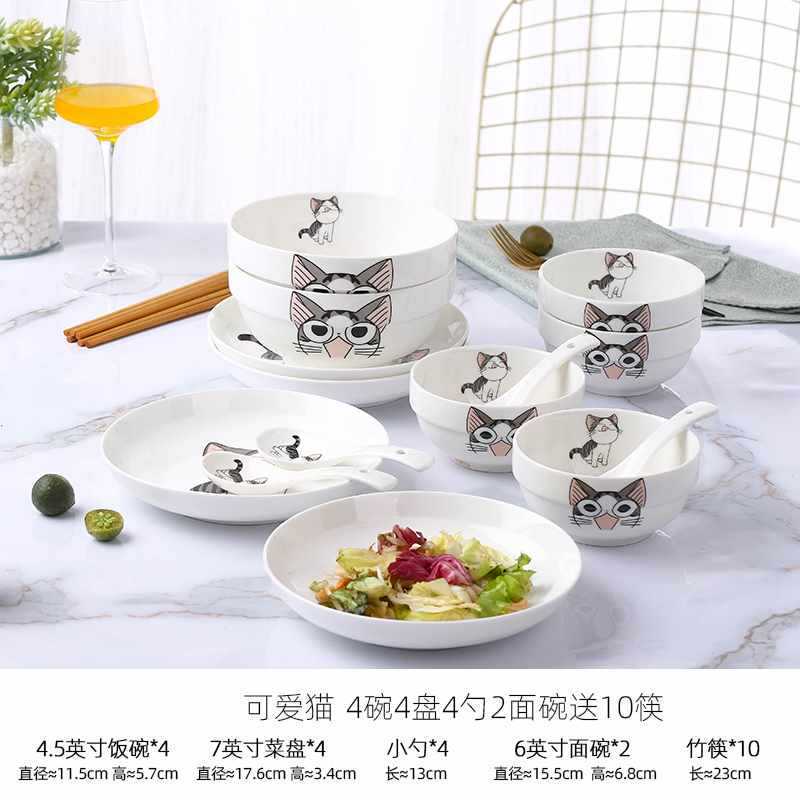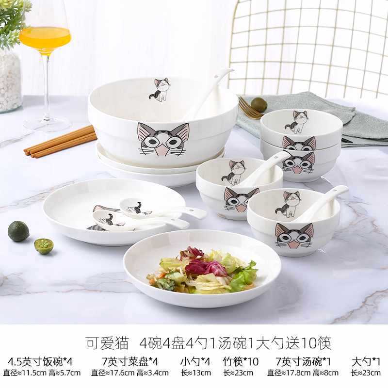 • 귀여운 고양이 그림 밥그릇 2개, 접시 2개, 숟가락 2개, 젓가락 2벌 세트⚑