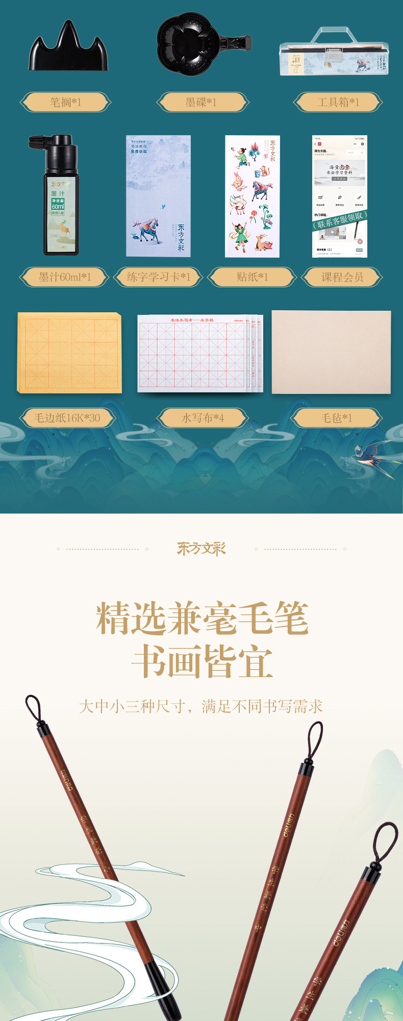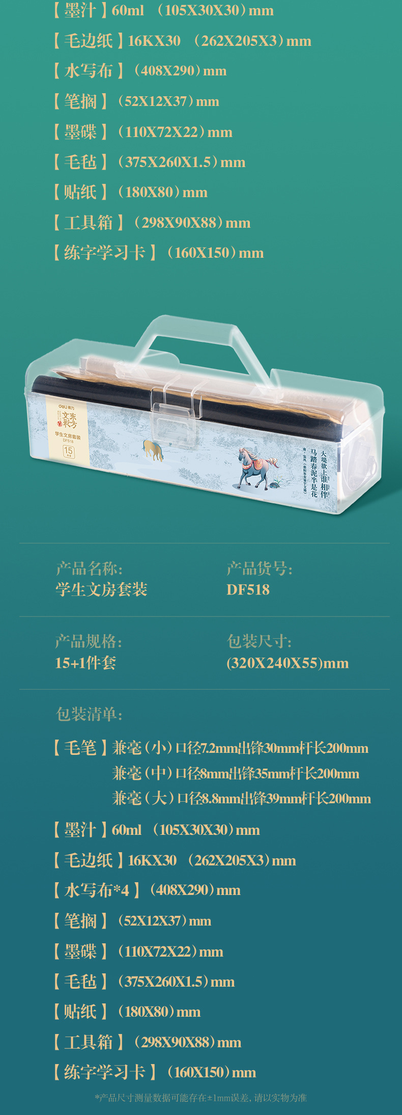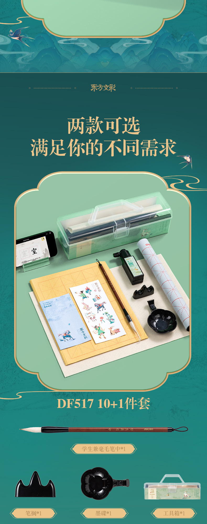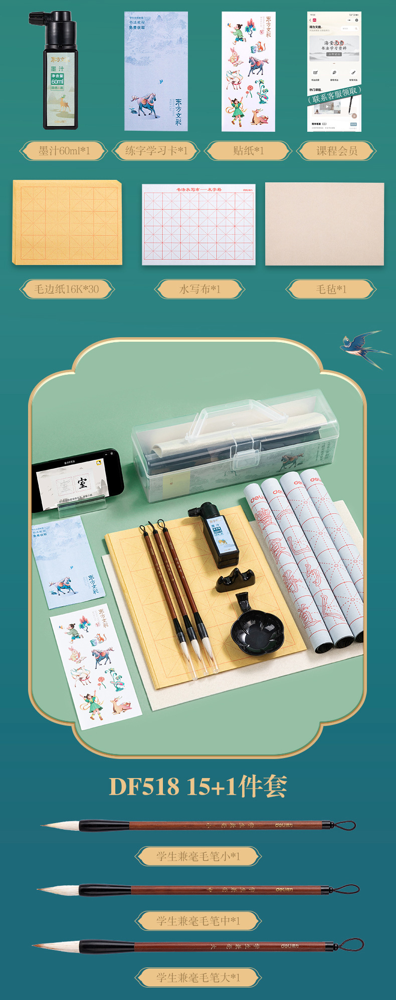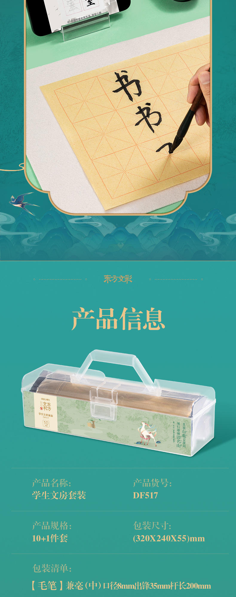 델리 DF517 동양 컬러 학생 연구 세트 서예 연습 펜, 잉크, 종이 및 잉크 스톤 휴대용 10 조각 세트스토어 가기