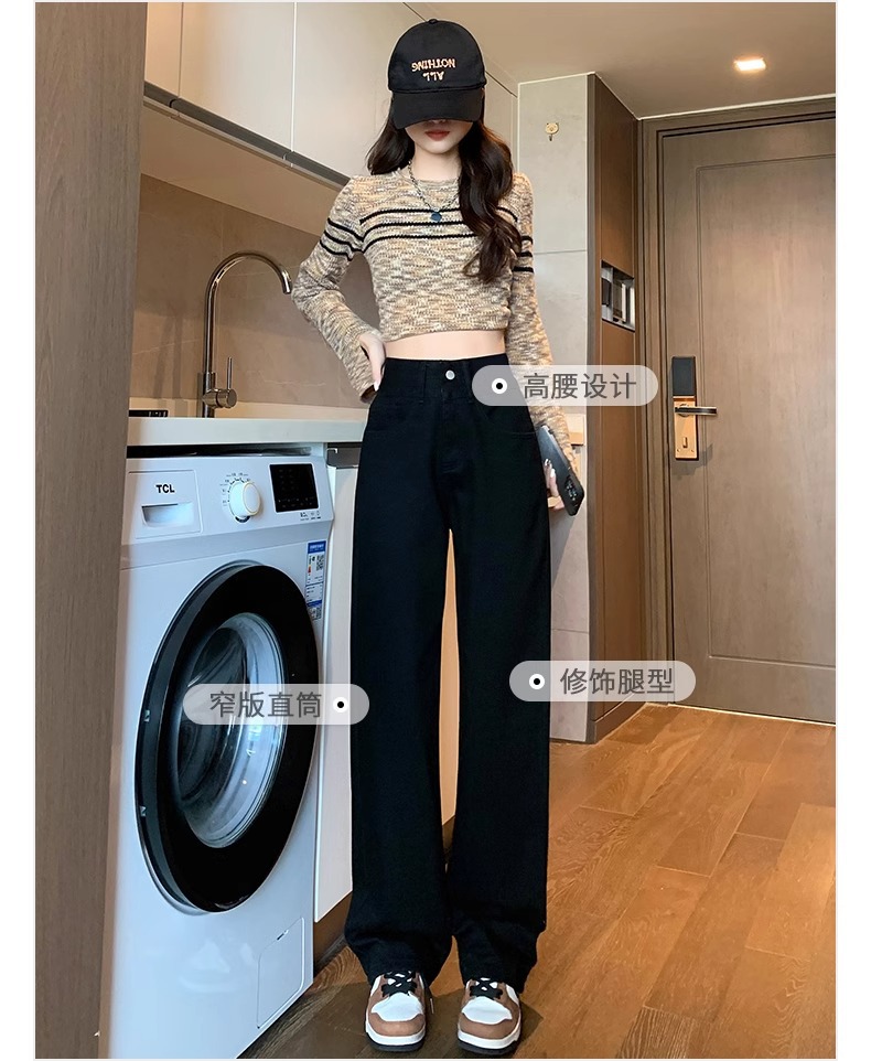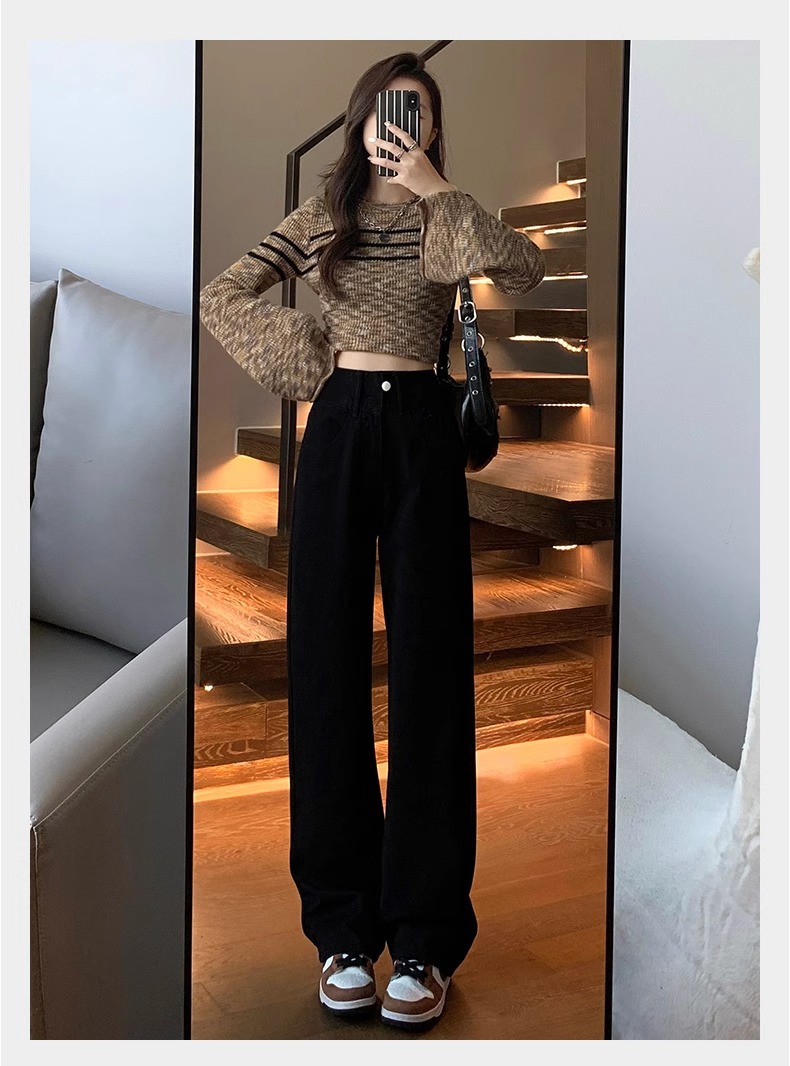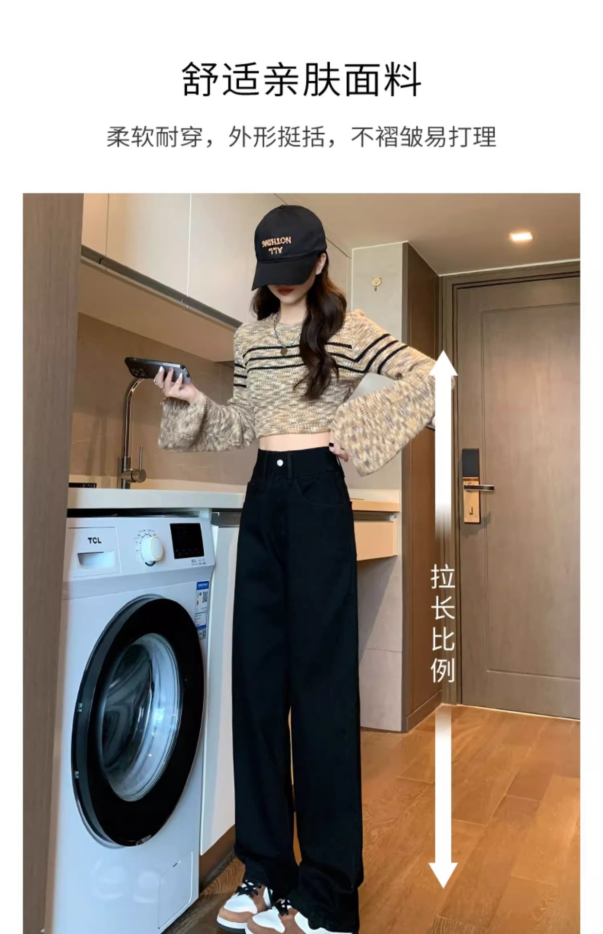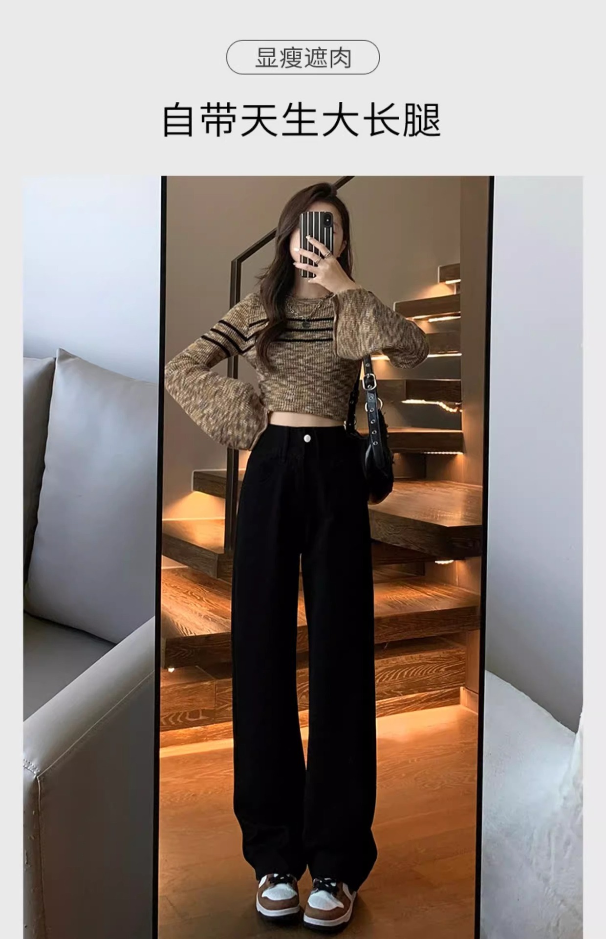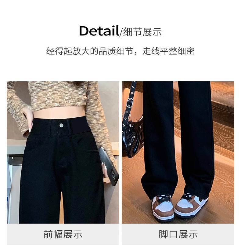 검은 기모 넓은 다리 청바지 여성의 2024 겨울 새로운 배 모양의 그림 스트레이트 바지스토어 가기