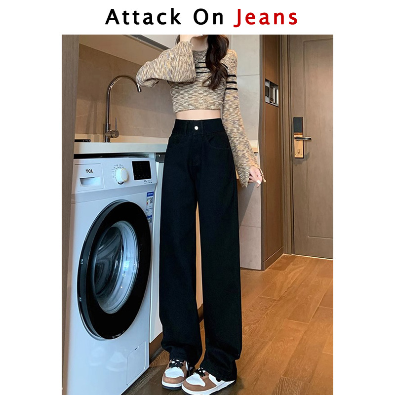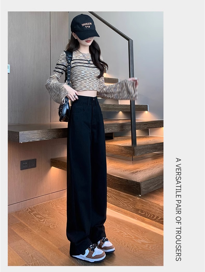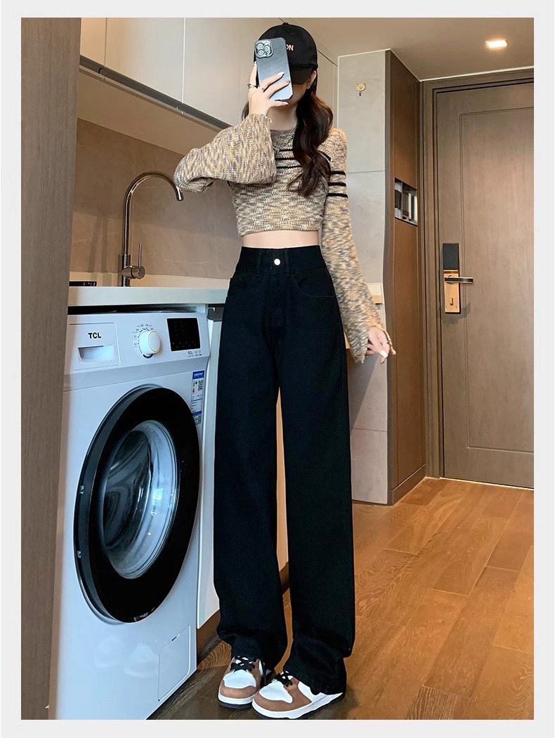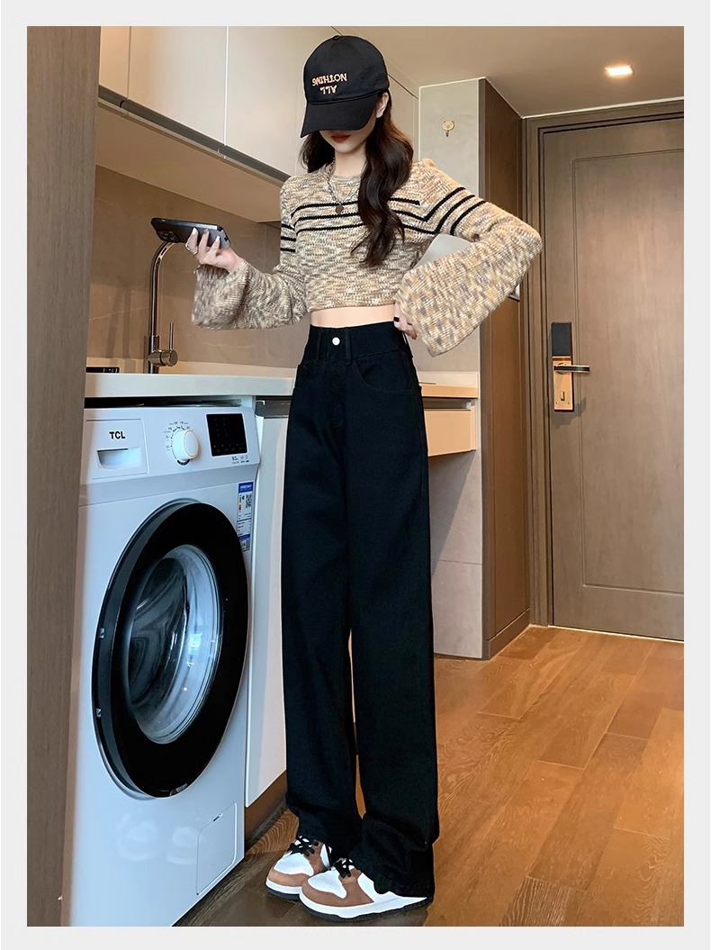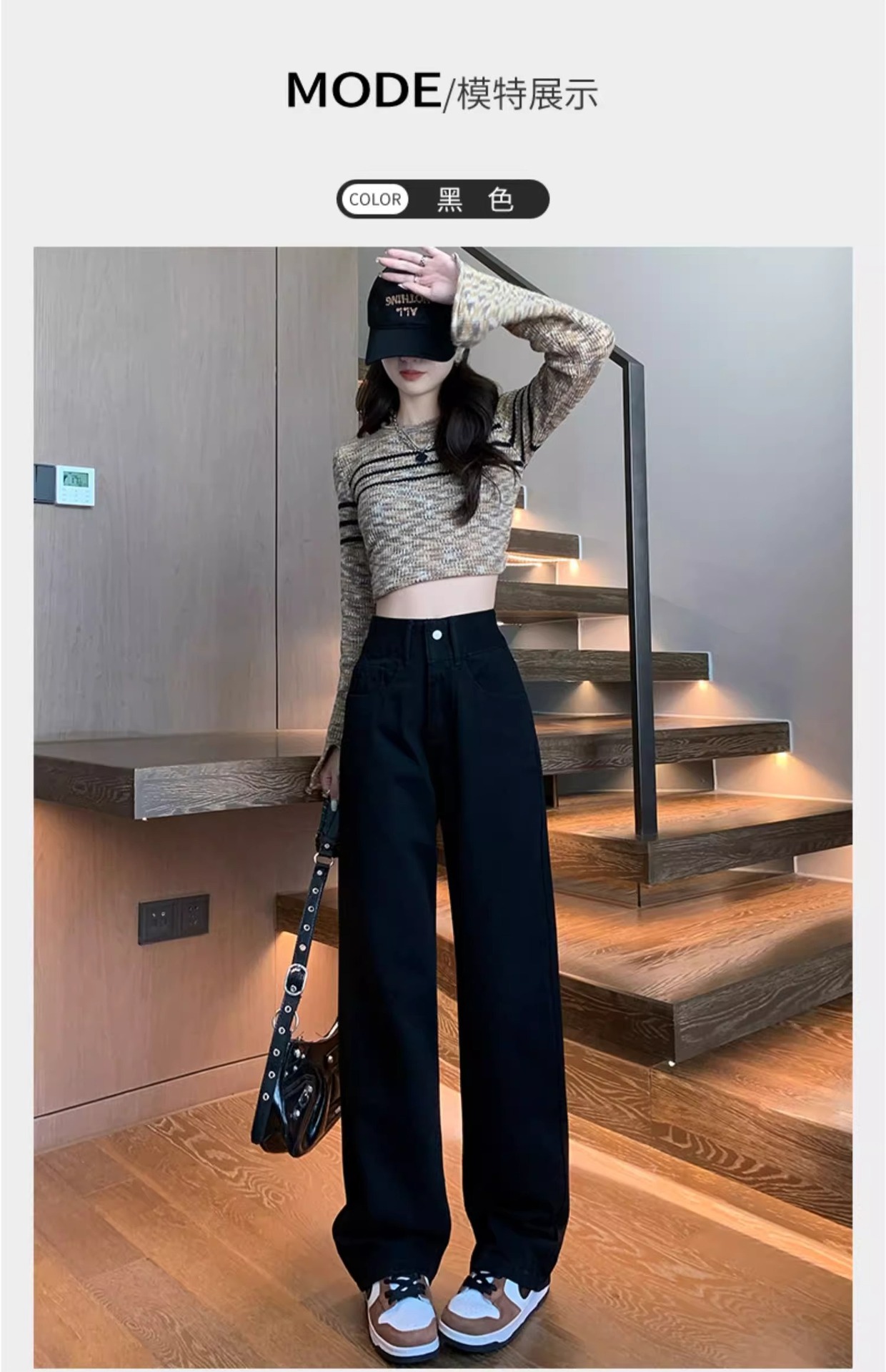 검은 기모 넓은 다리 청바지 여성의 2024 겨울 새로운 배 모양의 그림 스트레이트 바지스토어 가기