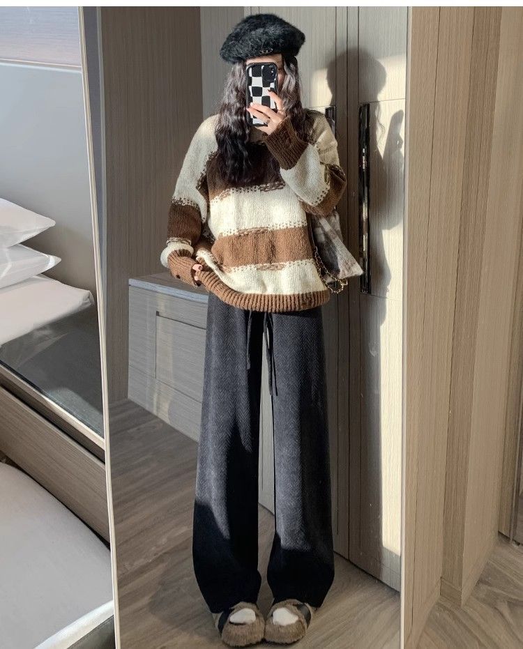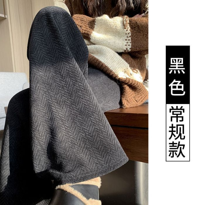 블루 체닐 와이드 레그 바지 여성 기모 높은 허리 가을과 겨울 침식 캐주얼 루즈 헤링본 우아한 스트레이트 바지스토어 가기