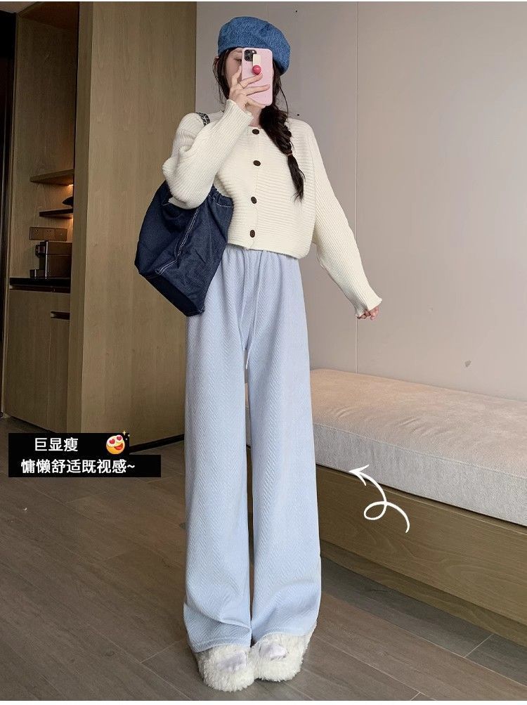 블루 체닐 와이드 레그 바지 여성 기모 높은 허리 가을과 겨울 침식 캐주얼 루즈 헤링본 우아한 스트레이트 바지