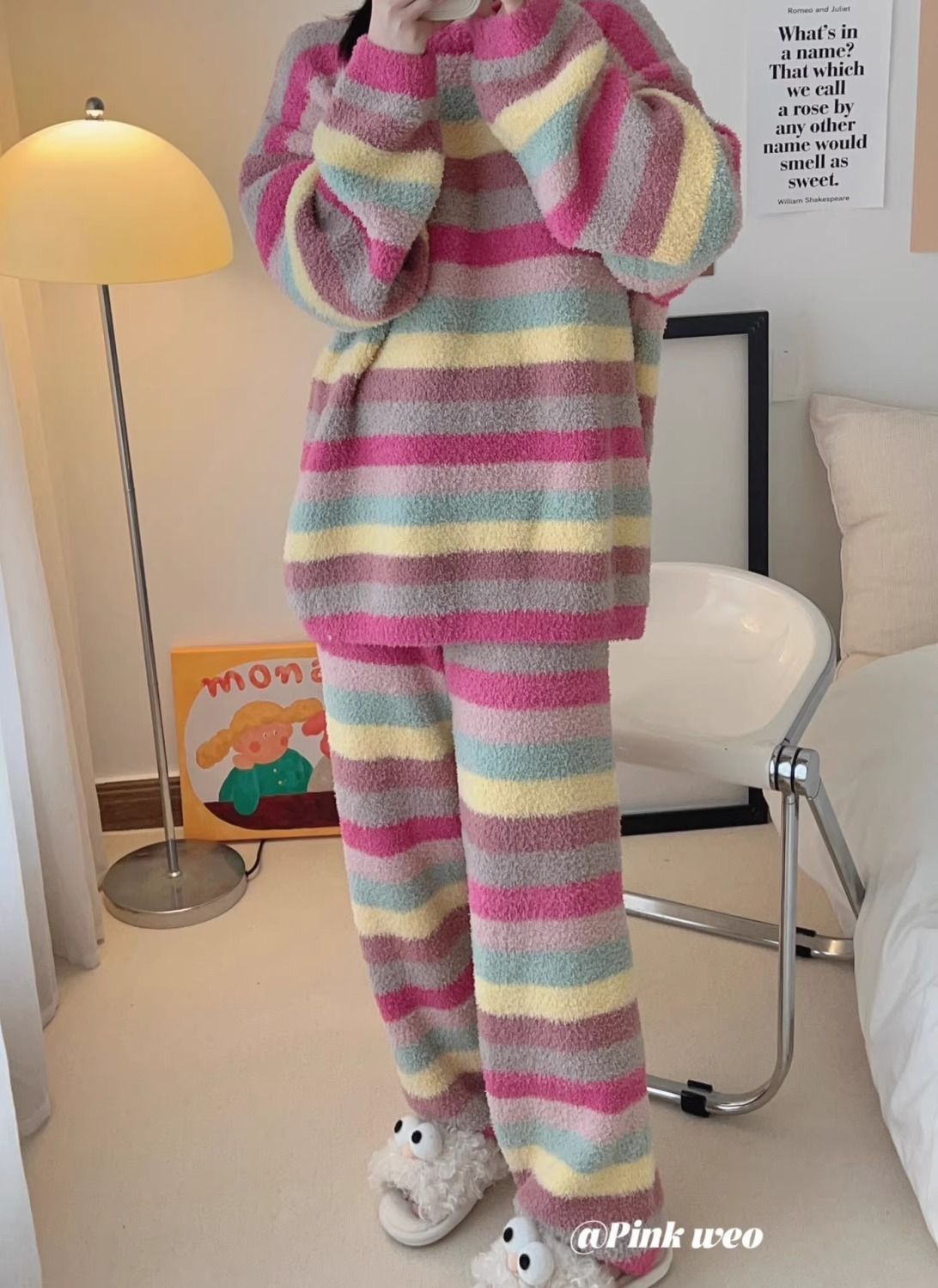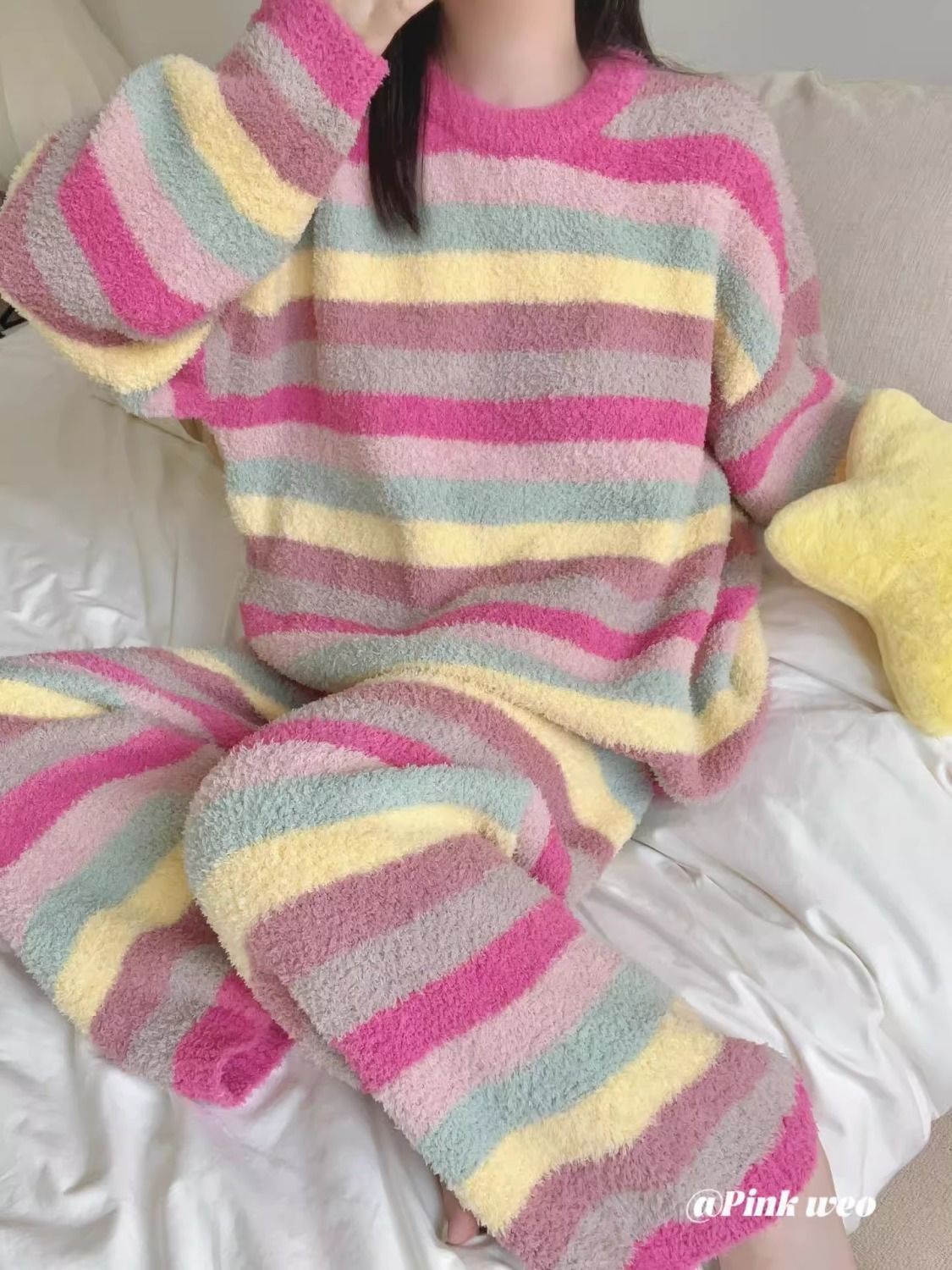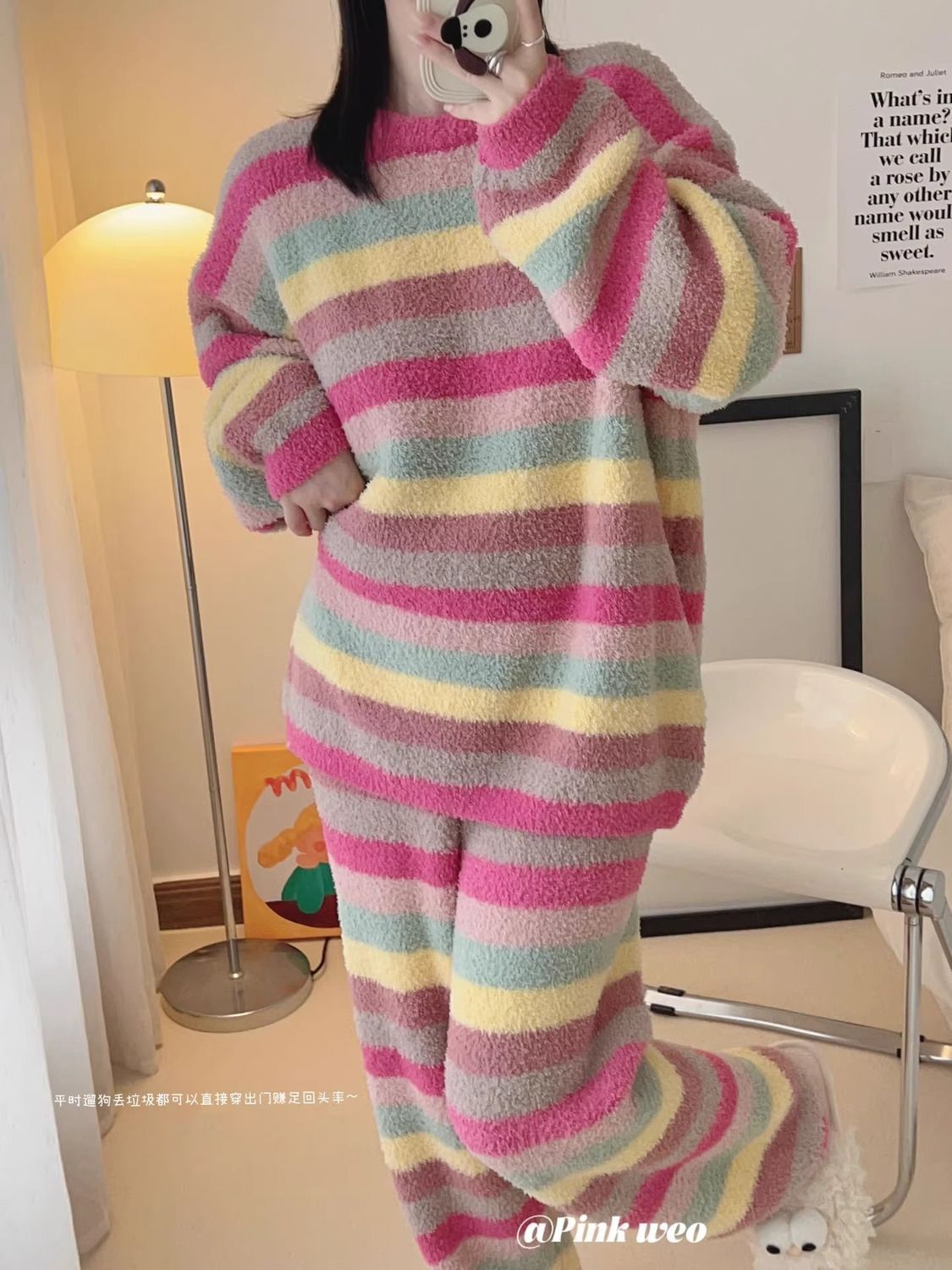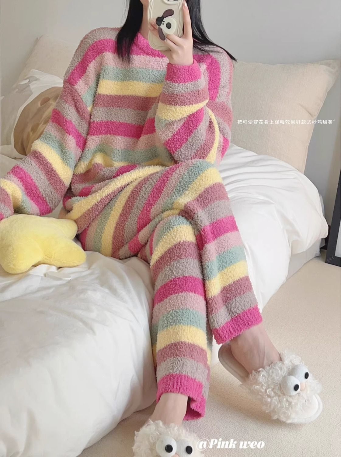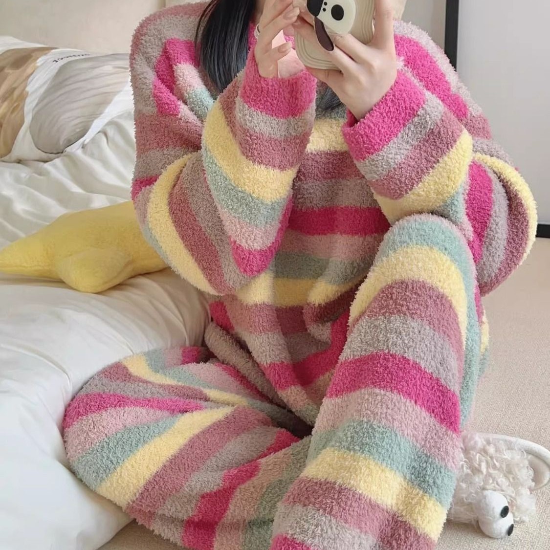 반 벨벳 겨울 잠옷 여성의 따뜻한 기모 두꺼운 귀여운 무지개 둥근 목 세트 홈 의류 제조 업체 도매