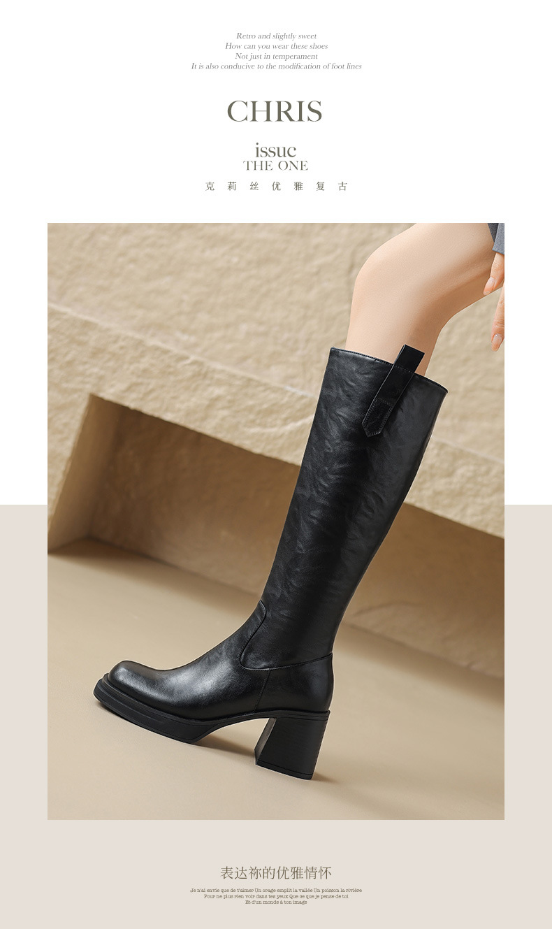 두꺼운 밑창 높은 부츠 여성 가죽 방수 플랫폼 청키 힐 무릎 길이 부츠 2024 새로운 겨울 작은 하이힐 나이트 부츠
