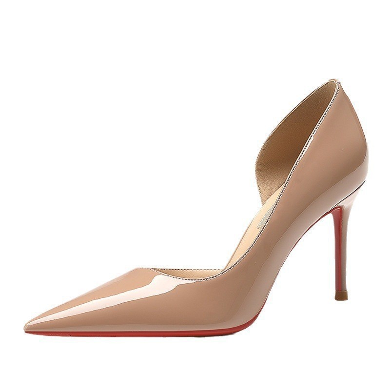 여성용 사이드컷 하이힐 2026 신상 인터넷 인기 패션 만능 섹시 누드 컬러 레드솔 포인티드 토 얕은 입구 래커 가죽 싱글 슈즈