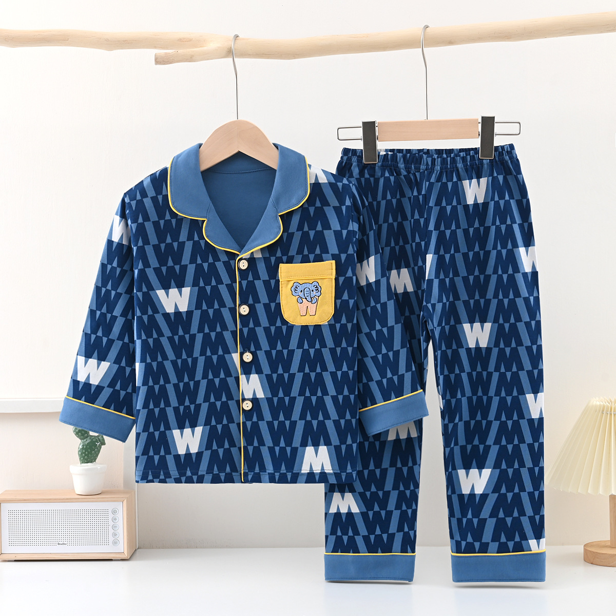 중대형 어린이 순면 잠옷 세트, 아동용 긴팔 홈웨어, 남아 여아 카툰 패턴 라펠 속옷