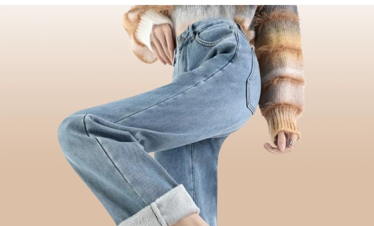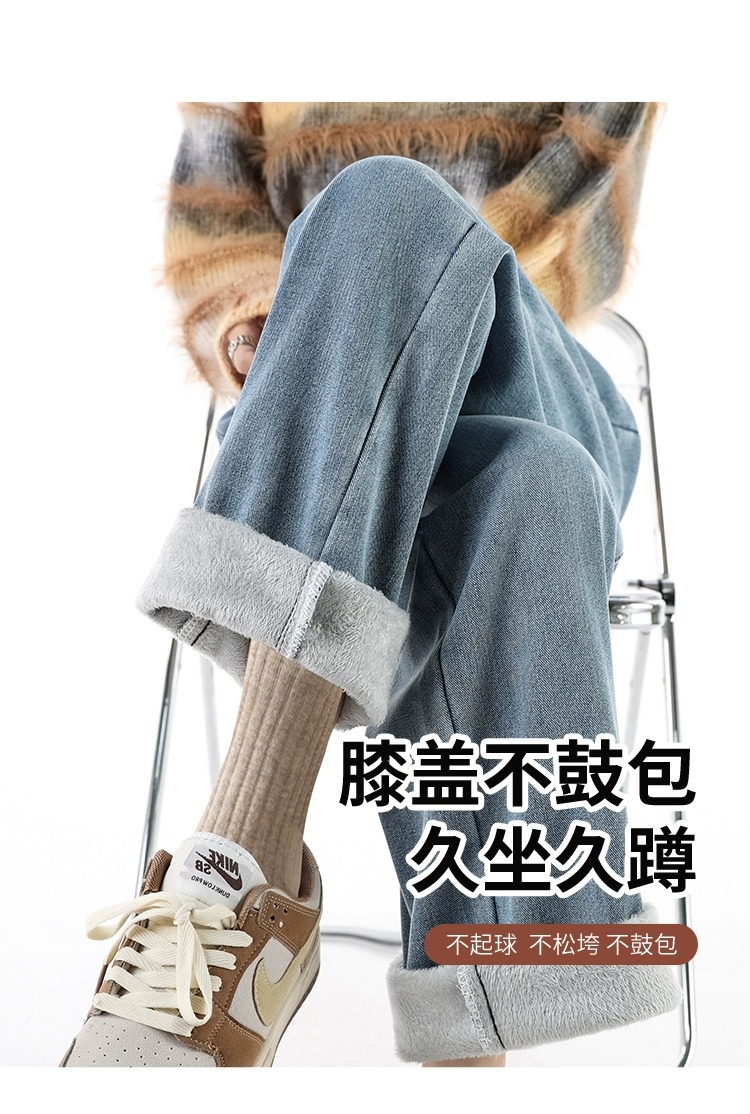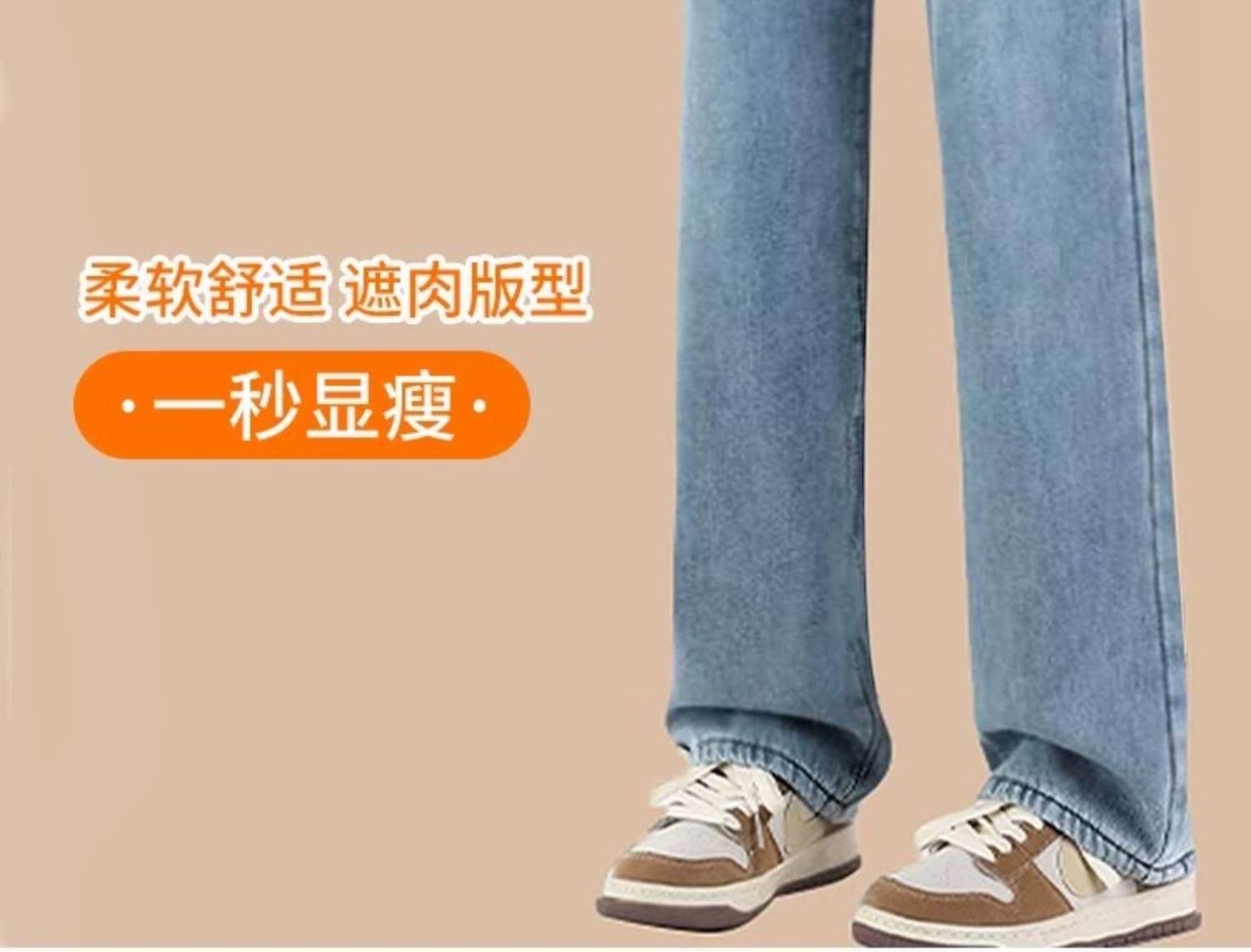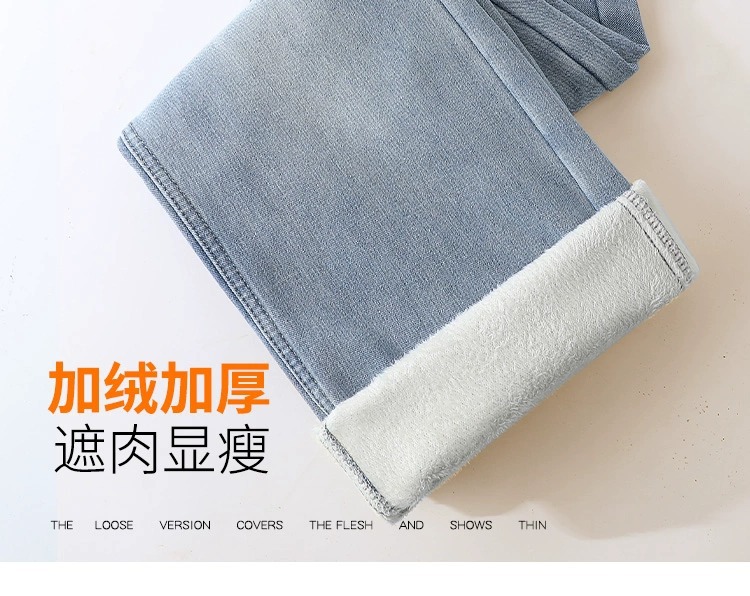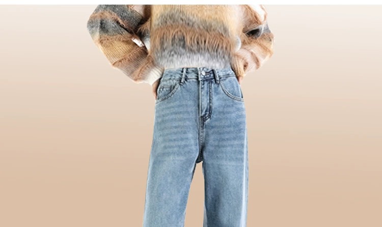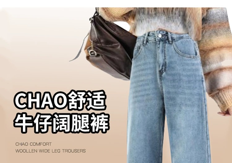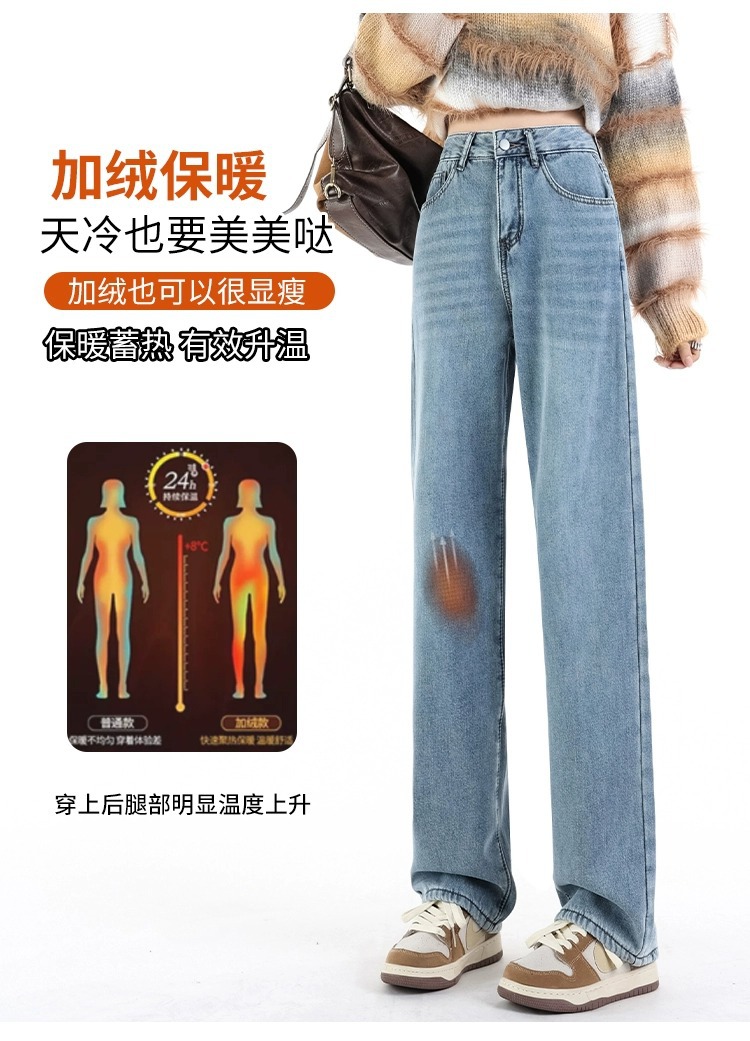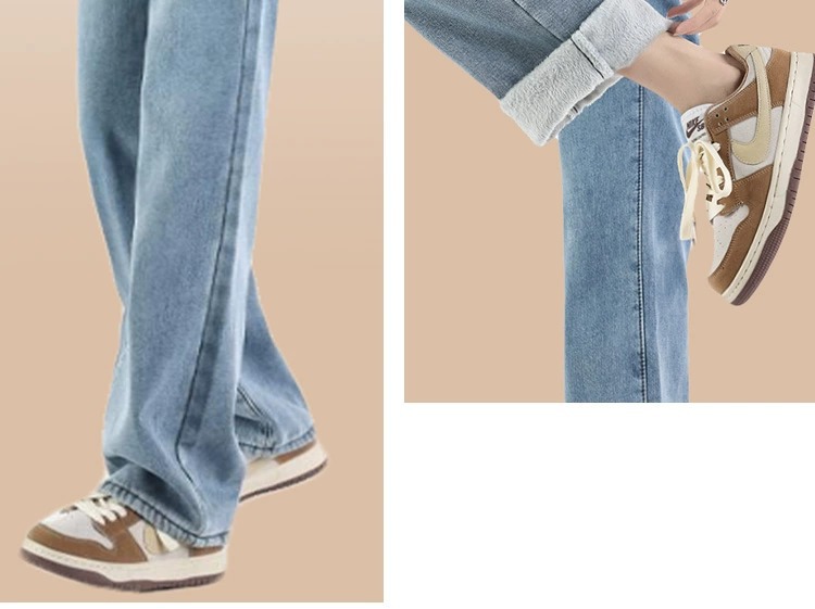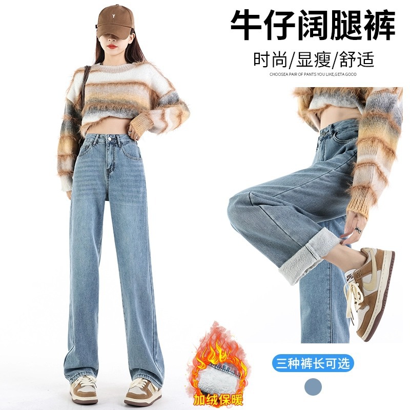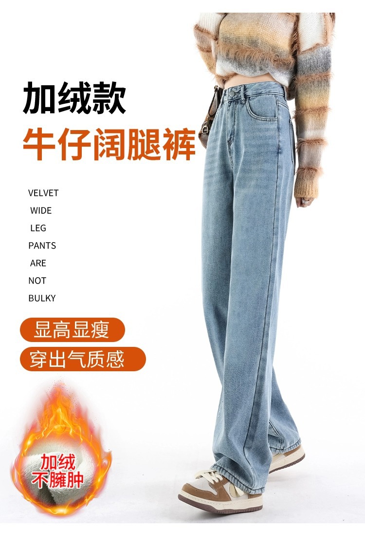 기모 두꺼운 와이드 레그 청바지 여성용 겨울 따뜻한 하이 웨이스트 루즈 핏 슬리밍 배 모양의 피겨 라이트 컬러 스트레이트 레그 청바지스토어 가기