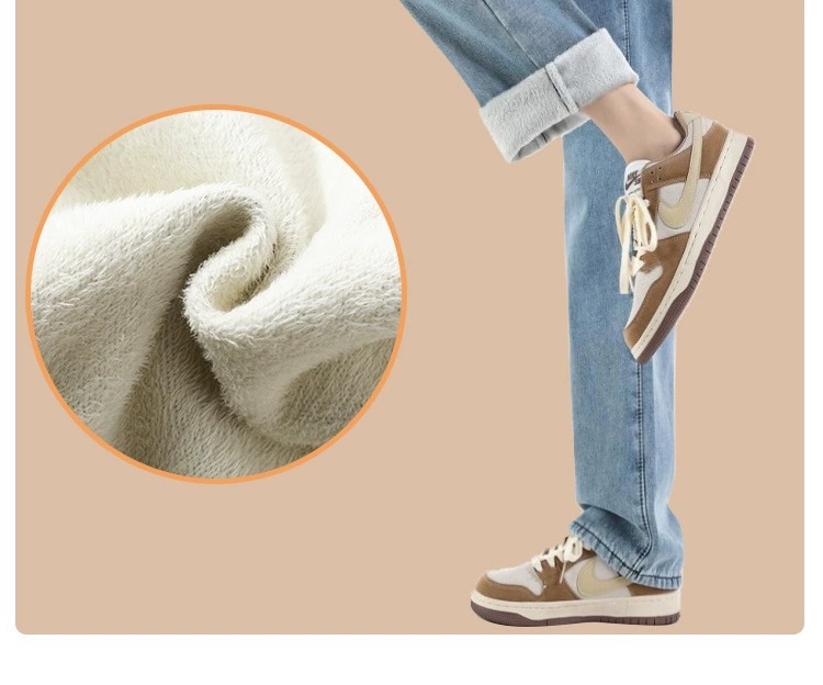 기모 두꺼운 와이드 레그 청바지 여성용 겨울 따뜻한 하이 웨이스트 루즈 핏 슬리밍 배 모양의 피겨 라이트 컬러 스트레이트 레그 청바지