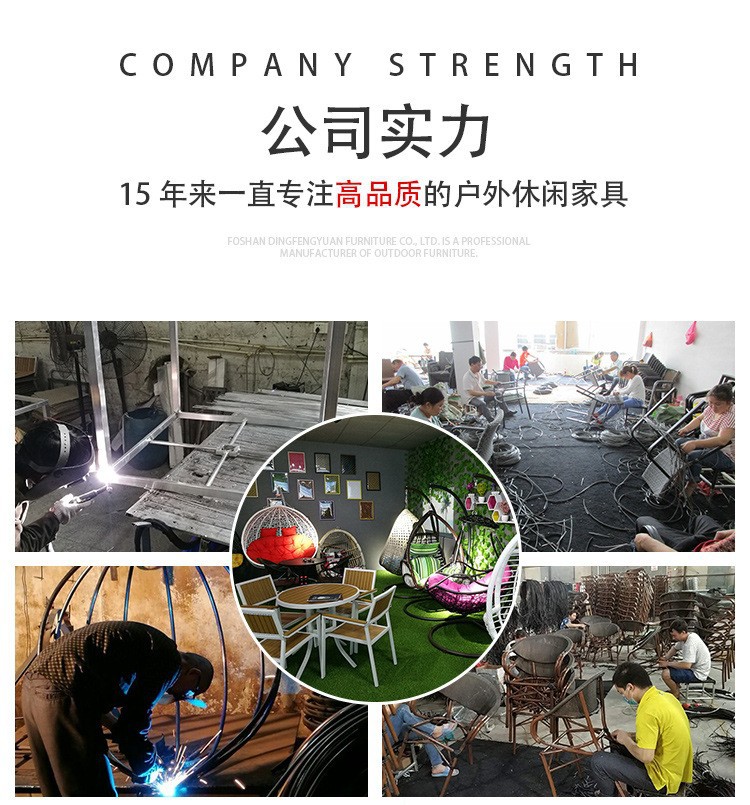 佛山市鼎丰源家具有限公司是一家专业生产销售户外家具的工厂,位于“世界家具之都”广东佛山。我司主要经营产品有:编藤沙发、桌椅,塑木桌椅、铸铝桌椅、公园椅、户外雨伞等各类家具。款款新颖,富有创意,物美价廉,具完美的构思,上乘的质量和精美的外观,能为你营造一个美观舒适并富有艺术感染的理想生活空间,给你带来摩登时代的超凡享受,给你带来富有诗意的绝美世界。 我们能够为客户提供专业的OEM.ODM服务,能够根据客户需求生产各种类型的户外家具,我司有多人的专业服务团队,为客户提供优质的服务!竭诚欢迎新老客户来电来图咨询,谢谢!