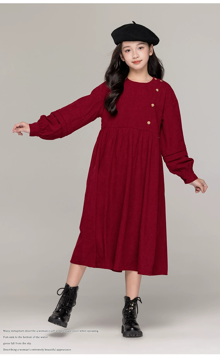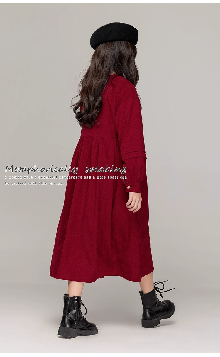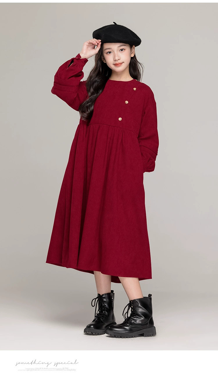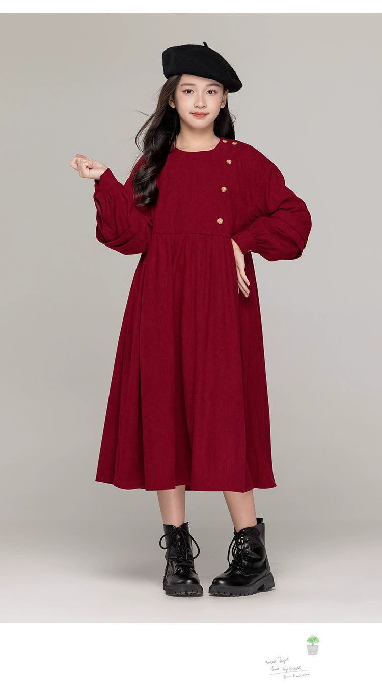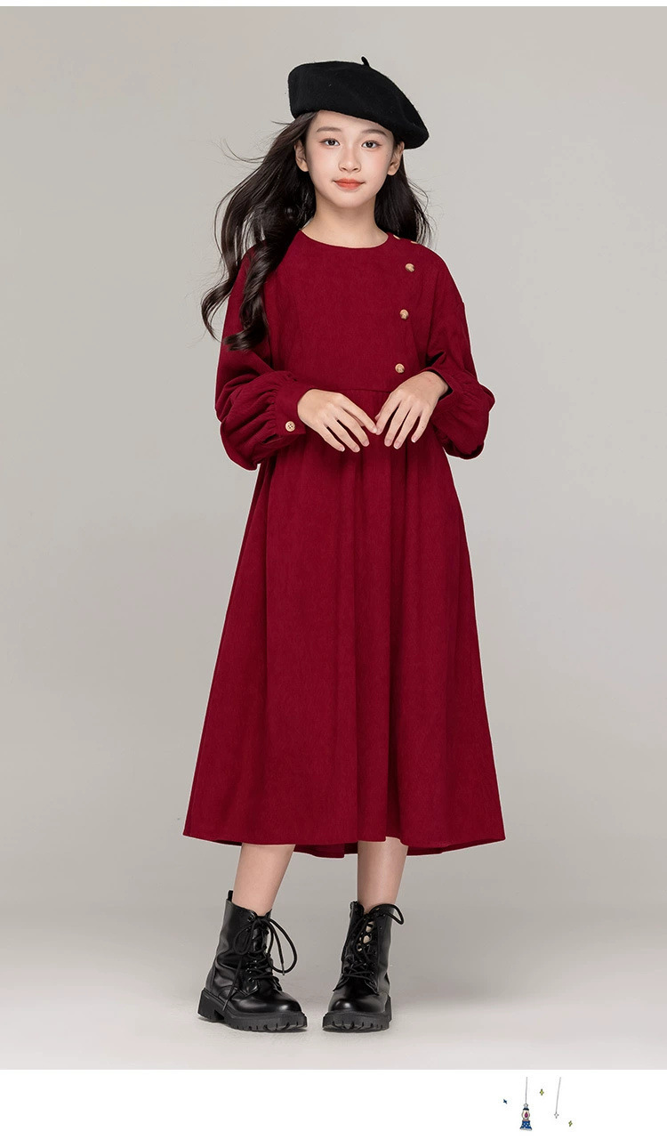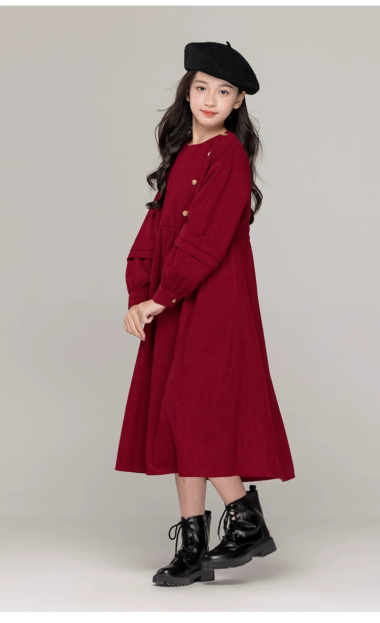 가을 겨울 새 기모 원피스 소녀 느슨한 중간 길이 원피스 큰 어린이 신년 옷 빨간 서양식 긴 원피스
