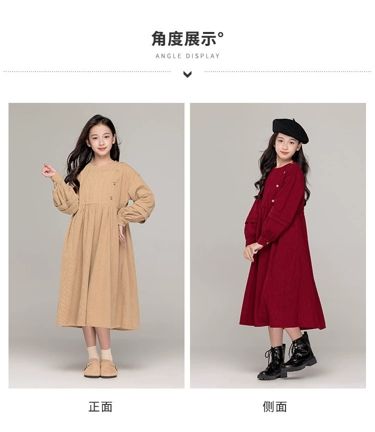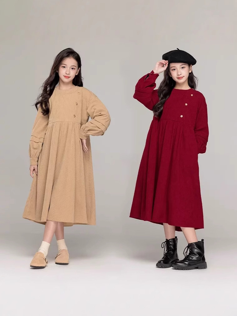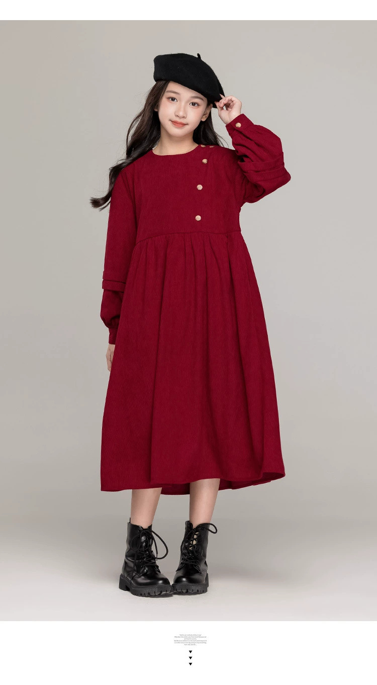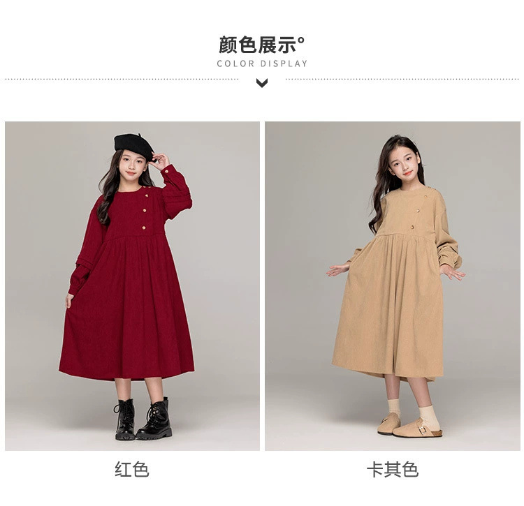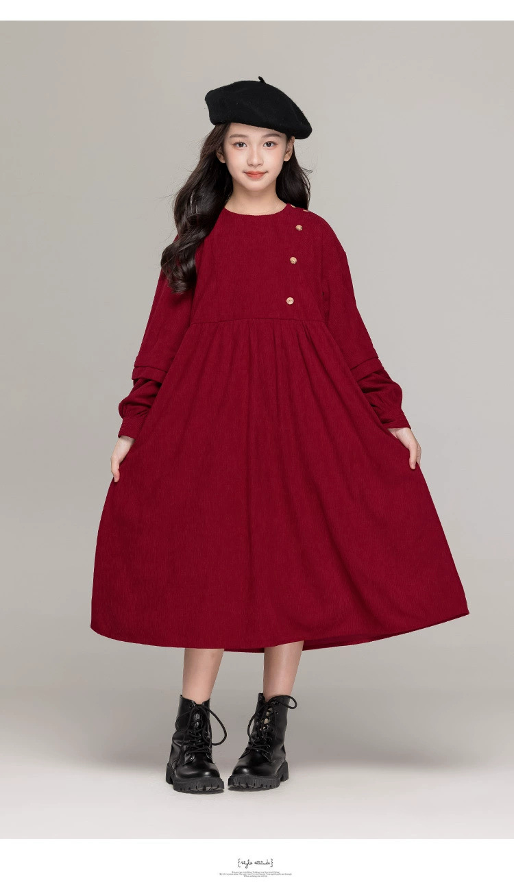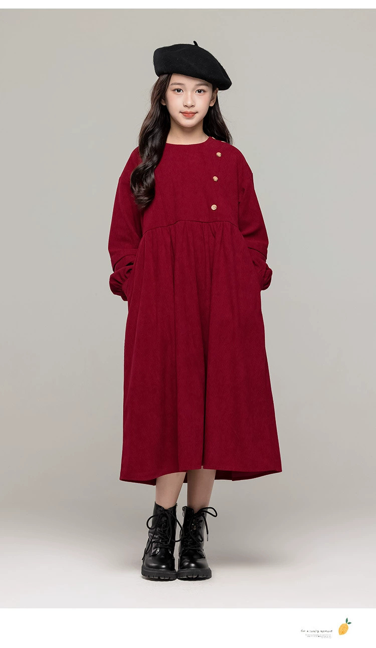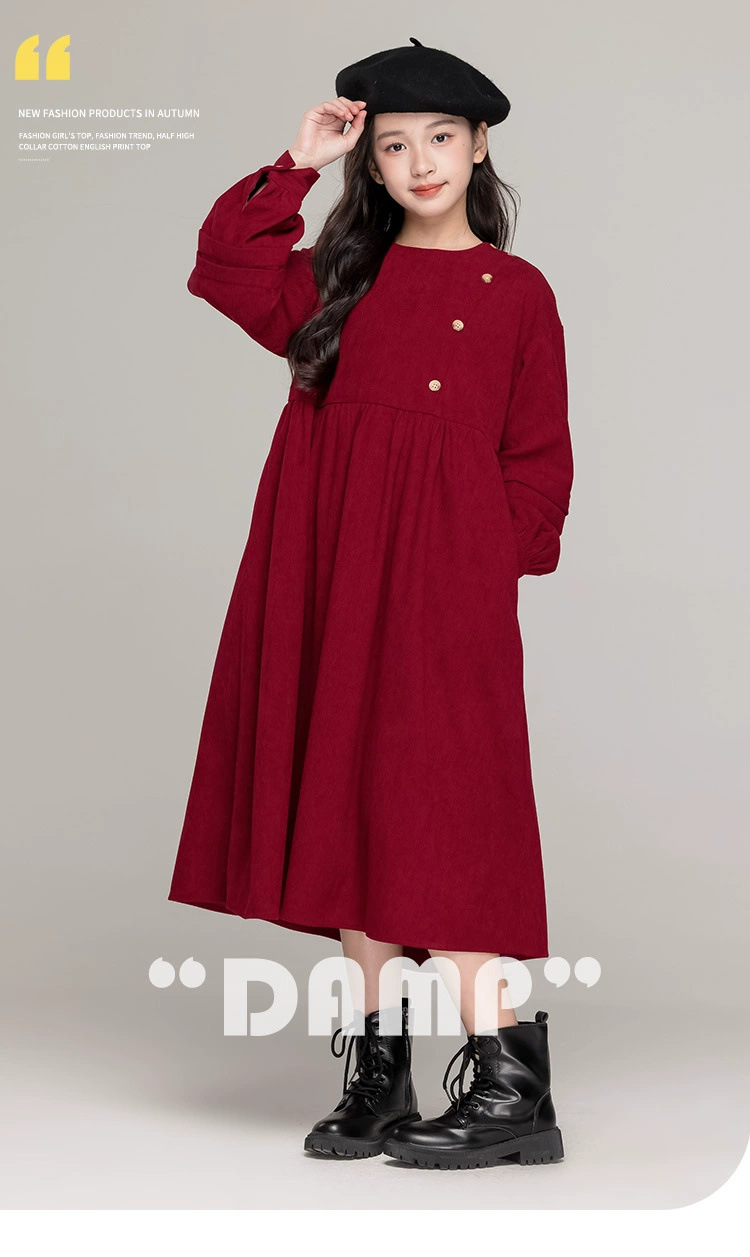 가을 겨울 새 기모 원피스 소녀 느슨한 중간 길이 원피스 큰 어린이 신년 옷 빨간 서양식 긴 원피스스토어 가기